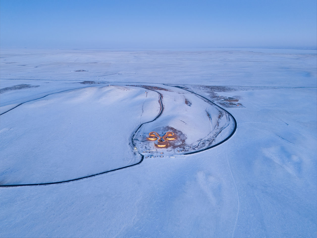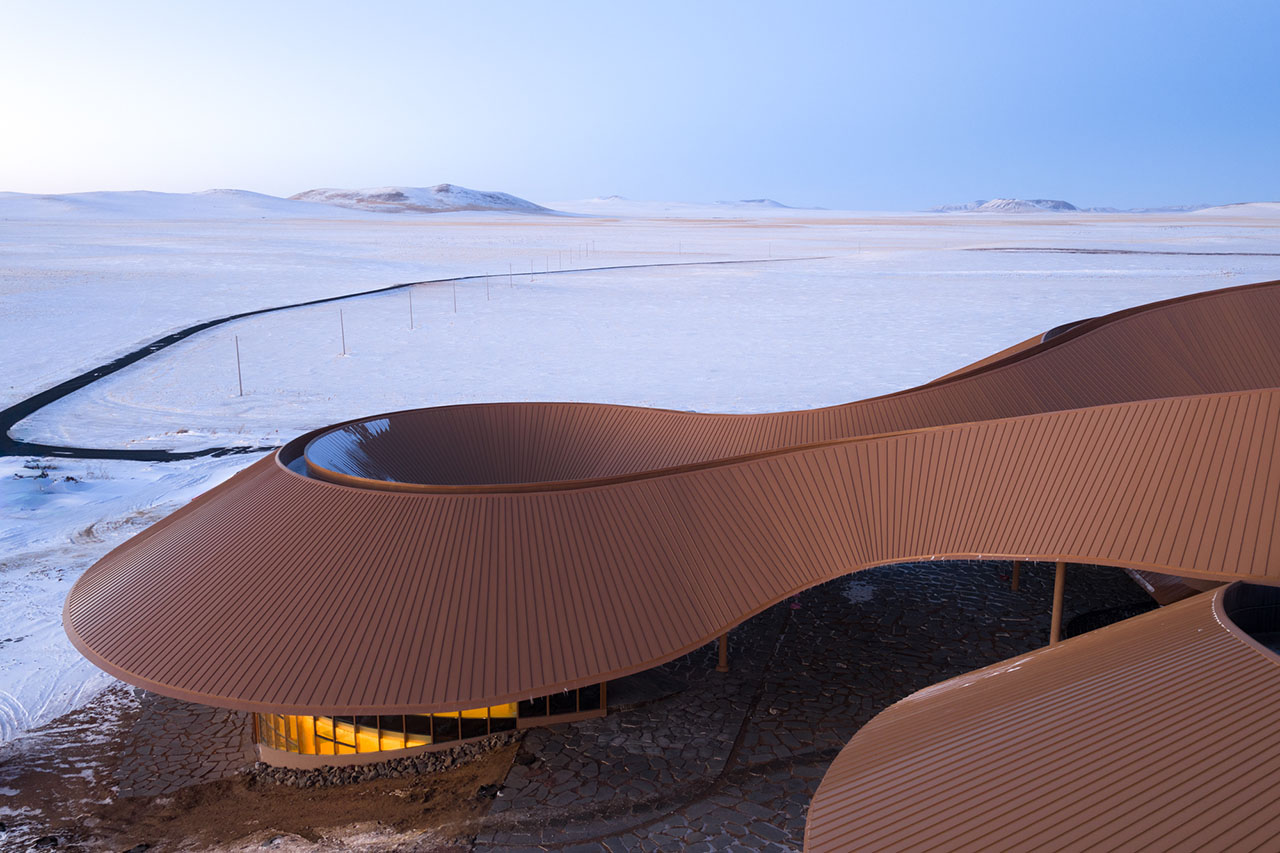 PLAT ASIA设计的白银库伦草原火山旅游度假区首期项目:火山里游客中心及火山里·到达者酒店已于2025年冬落成。从天安门所在的东经116°23′29″轴线向正北跨跃380公里到达北纬43°18′37″,即是火山里所在的C型火山,其喷发于距今约15万年的第四纪更新世,属于白银库伦草原火山群108座之一。