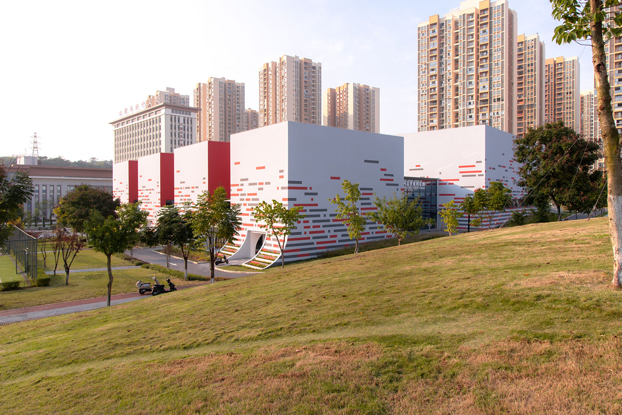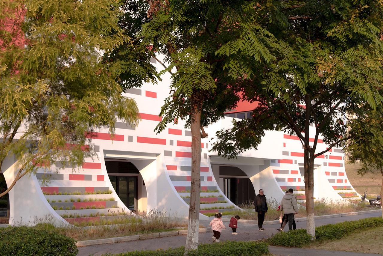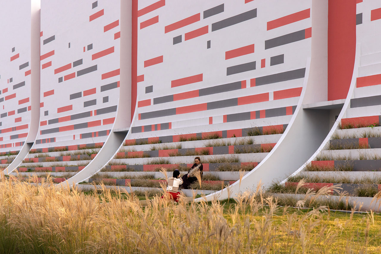建筑立面以白色为基底,将底部曲线部分打造为退台式花池,让真实的绿植如地毯般从公园蔓延至建筑之上,将“小草生长”的意象从比喻变为现实。立面装饰以红灰相间的横向线条,如年轮或刻度般记录着成长的节律,进一步强化了水平方向连绵向上、持续进步的趋势感。