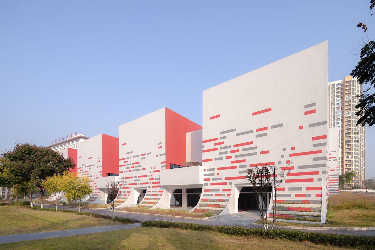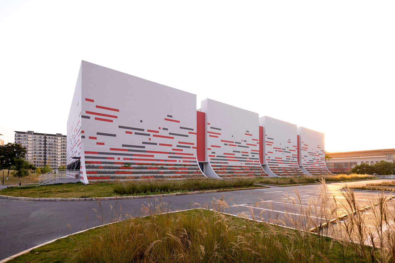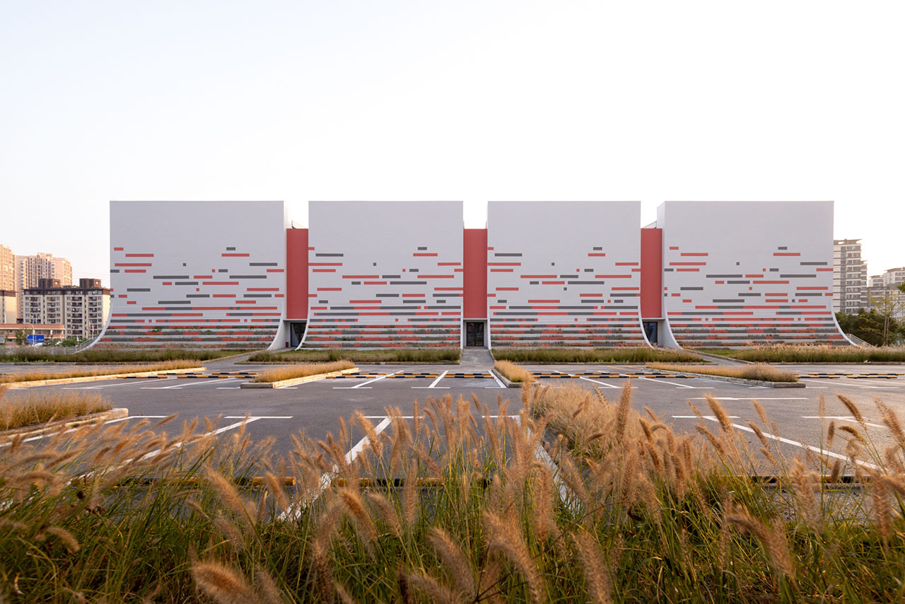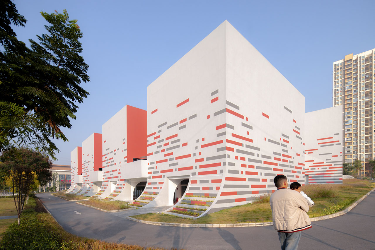 建筑立面以白色为基底,将底部曲线部分打造为退台式花池,让真实的绿植如地毯般从公园蔓延至建筑之上,将“小草生长”的意象从比喻变为现实。立面装饰以红灰相间的横向线条,如年轮或刻度般记录着成长的节律,进一步强化了水平方向连绵向上、持续进步的趋势感。