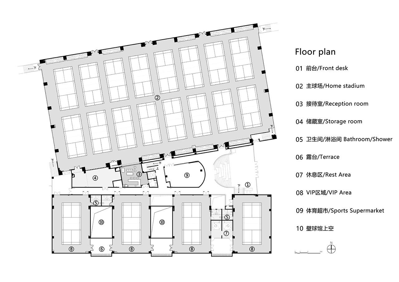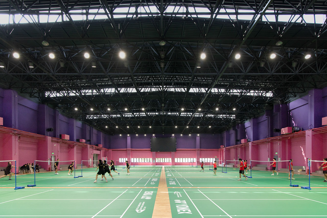 空间分为南北两大板块,南侧置入4个VIP球馆及配套休闲露台;北侧容纳16片标准场地的大场馆。设计充分利用高差,在中心及南侧增设夹层,将乒乓球、健身房、壁球、咖啡厅、更衣淋浴等配套服务功能精巧收纳,实现流线清晰、紧凑高效的功能整合。