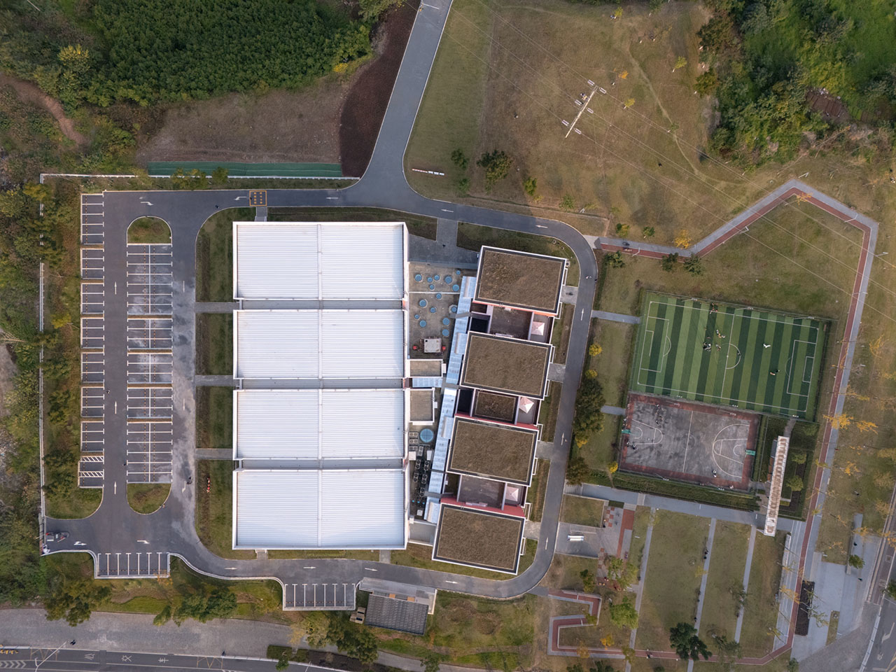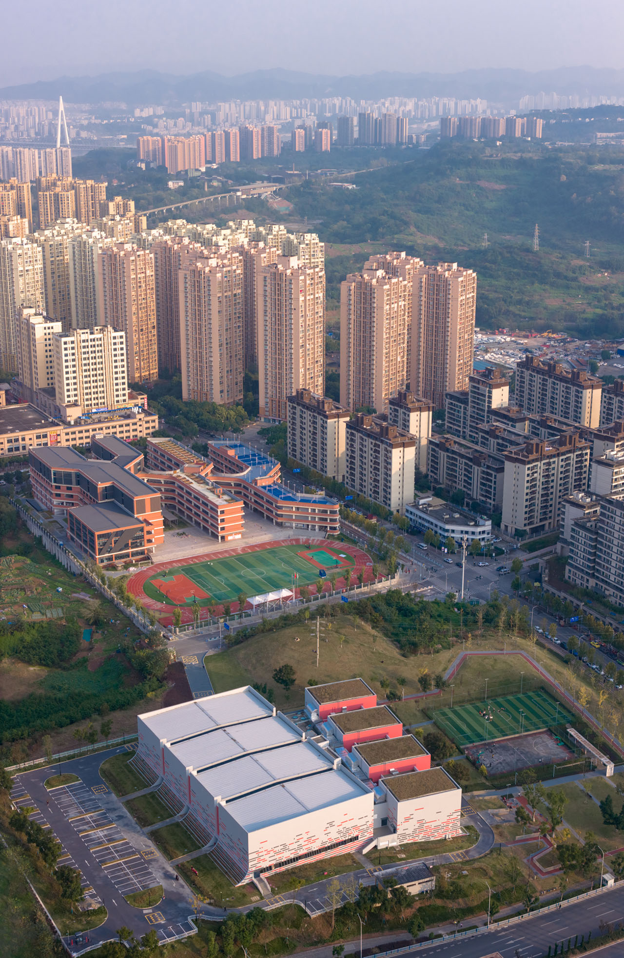 项目选址于大渡口区一处体育公园内,周边环绕着成熟社区、医院及李雪芮羽毛球学校。场地北高南低,南侧平接公园户外运动场,北侧平接非建设用地。设计巧妙衔接公园景观与城市界面,旨在打造一个兼具专业性与开放性的公共运动空间,让冠军的影响力惠及每一位市民。