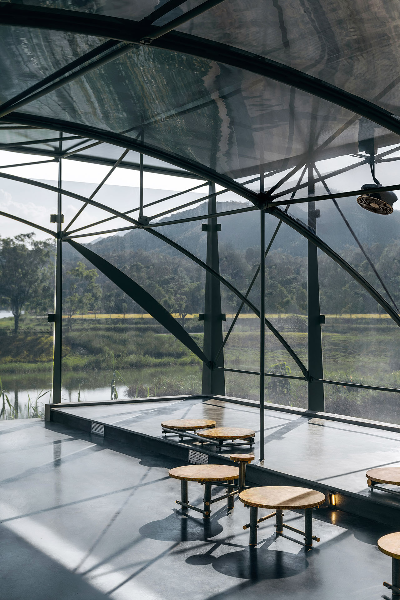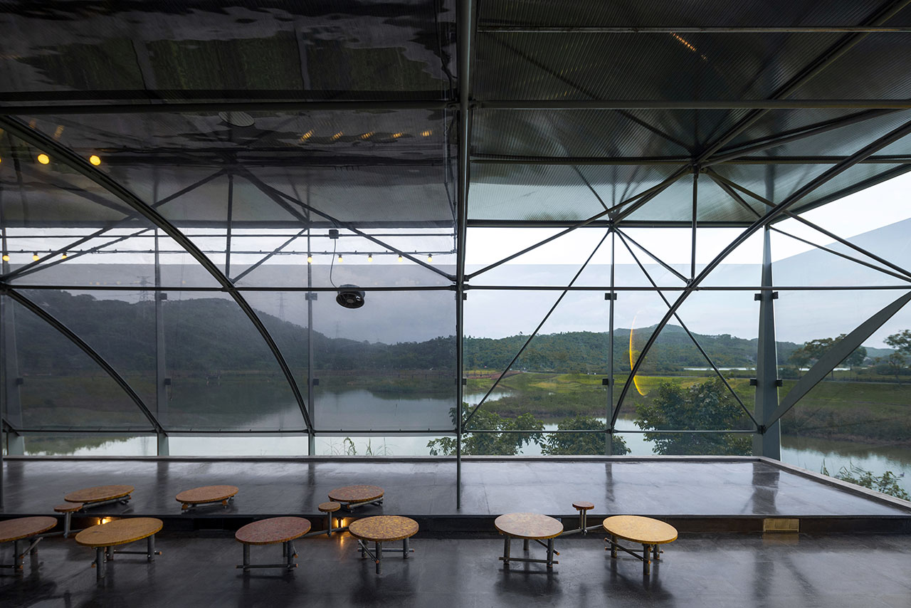 为将远方水库的景色纳入视野,同时释放出地面的空间,建筑由原花房的一层增至两层,二层混凝土楼板如同抬起的地面,又如同漂浮的“舟”。受到在枯水季把船架高于水面的临时结构的启发,底层采用相对细密的乱钢柱,营造出一种看似无序的支撑状态,水电管线隐藏于局部A形柱中。中间层的浅V字形混凝土楼板,在视觉上强化了船体结构,并与轻盈的上层形成鲜明对比。屋架上翻策略,不仅优化了横向抗侧力,更在形态上强化了“船坞”的意象。