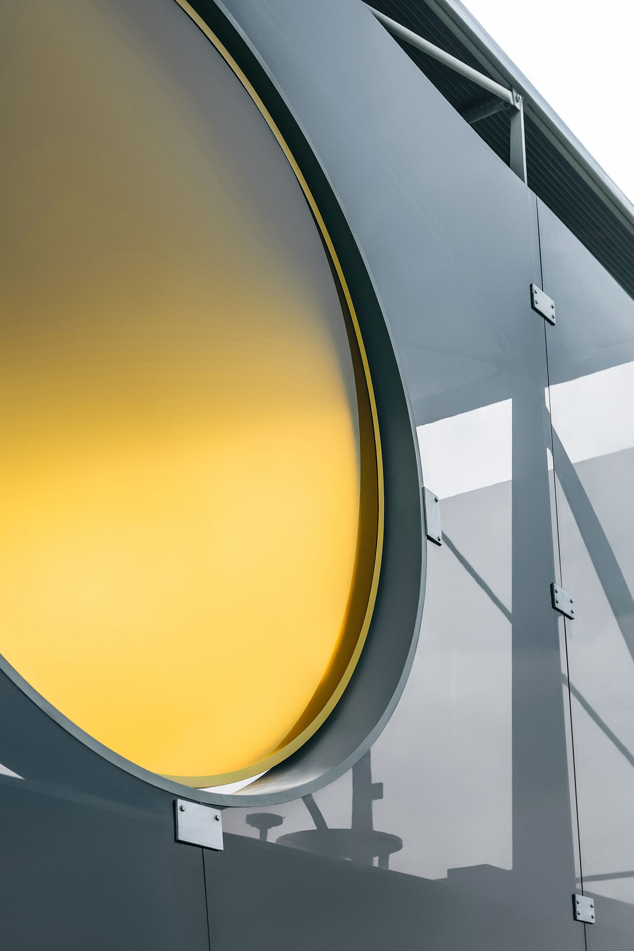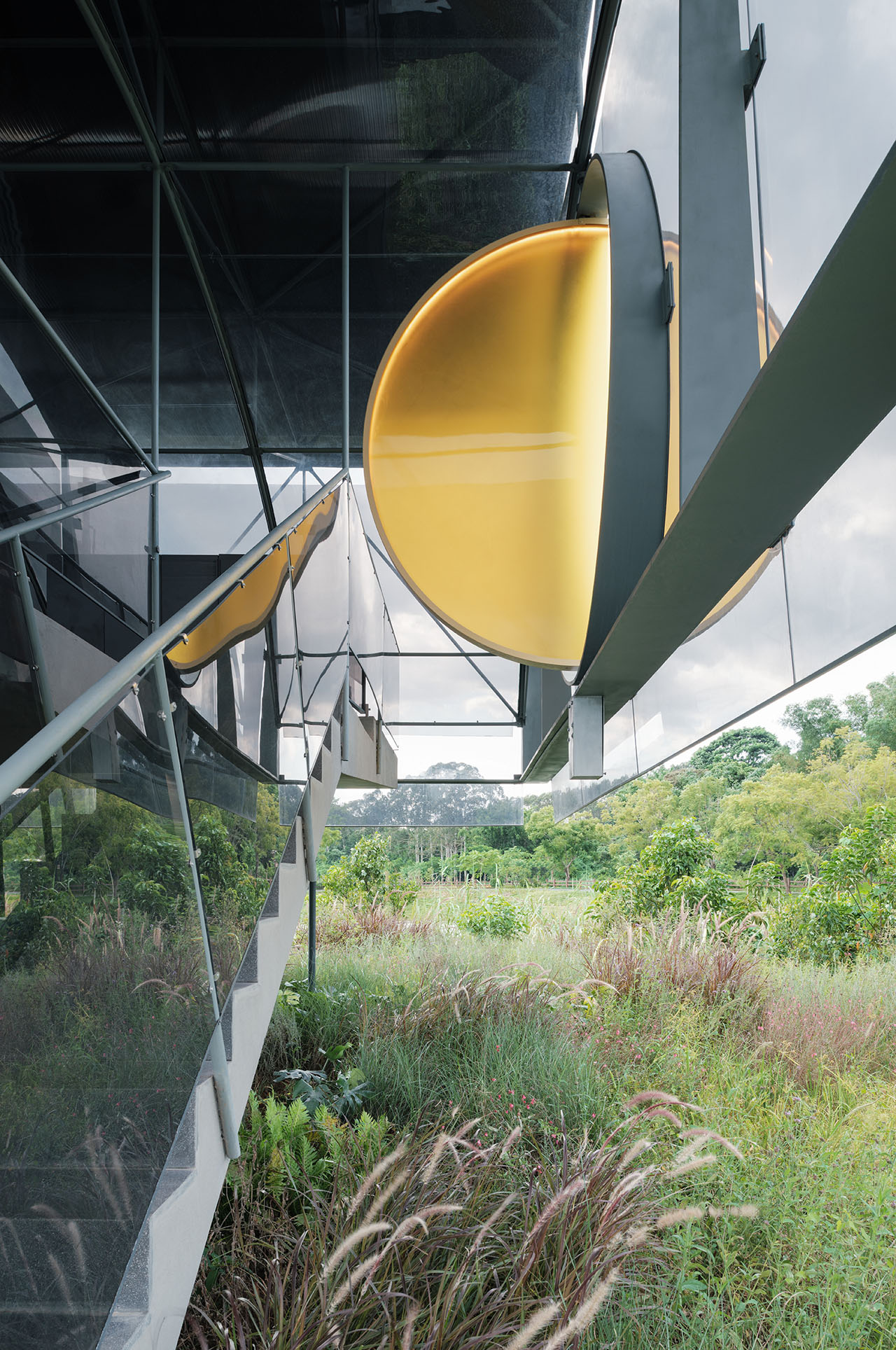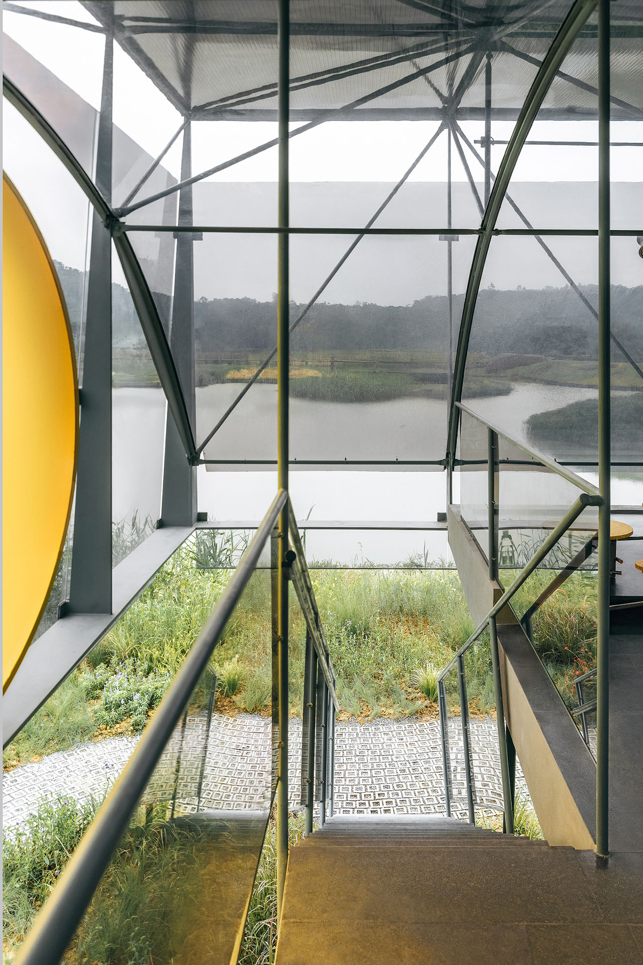 为延续原花房的氛围并呼应农业景观,建筑外覆深色耐力板,远观犹如一副墨镜。这种深色外观在白天衬托出月的明亮,而内部则呈现出高透的状态,使复杂的结构层次清晰可辨。不同层级的钢构件由不同颜色区分,进一步强化了视觉层次,辅助了整体的透明性表达。