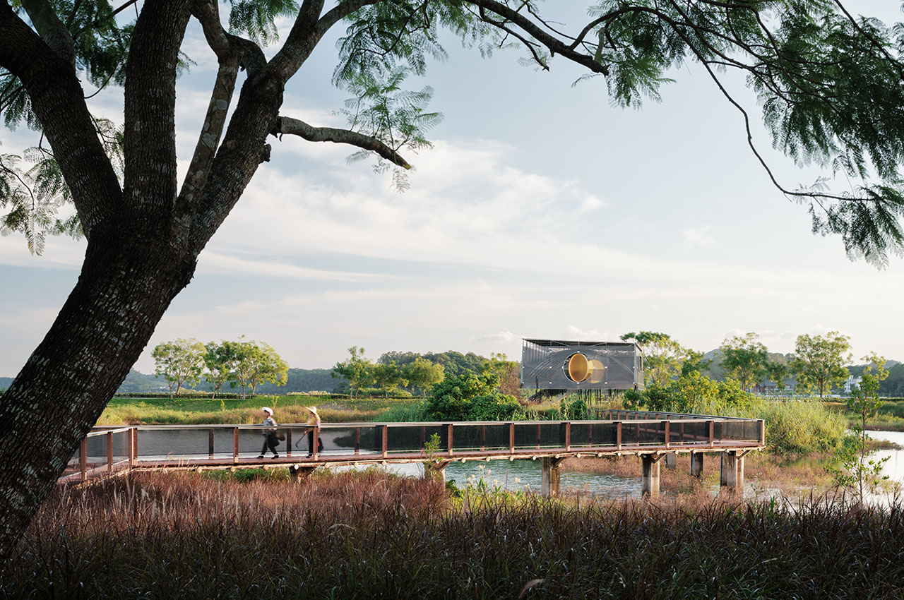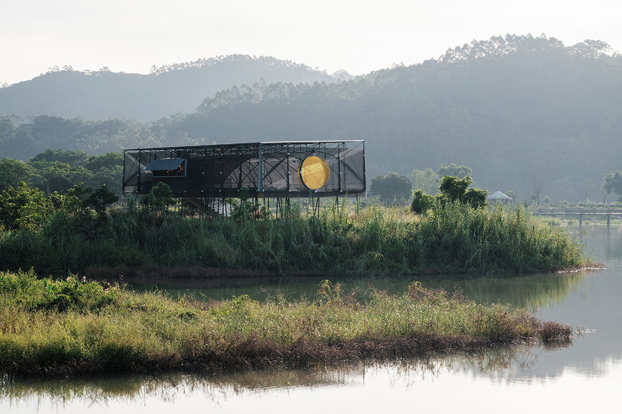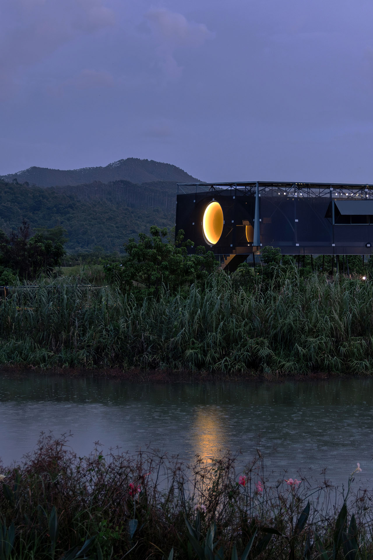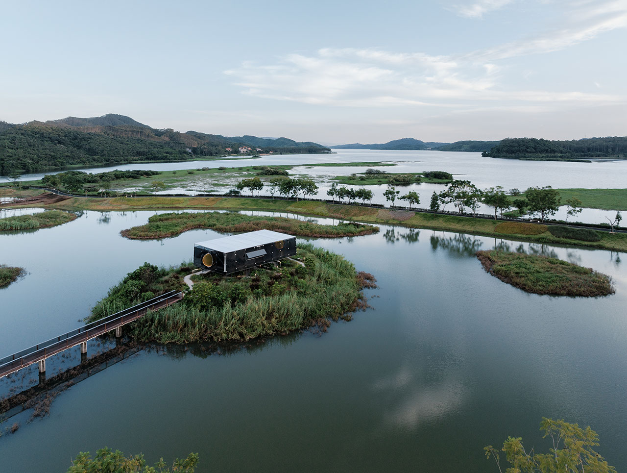 “月”的概念源于对“饮酒作诗”场景的追索。在设计中,它不仅是立面上一个可机械转动的具象装置,更成为串联不同感知尺度的空间媒介。远望时,人造月轮与真月在水面之上彼此映照;沿塘缓行,建筑整体勾勒出水上月初升的轮廓;步入内部,它又转化为一个可与身体互动的平面符号。