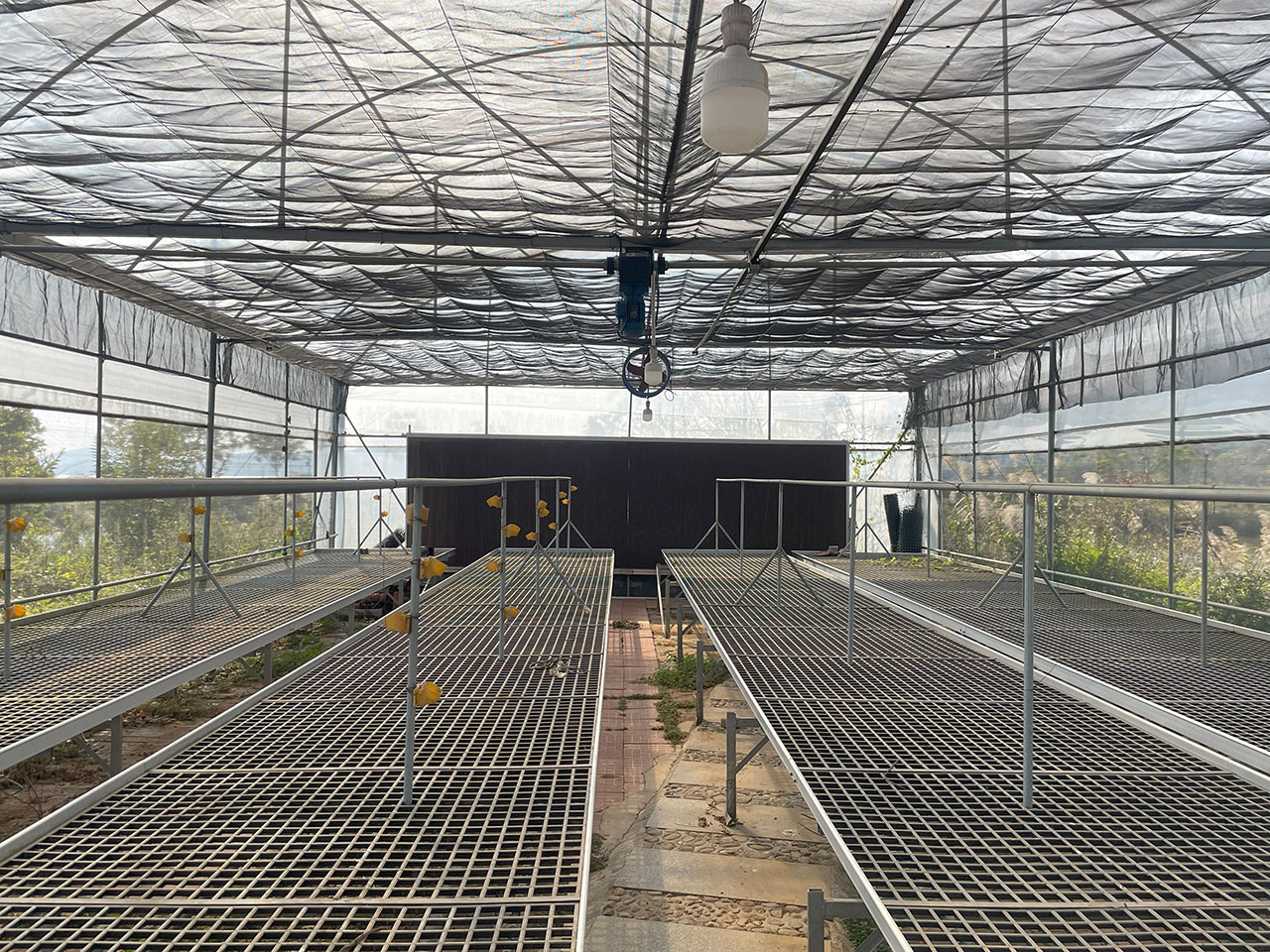 项目的重要出发点,在于保留原花房的结构质量、空间语言与材料效果。原花房由铰接节点构成的轻巧结构,呈现出鲜明的临时性与农用建筑特征;其层叠的空间构造——顶层平整、中层起拱,分别覆以阳光板与遮阳黑纱——则塑造出独特的半透明感。基于此理念,新建的二层结构延续了原有构件的尺寸与节点衔接方式。