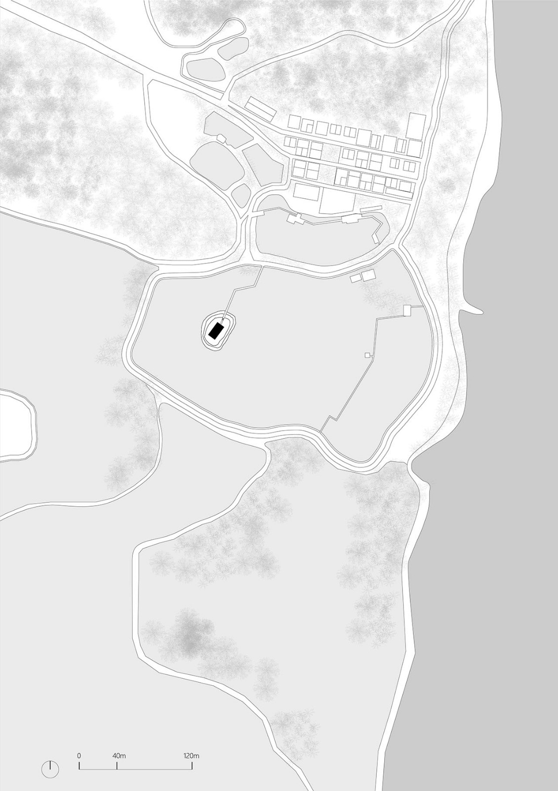 “明月坞”是一个“命题作文”。项目以“花坞樽前微笑”为题,却并非对诗意进行直接转译,而是以岛上原有的一座废弃花房为物质起点,开启了一场关于结构、空间与意象的深度对话。通过对“水、月、花、舟”等母题的抽象与重组,最终营造出一个整体的、特殊的、非日常的体验场所。