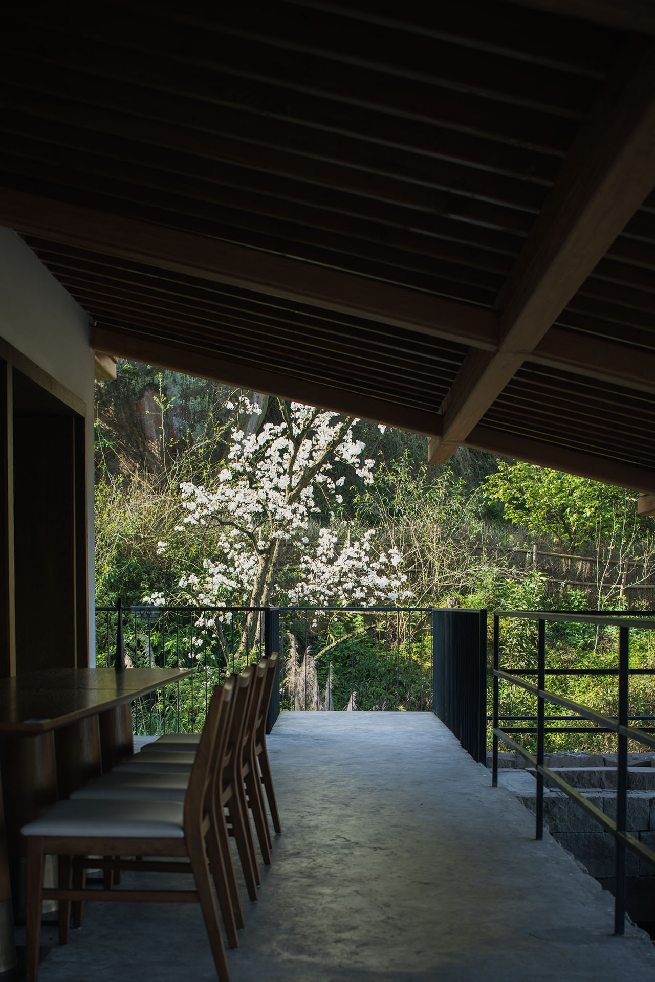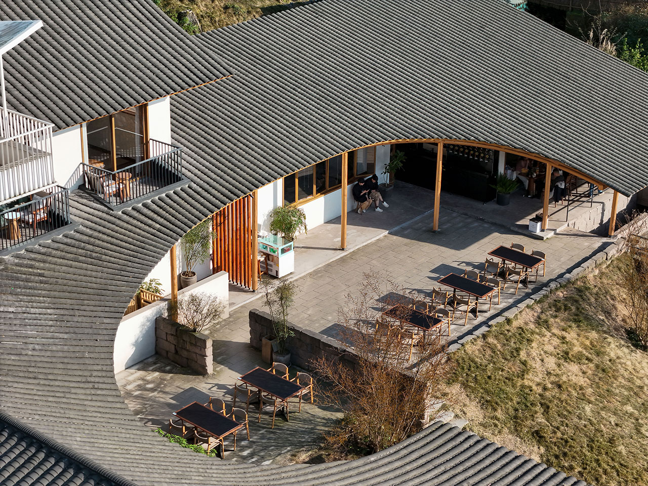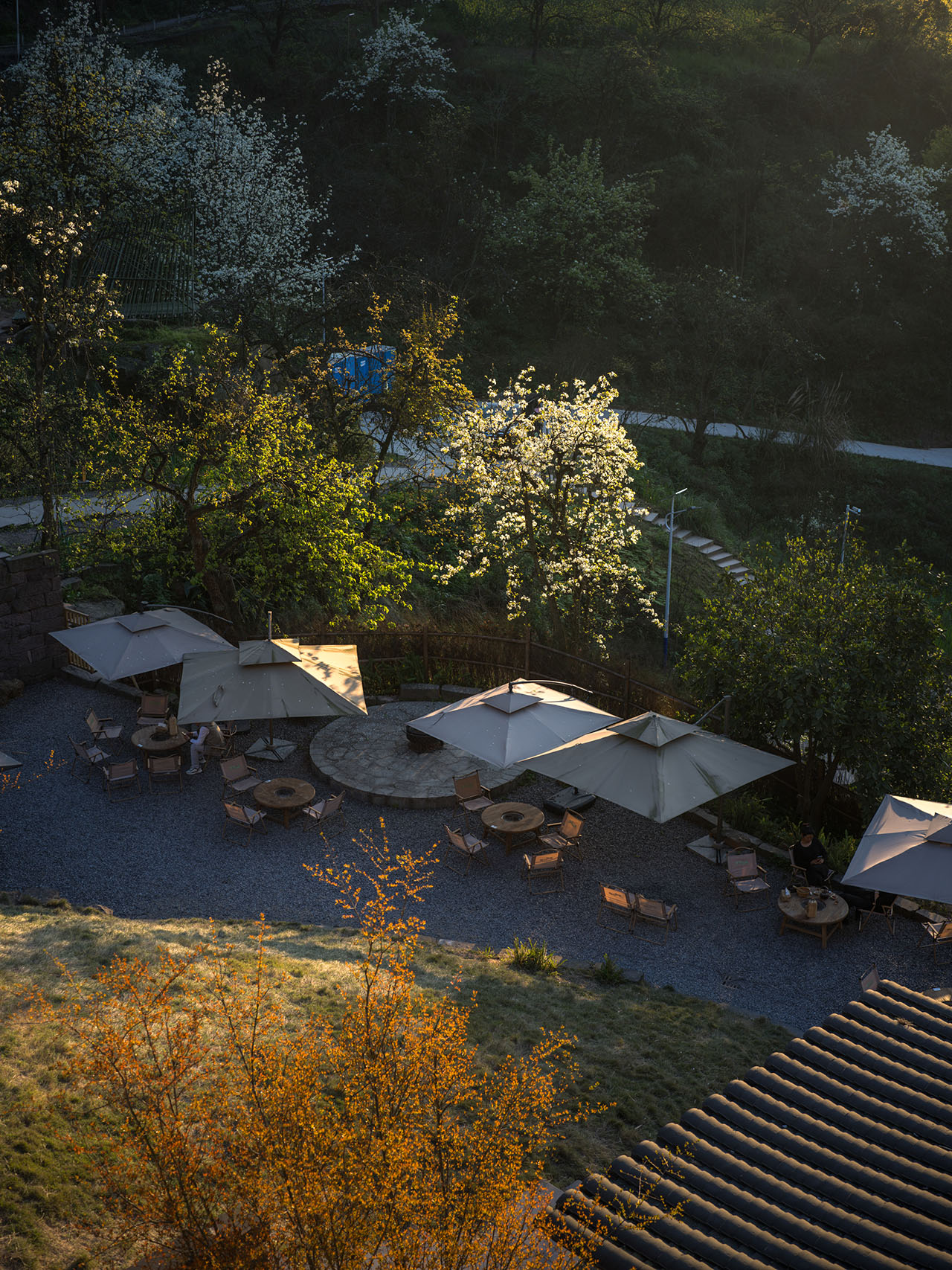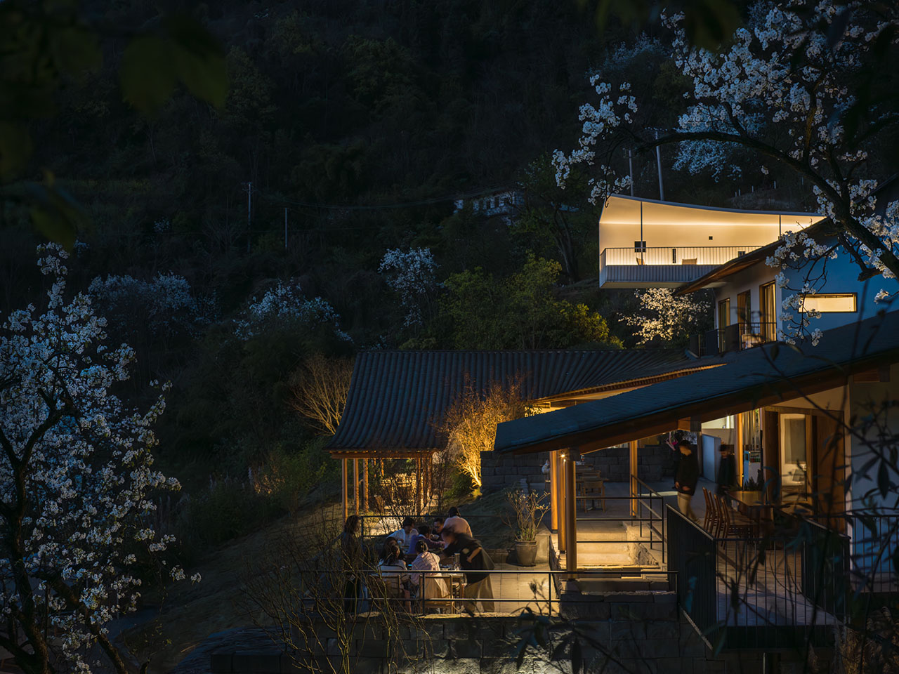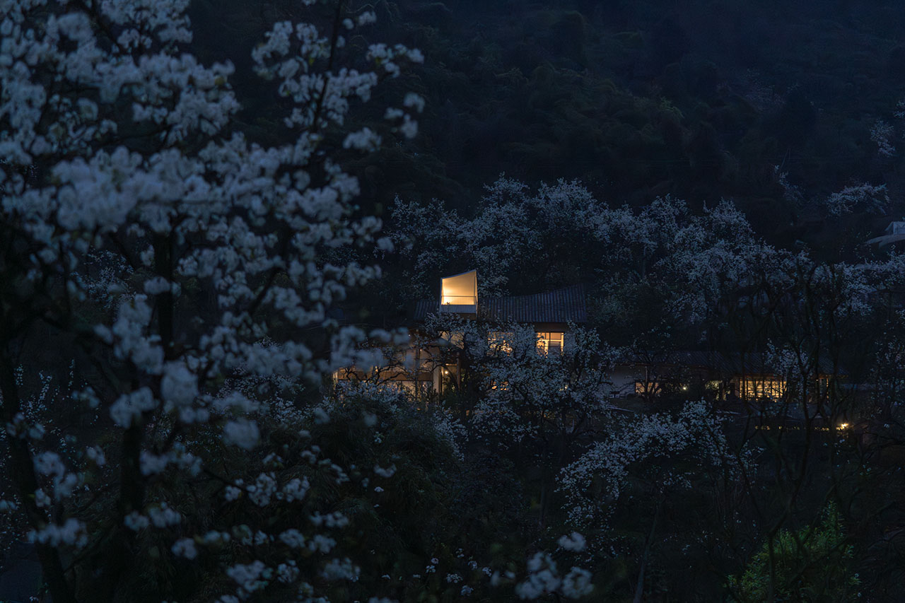 整个建筑基本保留原有民房的空间格局,宽阔巨大的瓦屋面将一层间断的建筑串联成一个整体,梨花瓣叩开一个类椭圆的异形庭院,相较于传统的方形院子更显灵动、柔美,屋檐下的天空形随人动,变化万千,为人们带来更加生动有趣的山野生活体验。二楼屋顶的彩钢棚也改成了瓦屋面,让整个建筑更加和谐统一。屋顶的观景台,犹如乌黑的梨树枝上一颗含苞待放的白色花苞,轻悠的悬在空中,赋予了不在山林独特的形象识别性。同时也为客人提供了一处俯瞰梨园幽谷和观看山林日落的绝佳场所。