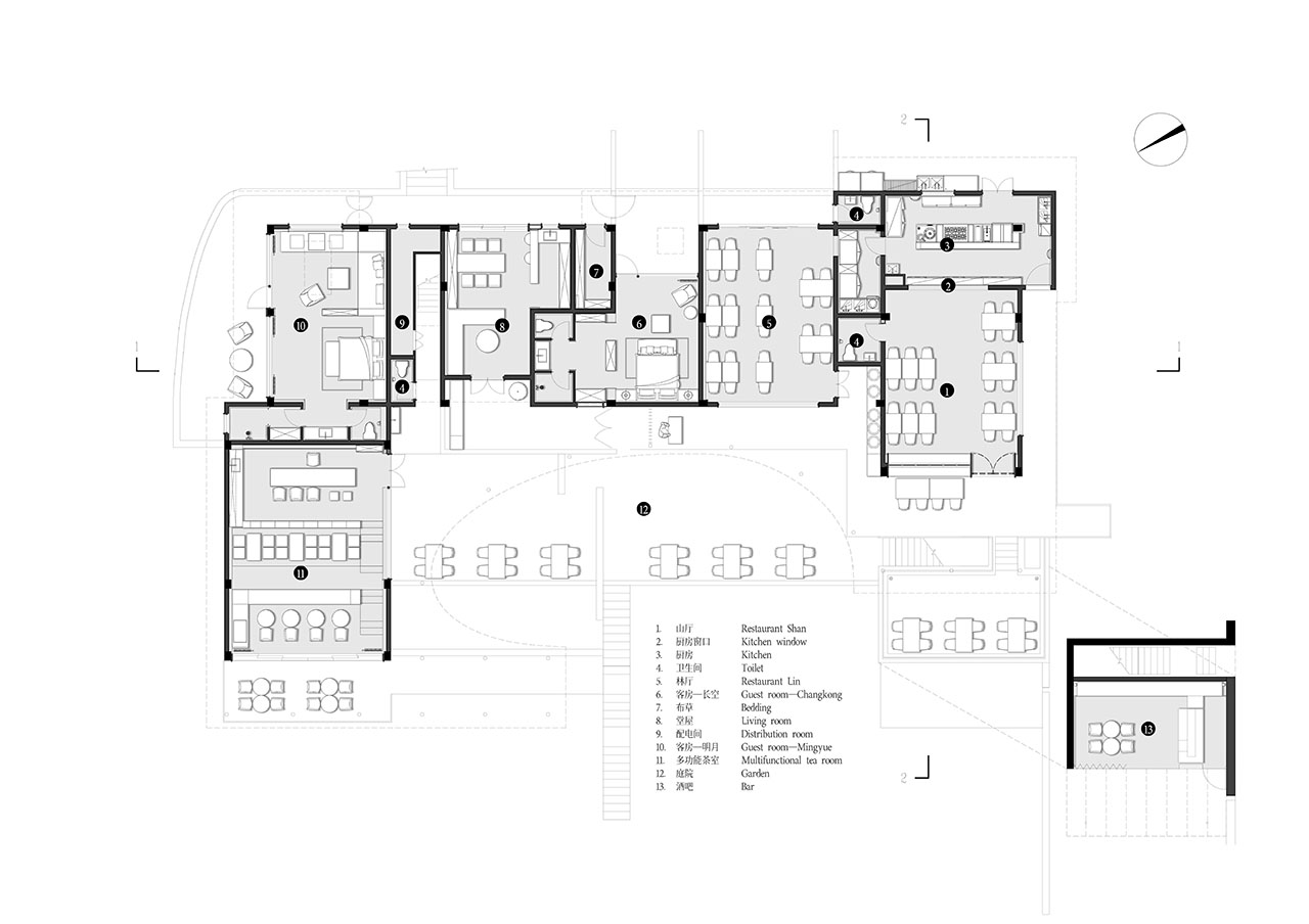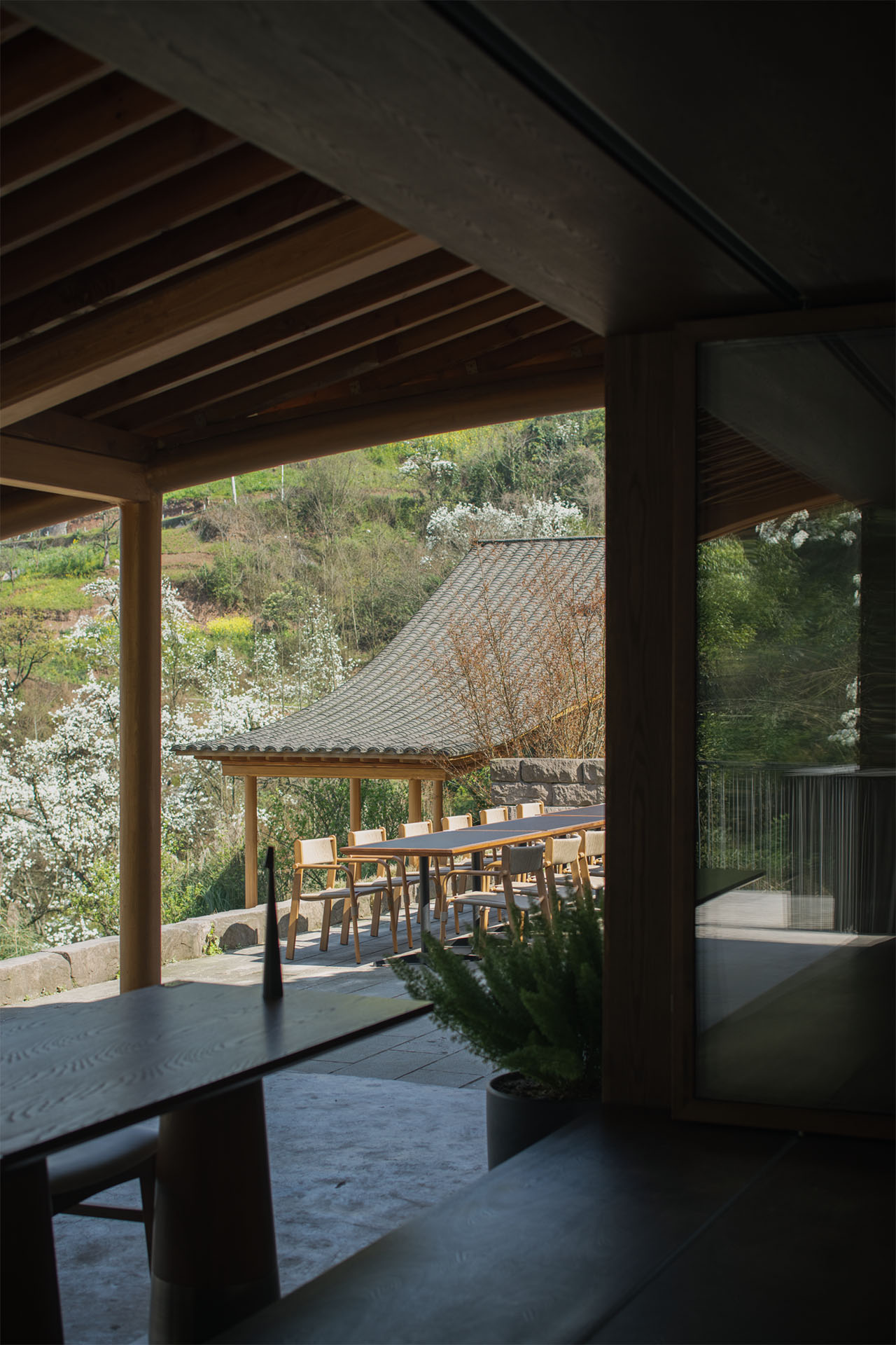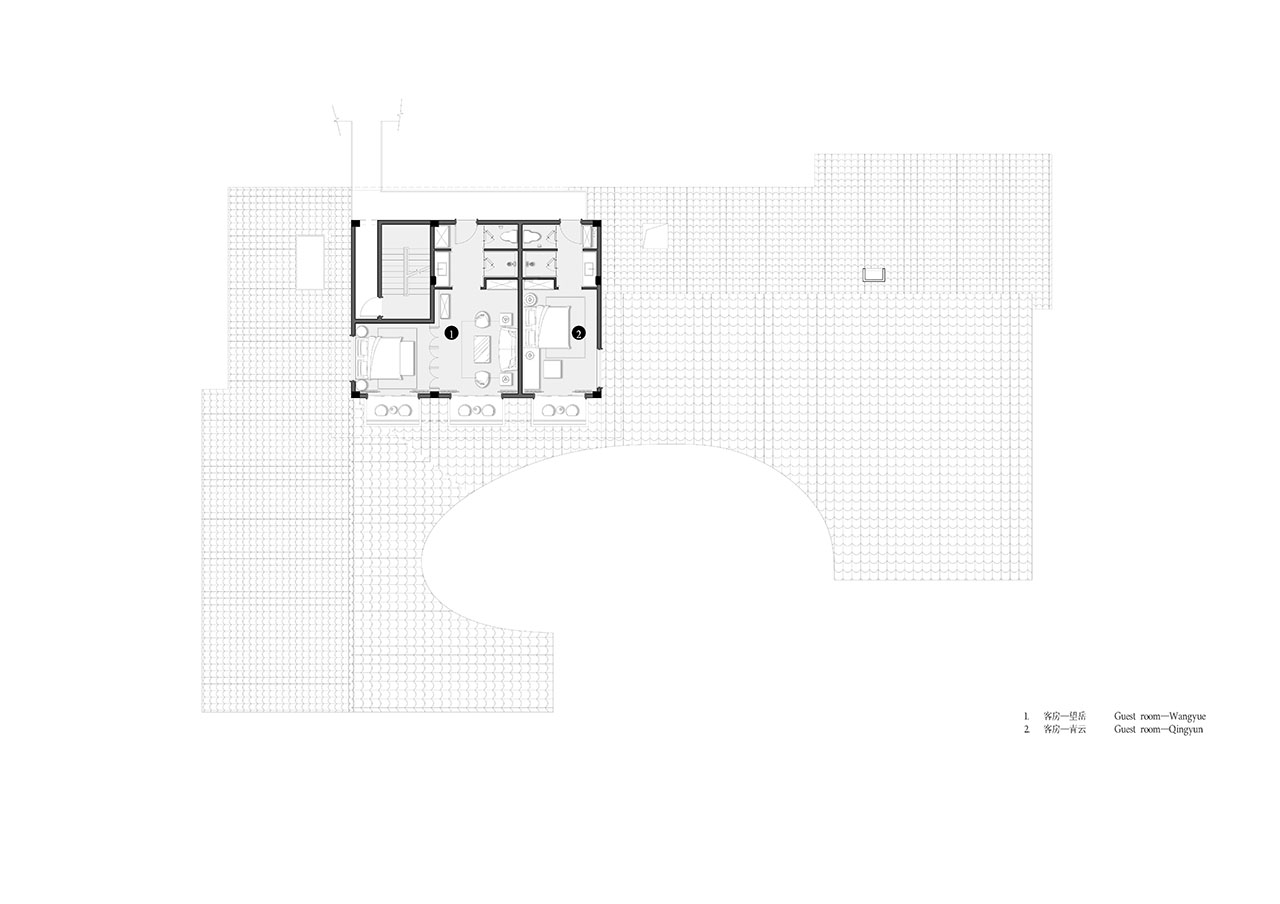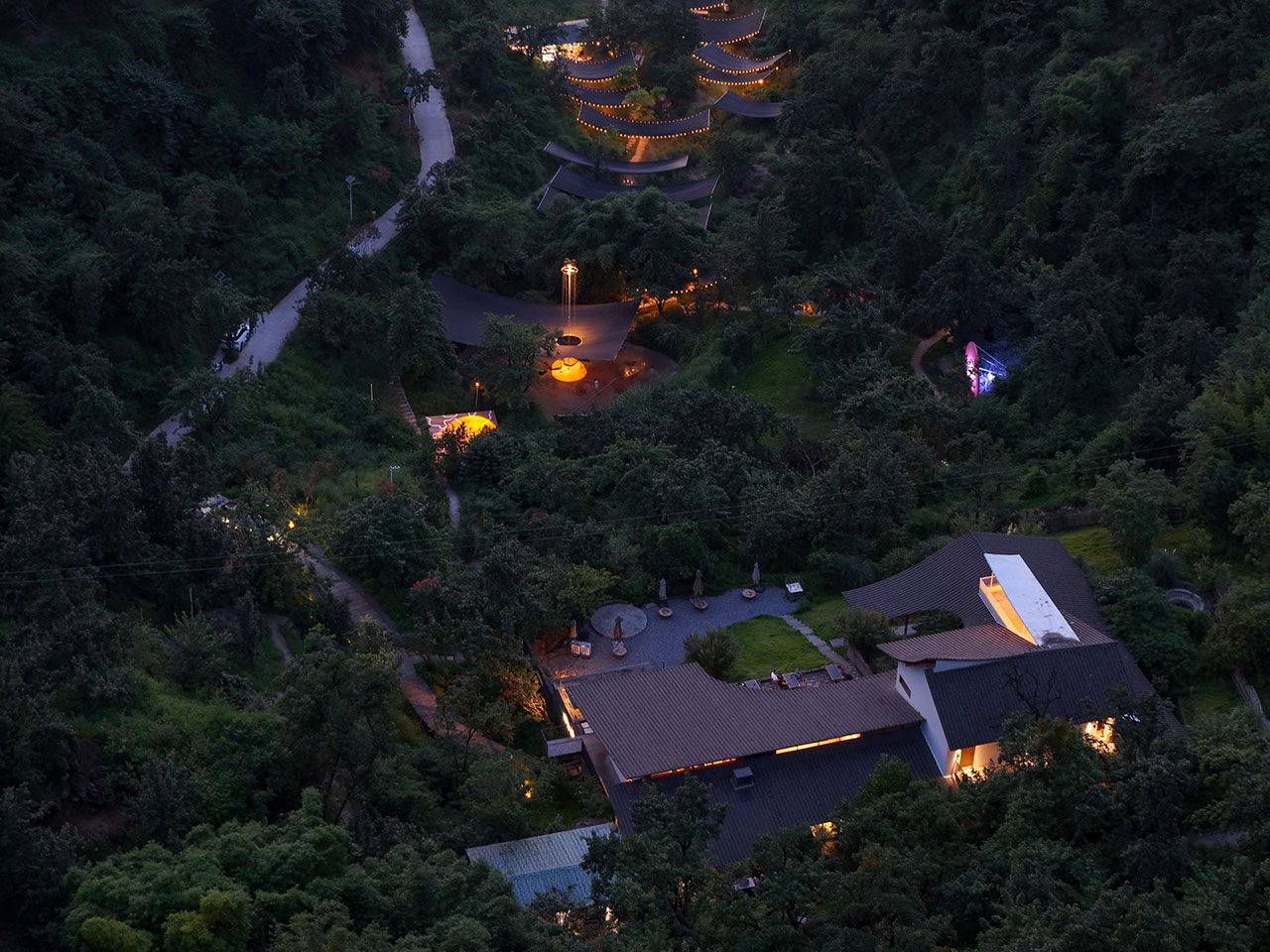 整个建筑基本保留原有民房的空间格局,宽阔巨大的瓦屋面将一层间断的建筑串联成一个整体,梨花瓣叩开一个类椭圆的异形庭院,相较于传统的方形院子更显灵动、柔美,屋檐下的天空形随人动,变化万千,为人们带来更加生动有趣的山野生活体验。二楼屋顶的彩钢棚也改成了瓦屋面,让整个建筑更加和谐统一。屋顶的观景台,犹如乌黑的梨树枝上一颗含苞待放的白色花苞,轻悠的悬在空中,赋予了不在山林独特的形象识别性。同时也为客人提供了一处俯瞰梨园幽谷和观看山林日落的绝佳场所。