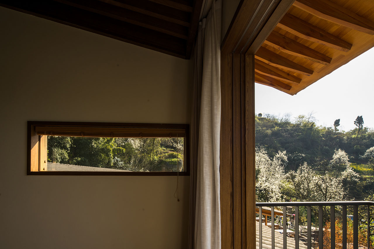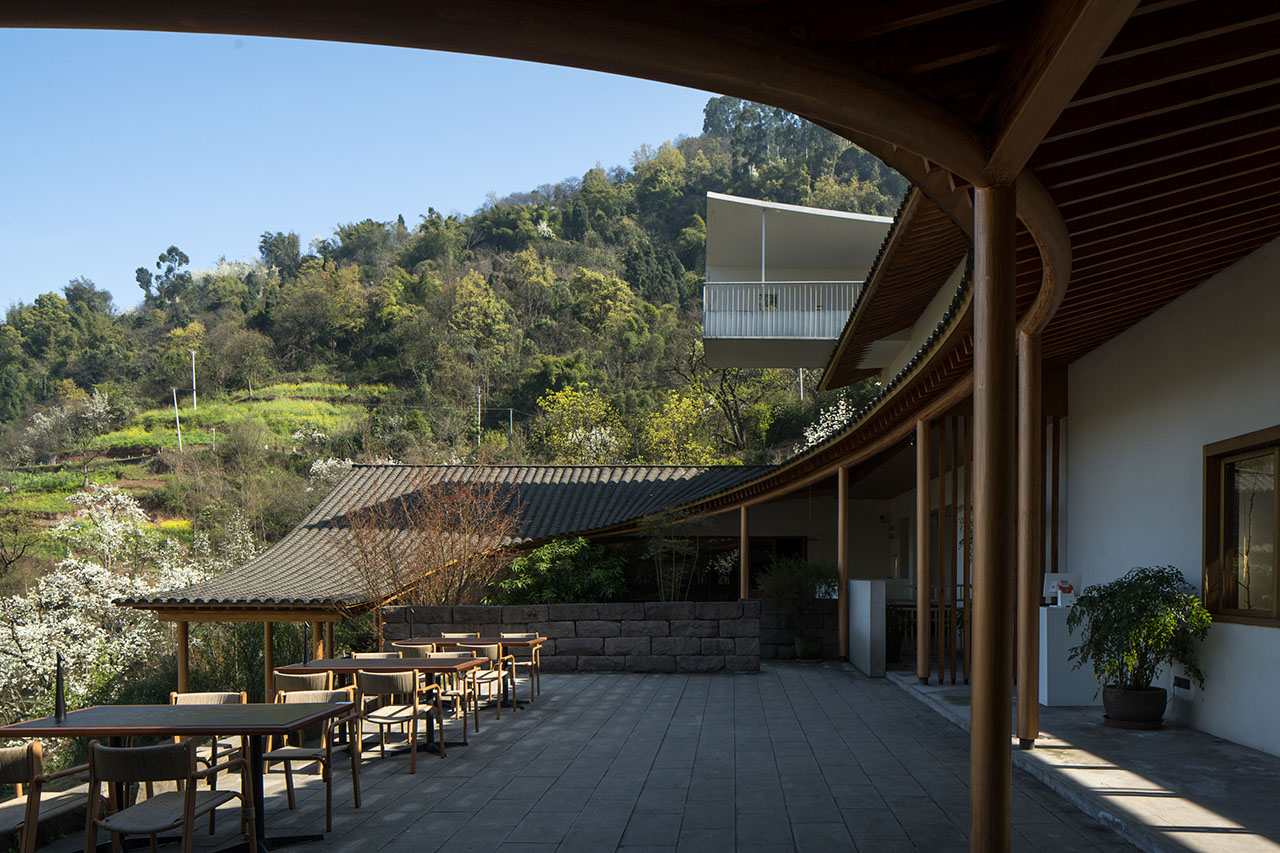 停车信步,迎着巨石的指引拾阶而上,隔着敦实的毛石院墙,便窥见不在山林的侧脸。踏过石板桥,攀上狭窄的石巷楼梯,迎头撞见空中白色的观景台挂在幽远苍翠的幕布之前。步入灵动闲适的小院,青石板铺设的院子,原石砌筑的院墙,暖白色的稻草漆外墙,木结构的屋架,秩序俨然的小青瓦屋面,将传统川南建筑松弛的神韵勾勒出来。顺着院子开口的方向望去,开阔的山谷尽收眼底。扑面而来的巨幅画卷和隐蔽的入口形成了强烈的反差,这种曲径通幽处的豁然开朗让人心旷神怡。