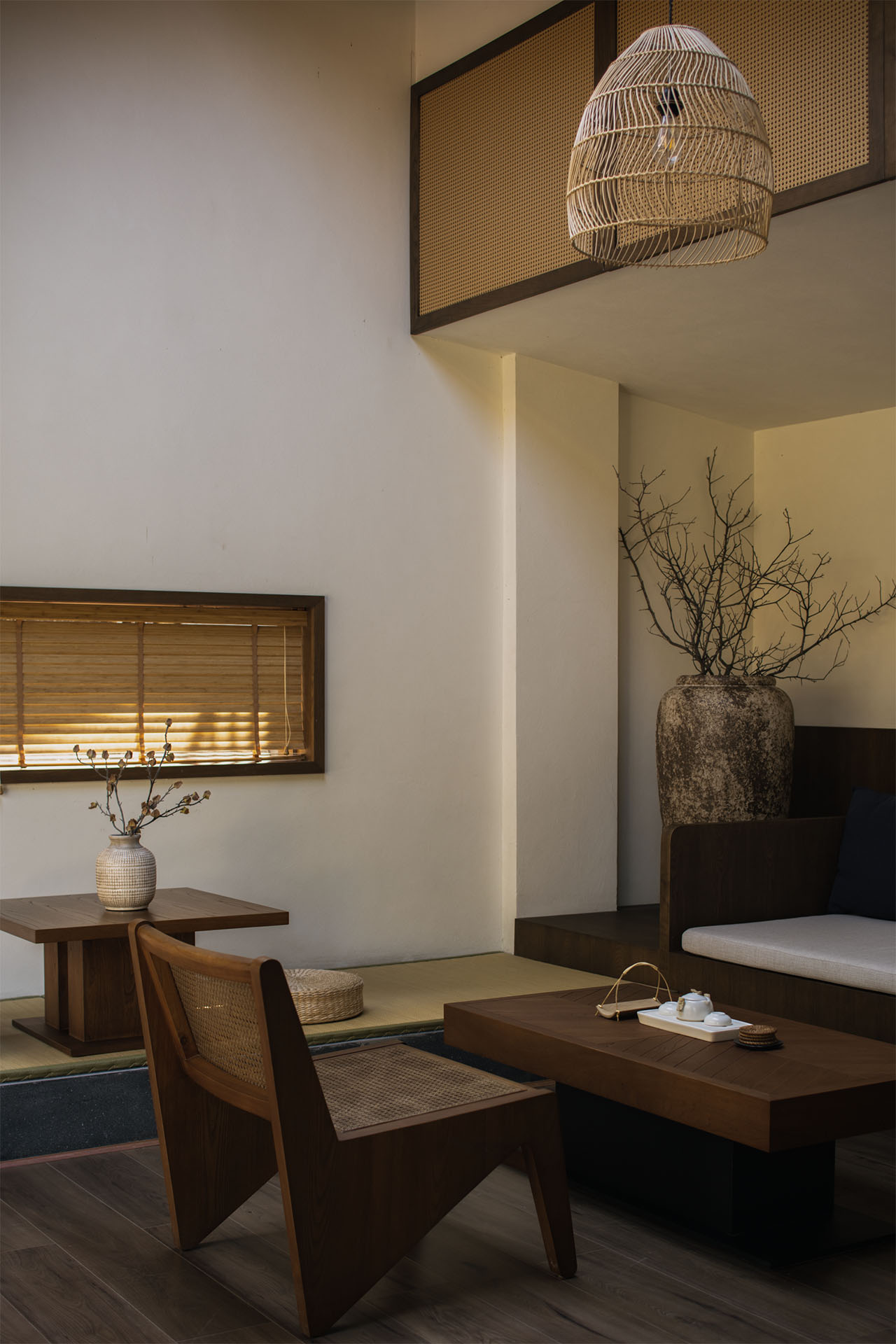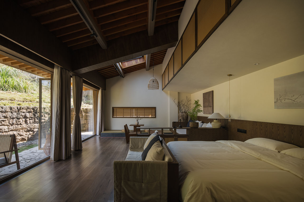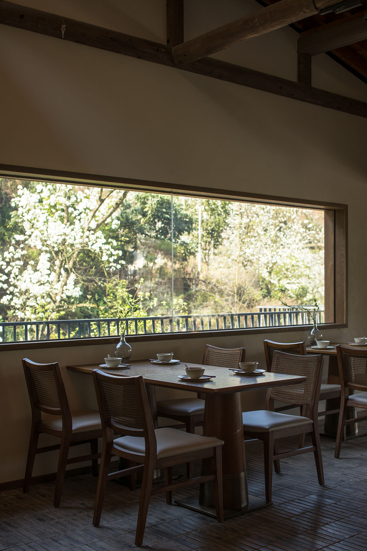 「不在山林」仅打造4间客房,每间客房各具特色。一楼带小院的亲子房,天窗的光倾泻而下,如月光柔和的洒满房间,谓之明月。二楼的套房出阳台便可俯瞰整个院子和山谷,屋内恰好看到青瓦分水的屋脊如山峦伸向远方,谓之望岳。精致素雅的餐厅,老屋留下的木梁把远去的岁月又拉回了现实;阶梯式的多功能茶室,粗犷原生的小酒吧,惬意野趣的户外汤池,满足不同客群的出行需求。室内整个空间延续了阴翳淡然的气质,淡雅柔和的色调与温润的木材结合,将度假感和自然感巧妙融合在了一起。通透的落地门窗将室外自然引入室内,每一个角落都散发出不动声色的拙雅之美。一件家具、一扇窗、一束花、一缕光..……没有繁复的装修,却处处尽显东方美学。