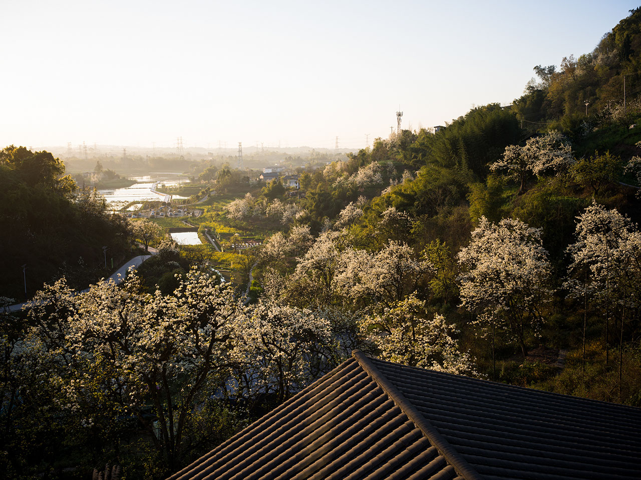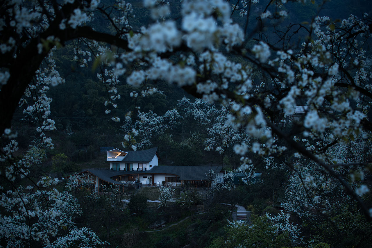 从泸州市区驱车二十分钟,喧嚣悄然退去,逐渐遁入一处山林幽谷。在蜀中名山方山的怀抱中,面对一片幽深的山谷梨园,「不在山林」悠然而居。这里是泸州江阳区丹林镇的梨花村,村内植有梨树四万余株,其中百年古树逾千,春日梨花如雪,故而得名“梨花村”。村子背靠的方山,是蜀东南佛教发祥地,山巅始建于唐的云峰寺中,供奉着全国唯一一尊“黑脸观音”,为这片山野更添一分禅意与神秘。