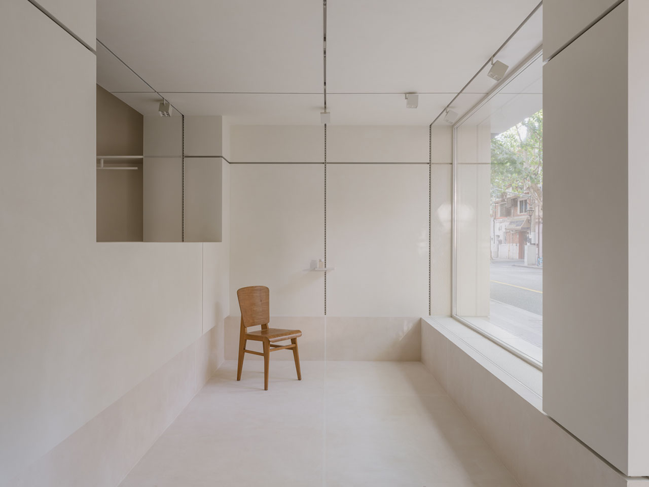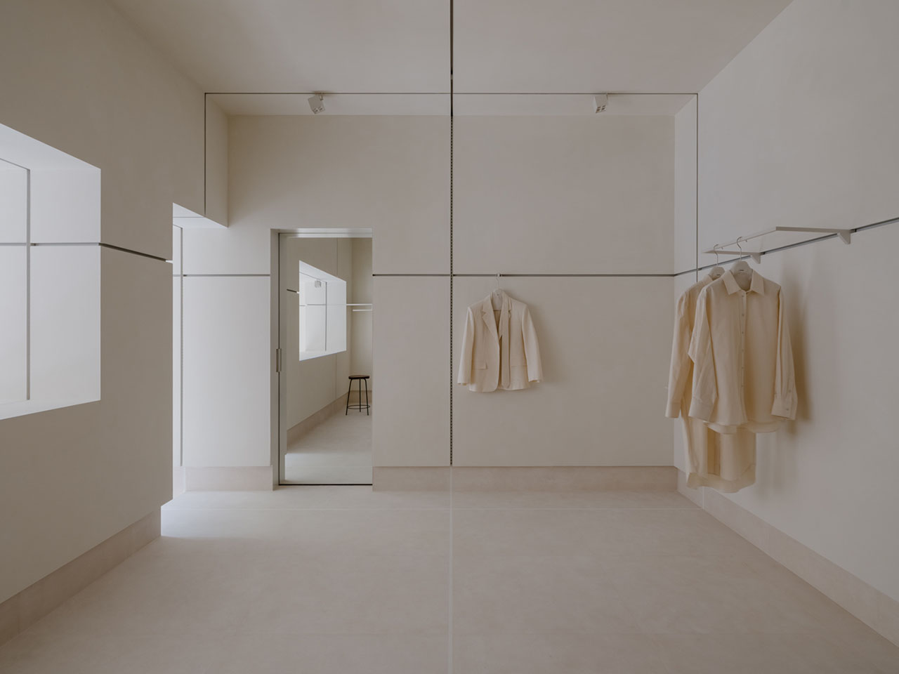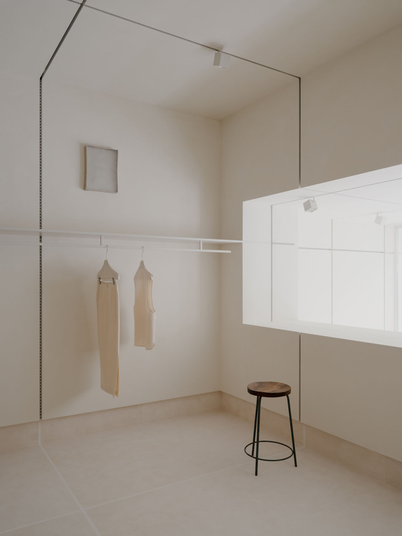 建造以“脱模”的手法揭示结构本身,空间仿佛一块刚揭开的盒装豆腐,保留着模具痕迹。墙体呈现出模块拼接的规律,构成独特的空间语言。筋的结构组织着、激活着空间。垂直的“筋”沿着中心轴线展开,成为灯轨与立式展示轨道。水平的“筋”则呼应场地的窗台高度。上缘界定了挂架、壁柜与挂杆轨道的位置,下缘则成为踢脚的沉积线。每一条“筋”都以垂直交织谱写着秩序,以无感的方式将功能嵌入空间的缝隙之中。