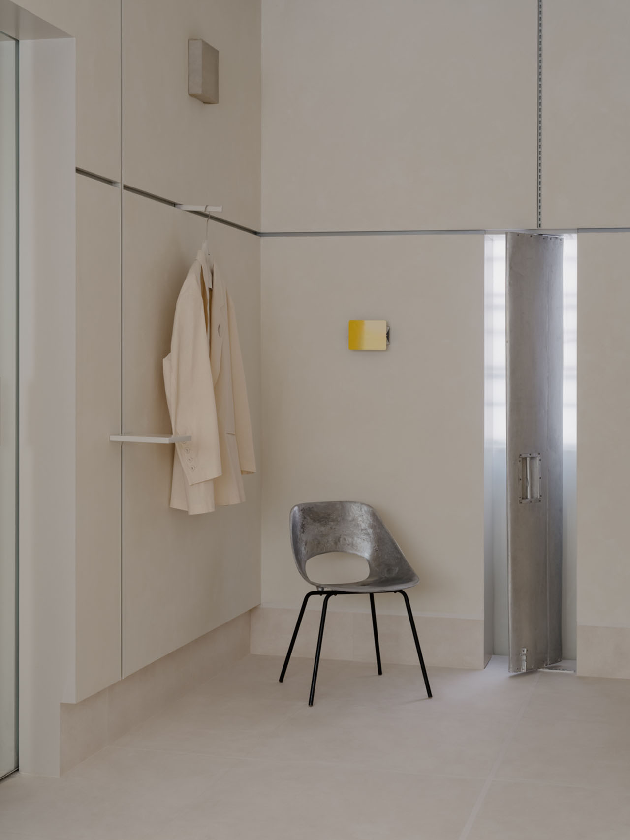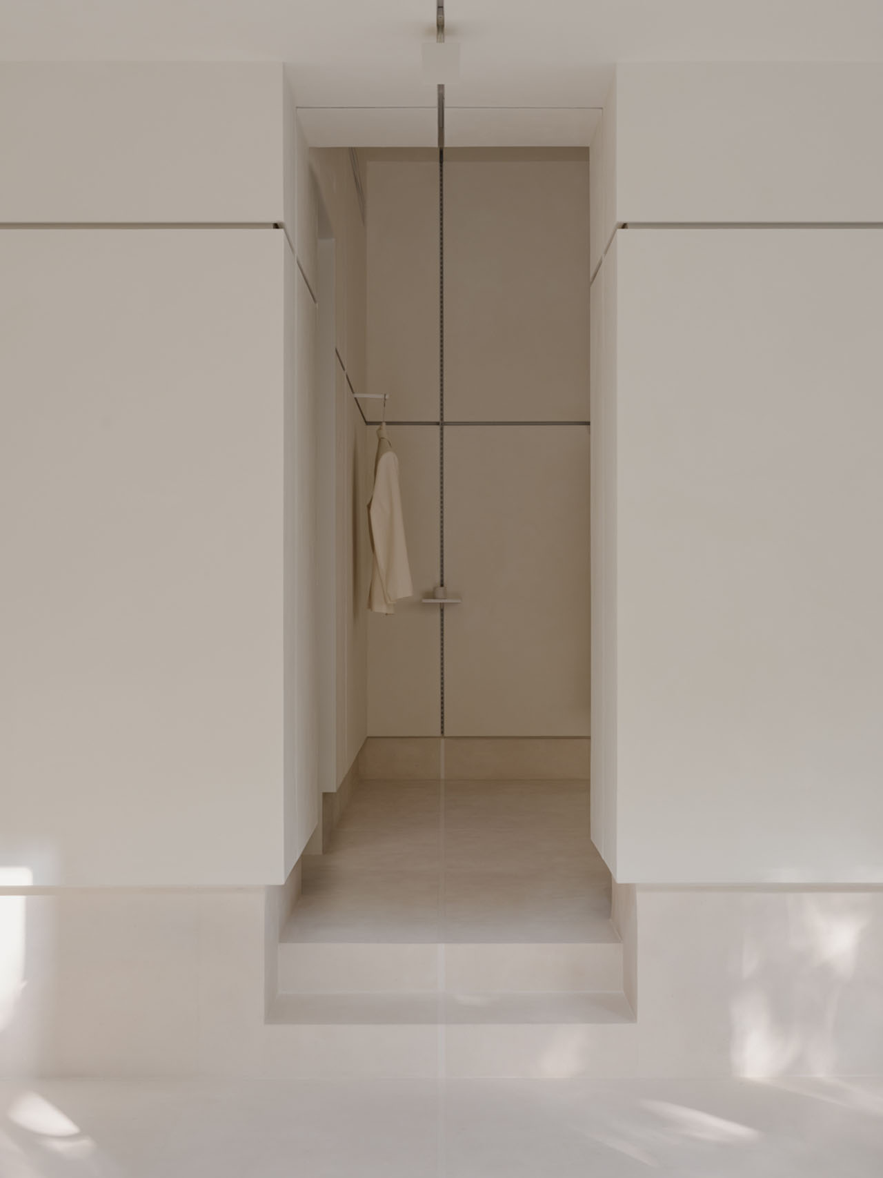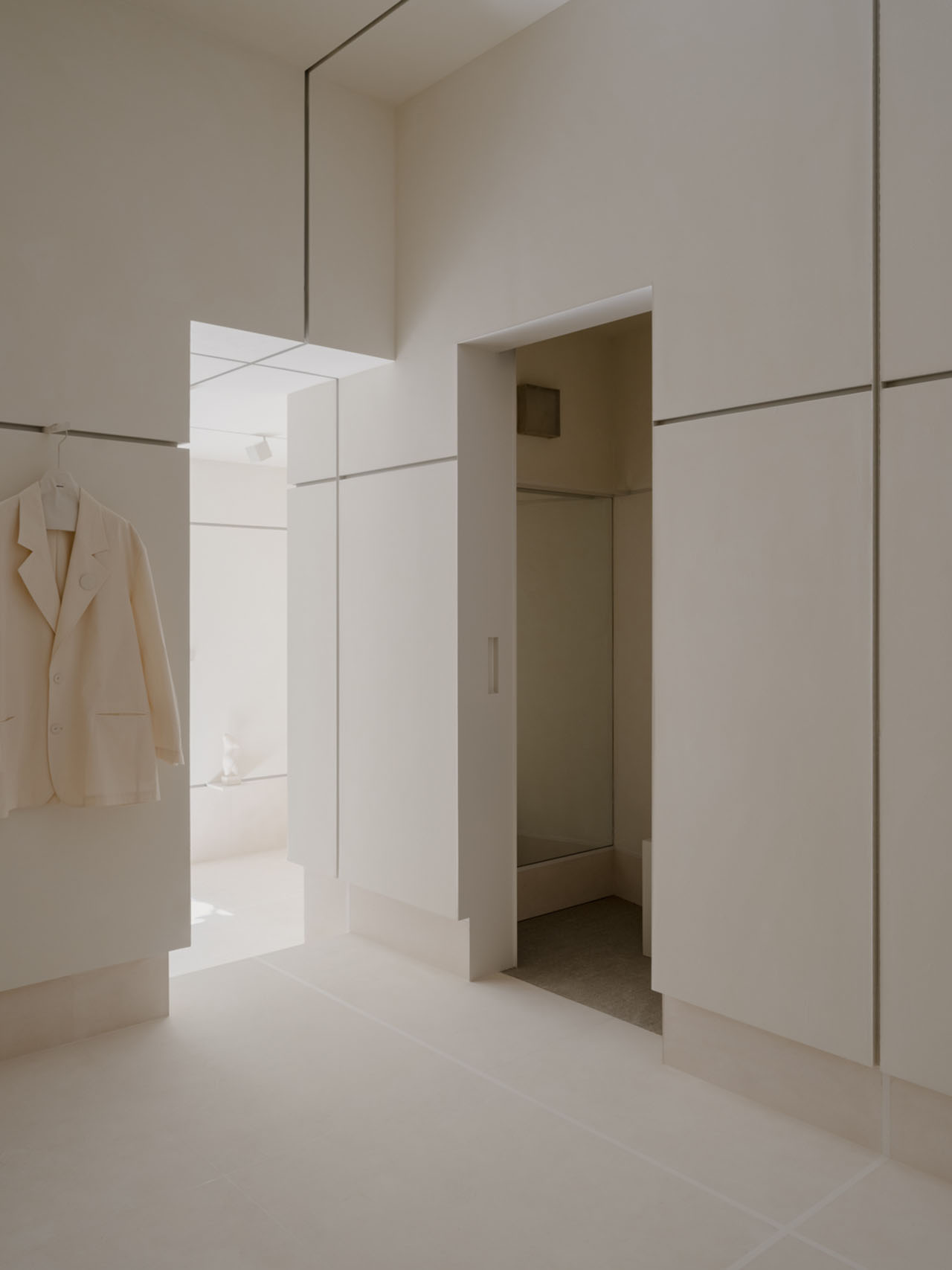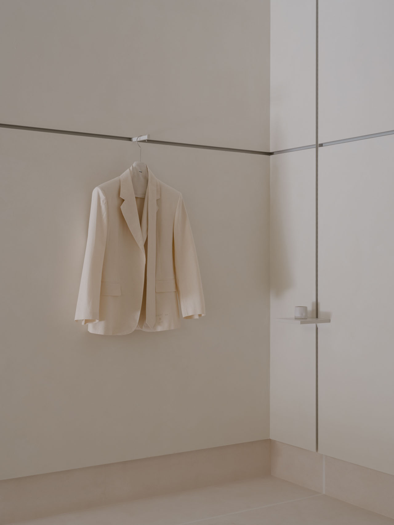 空间让toutche 品牌的核心表达更为立体,它不仅是服装的集合,更是一个兼容矛盾、承载情绪、弱化边界的“关系系统”。无关装饰,而是形式与功能的语法。一系列功能部件围绕墙面“筋”系统运应而生:承载物件的展陈平台、悬挂画作的挂钩、展示衣物的挂架。每一条“筋”的衔接都既务实又具表现力,共筑出一个容纳物品、空间与人共生的空间。正如品牌的“原型”概念服装一般,室内细节同样克制而持久,以简洁的结构承载着复杂性,在不显眼处藏下千钧分寸,让生活的逻辑自然嵌入材质与结构之间,在体系中感知自由。