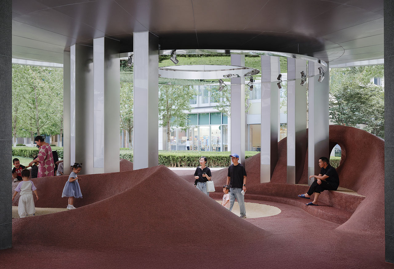 除了引入新的地景语言,我们也利用原有结构增设与地面呼应的镜面吊顶。 褶皱起伏的地景又有“山”的意象,山自然聚人,“人&, lt;, , span dir="LTR" style="mso-spacerun:'yes';font-family:宋体;color:rgb(0,0,0); letter-spacing:0.0000pt;mso-font-width:100%;text-underline:rgb(0,0,0); font-size:10.5000pt;mso-font-kerning:1.0000pt;">”与“天、地”的关系微缩于亭内,使其在有限之中生成天地交感的诗意。与“地景”呼应的镜面“天穹”引发人与空间的视觉互动:它映照天光流转,引导人的身体节奏。地景可动亦可静,而人的动静,也因天穹的变幻而生出不同感知。这一切,待亭中之人,以身体为媒,去探索、感受与体验。