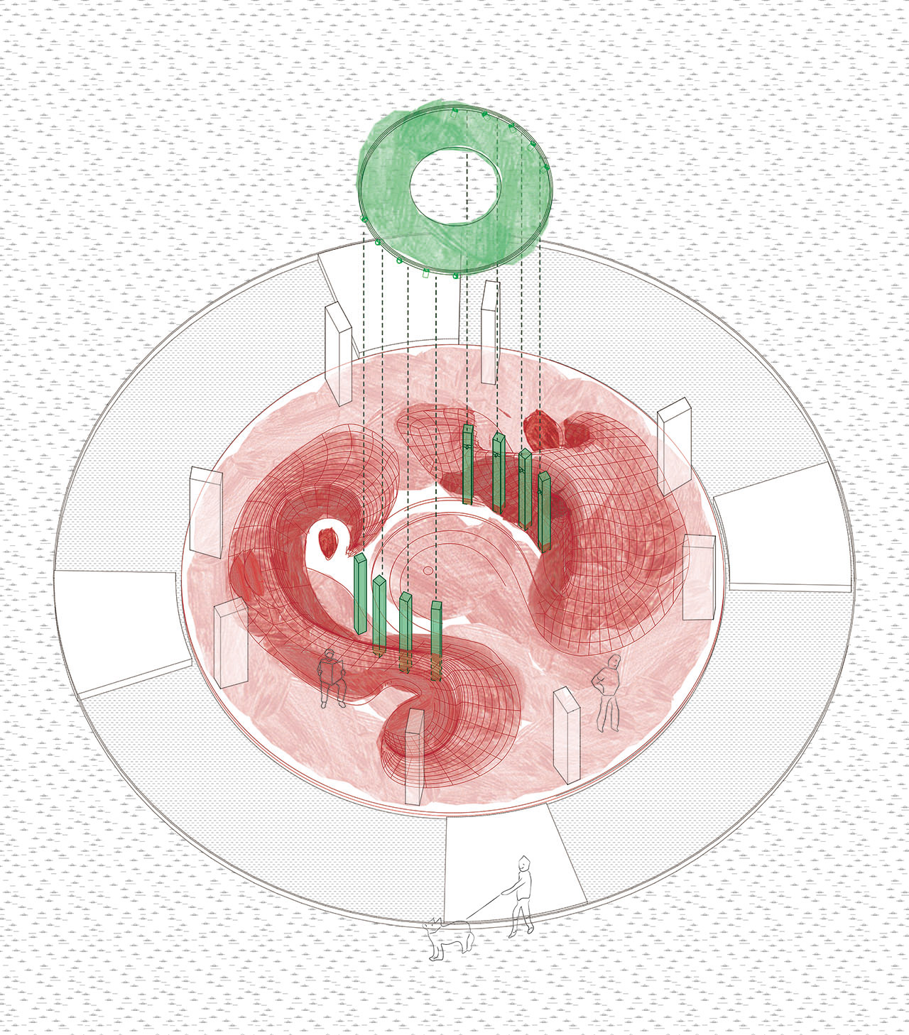 亭子中置入褶皱起伏的地景,创造与身体有机而真实的联结,而非简单安插一组“游戏装置”。褶子,本身就是“两者之间的褶子”,营造出自由、亲密以及内外并存的可能性。起伏的褶皱地景将直径18米的圆亭划分为内外两层:内侧为集中性的舞台空间,外侧则随褶皱的延展自然围合,形成一系列贴近身体尺度的私密角落,吸引人们停留游憩。这组地景看似开放,却在暧昧的围合与流动之间,悄然创造微妙的亲密感,使人在其中遇见那些未被预设的人与事。