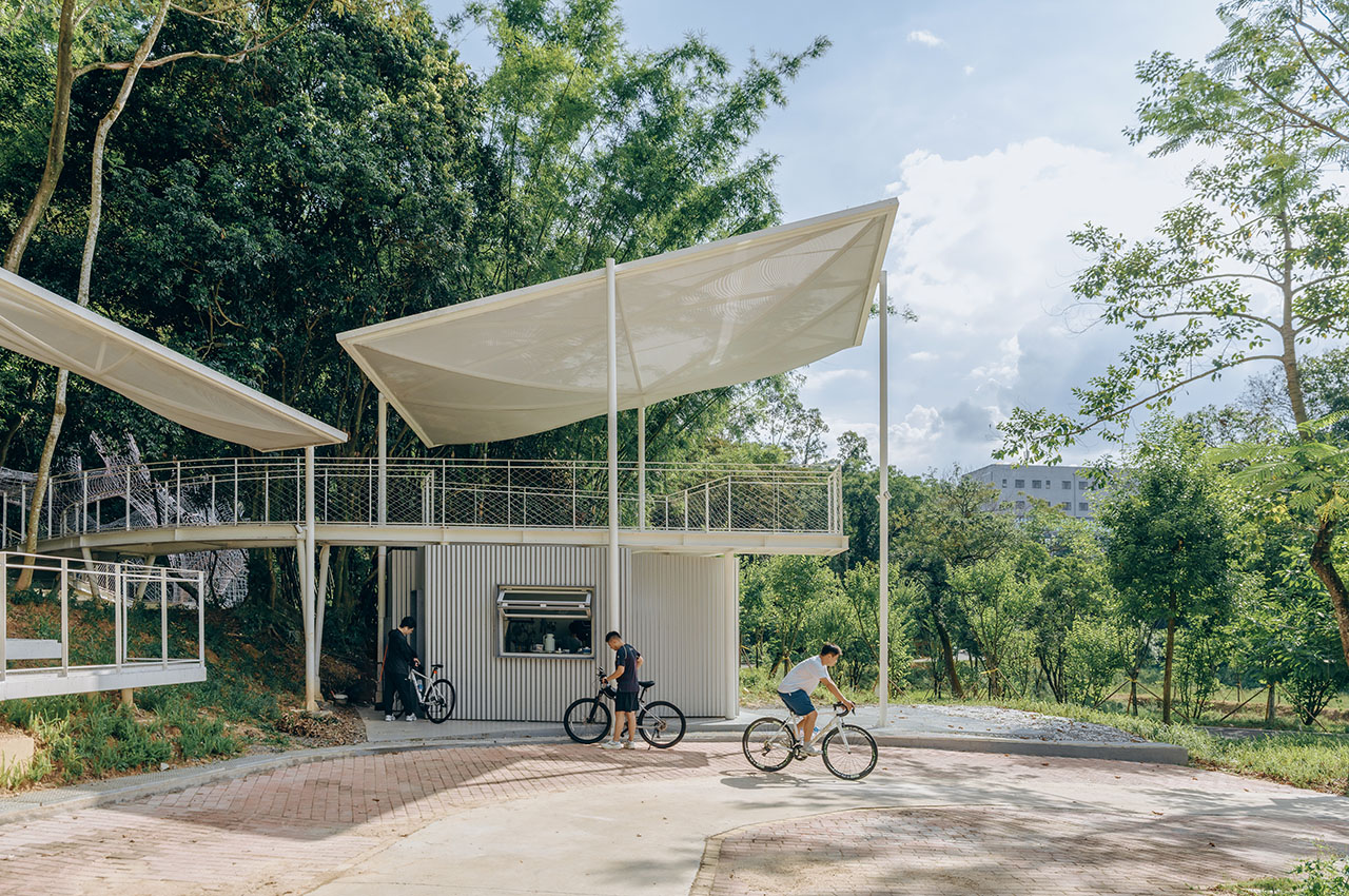 7片半透PTFE/法拉利膜顶模拟自然树林的形态,成为骑行者休憩的场所。它们如同人工的“树冠层”,在真实的树林中生长出来,茂密、交织、穿透、轻盈,形成第二层“人造林冠”,与原生树林产生视觉和空间上的互动。