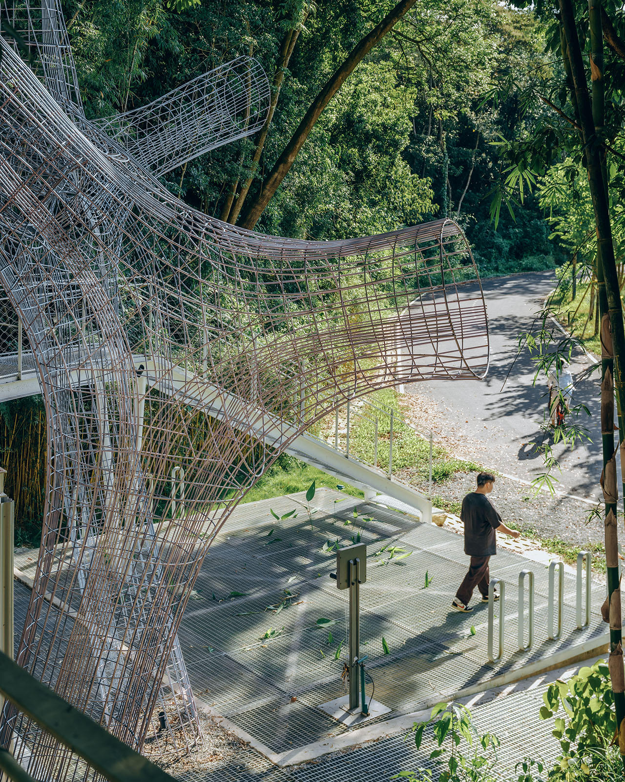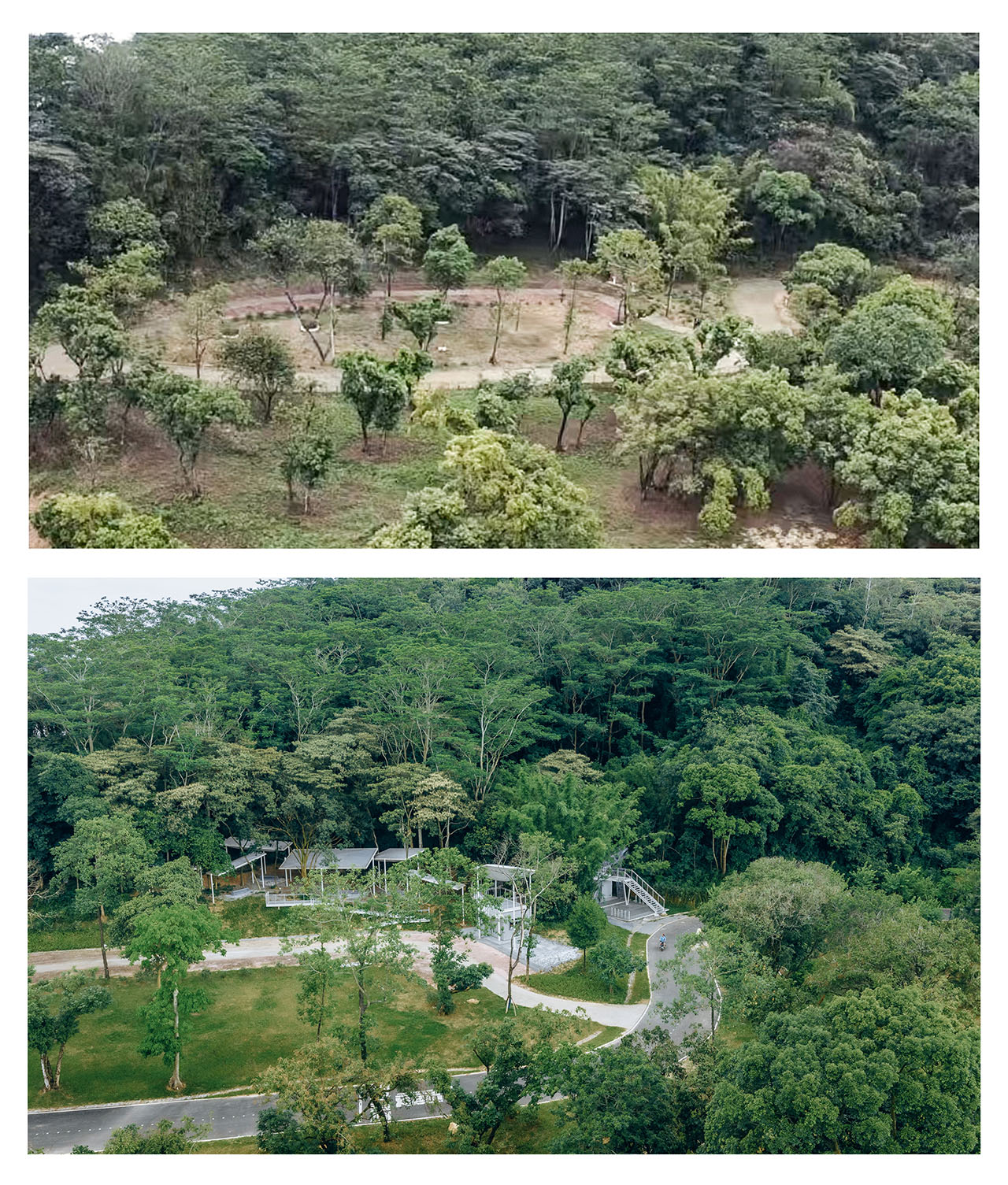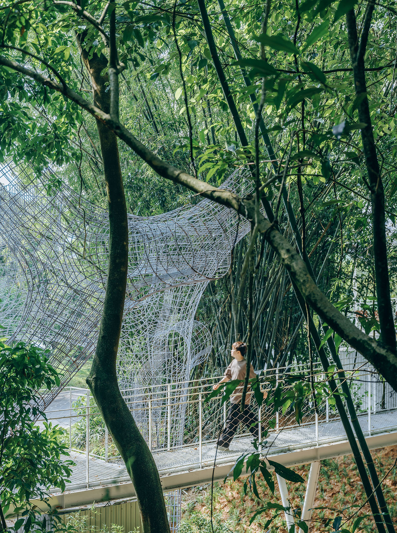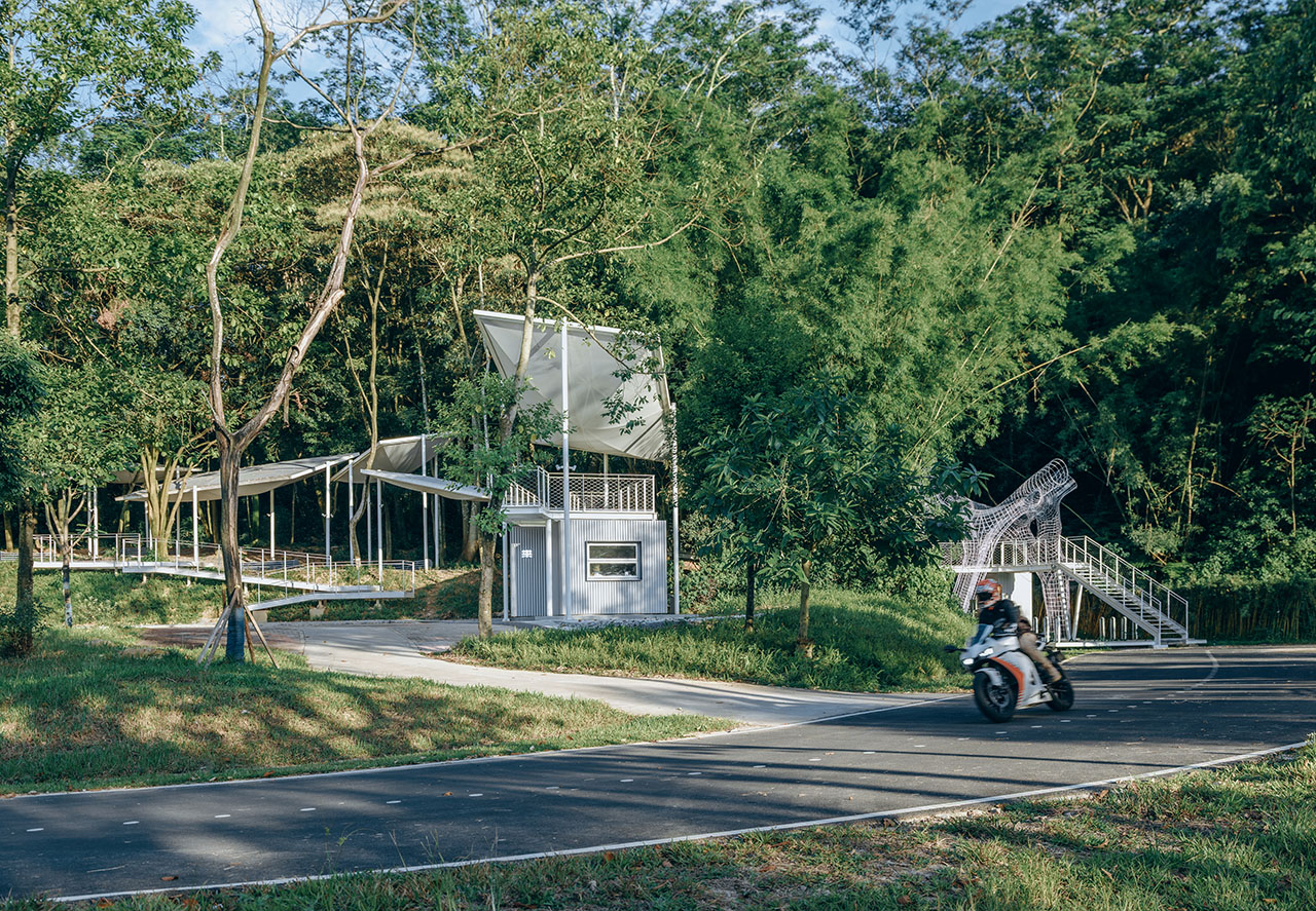 林间有钢格栅栈道小径,穿梭于原生林与“人造林”之间,连接咖啡厅与卫生间。栈道尽端的观景挑台能够远眺水库,使休憩空间不仅满足基础功能,更能体验自然和放松精神。