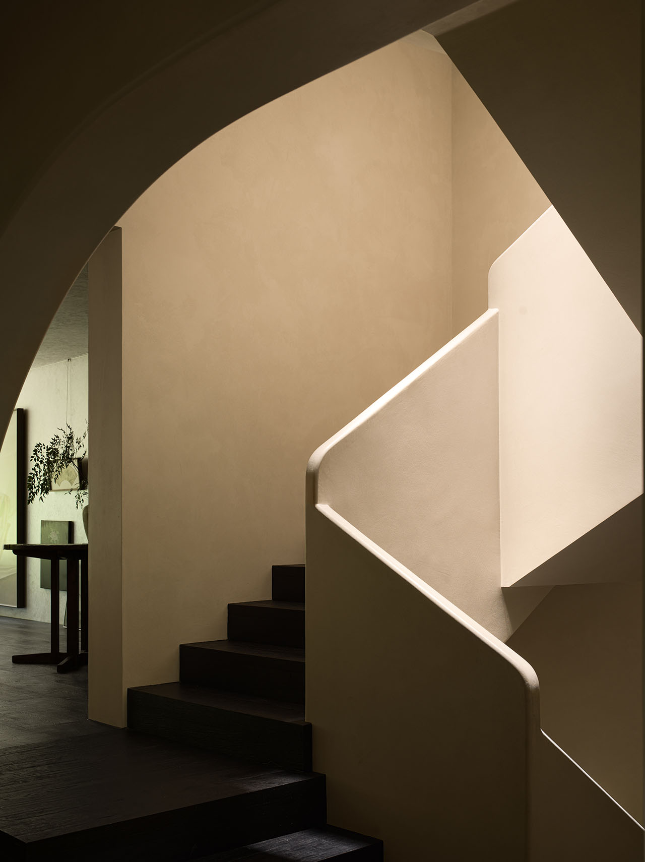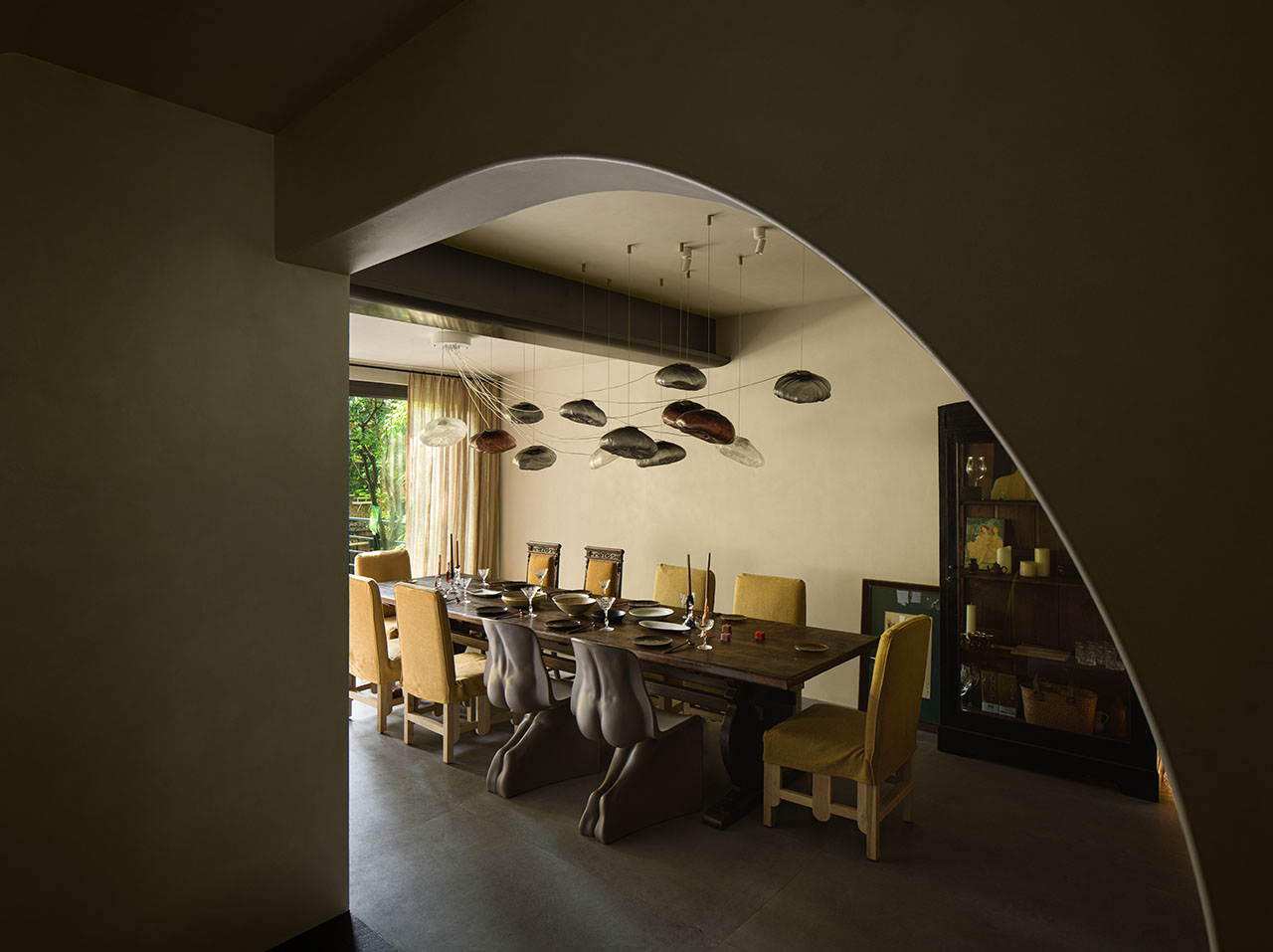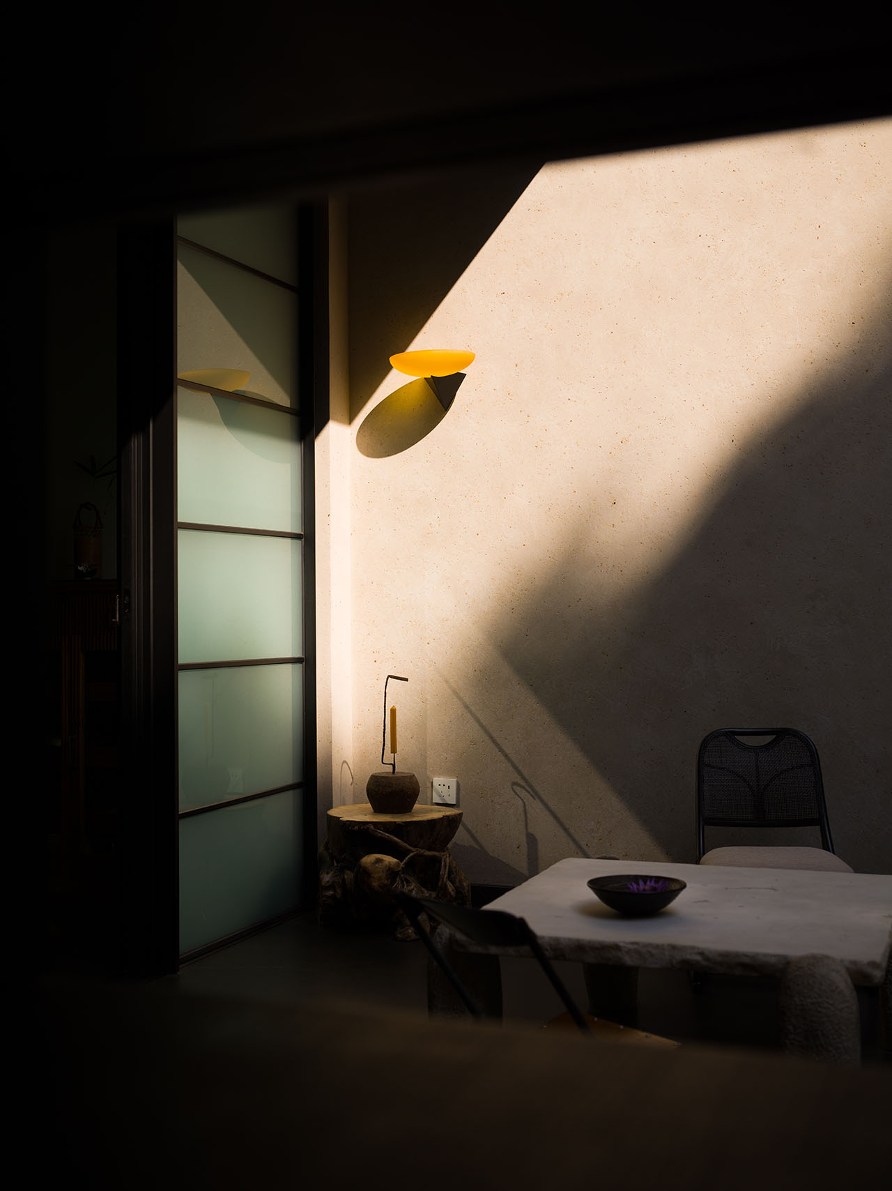 自然的光影成为最美好的画面,大茶室吊灯荒川上野手工吹制的,仿若有宇宙星辰之感。小茶室的法国手工灯,色温控到2300k,空间与自然共场如月光般抚慰人心。餐厅玻璃手工灯,错落有致既解决了层高高低不平的问题,也让用餐更有违合感更有氛围感。整体灯光使用克制,也全部可以调光,此空间因自然光及灯光而更美好。