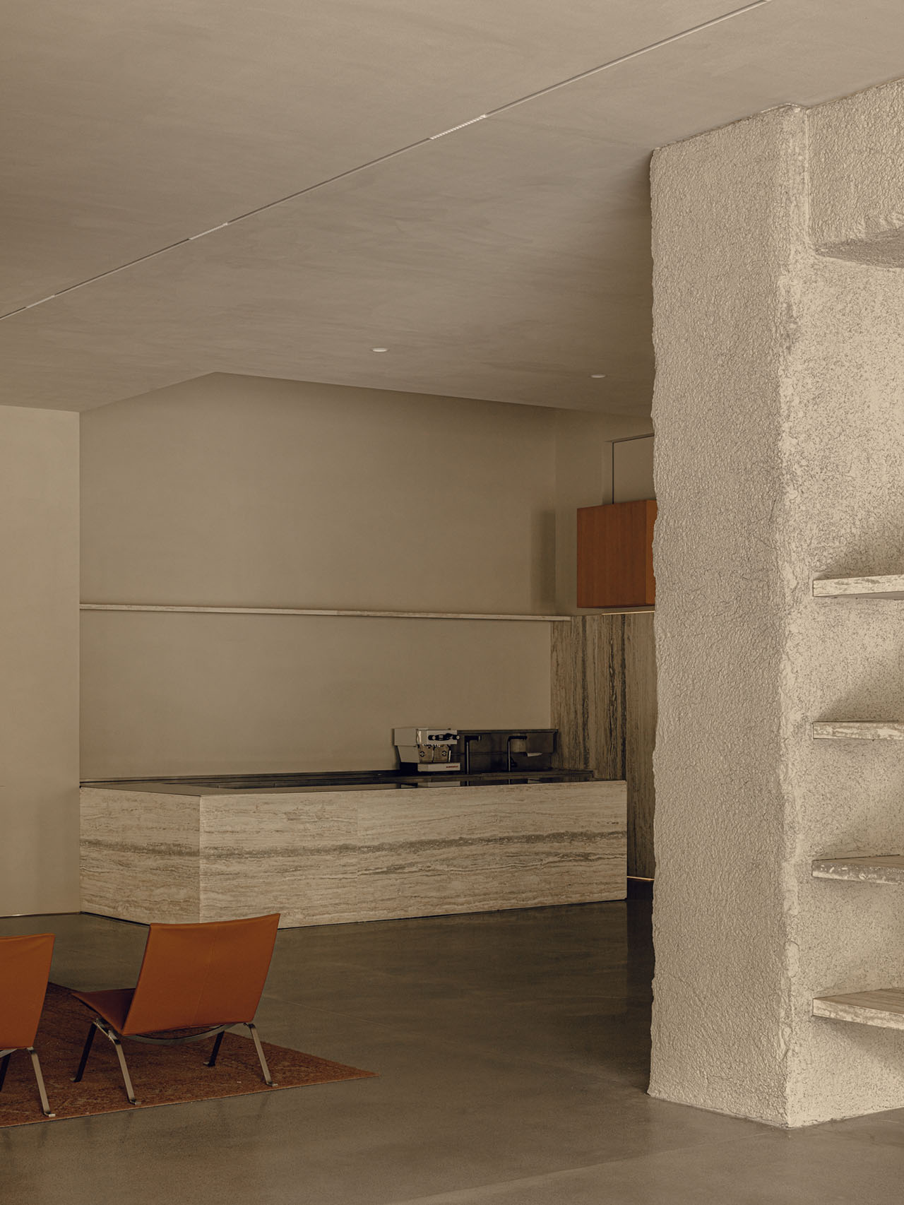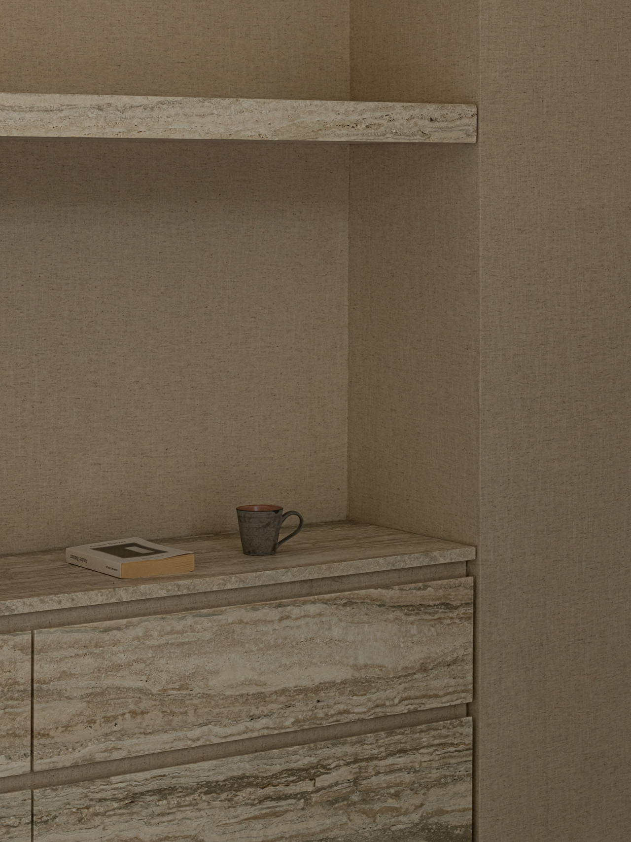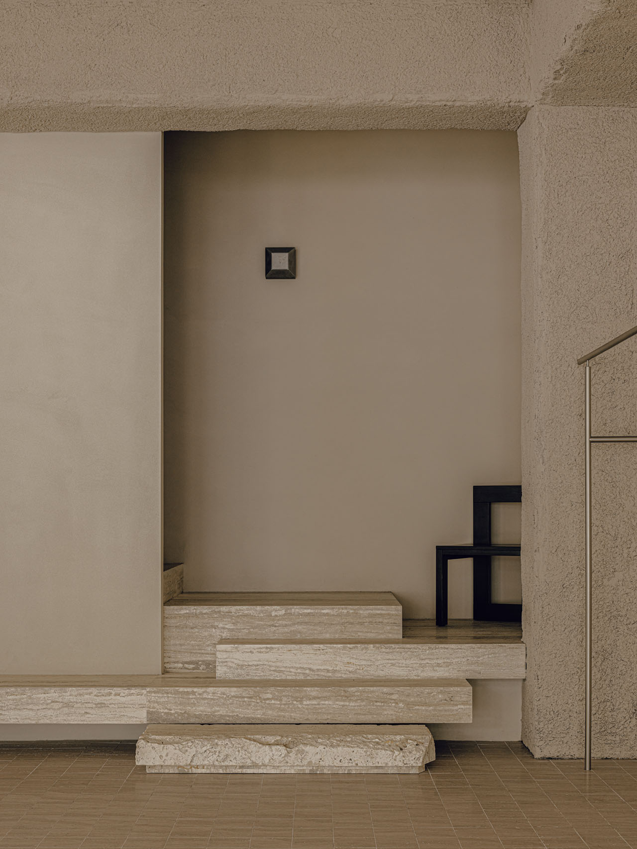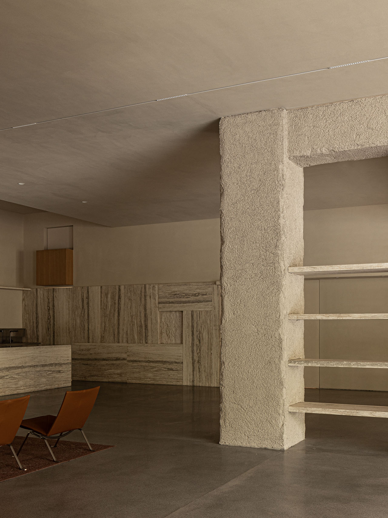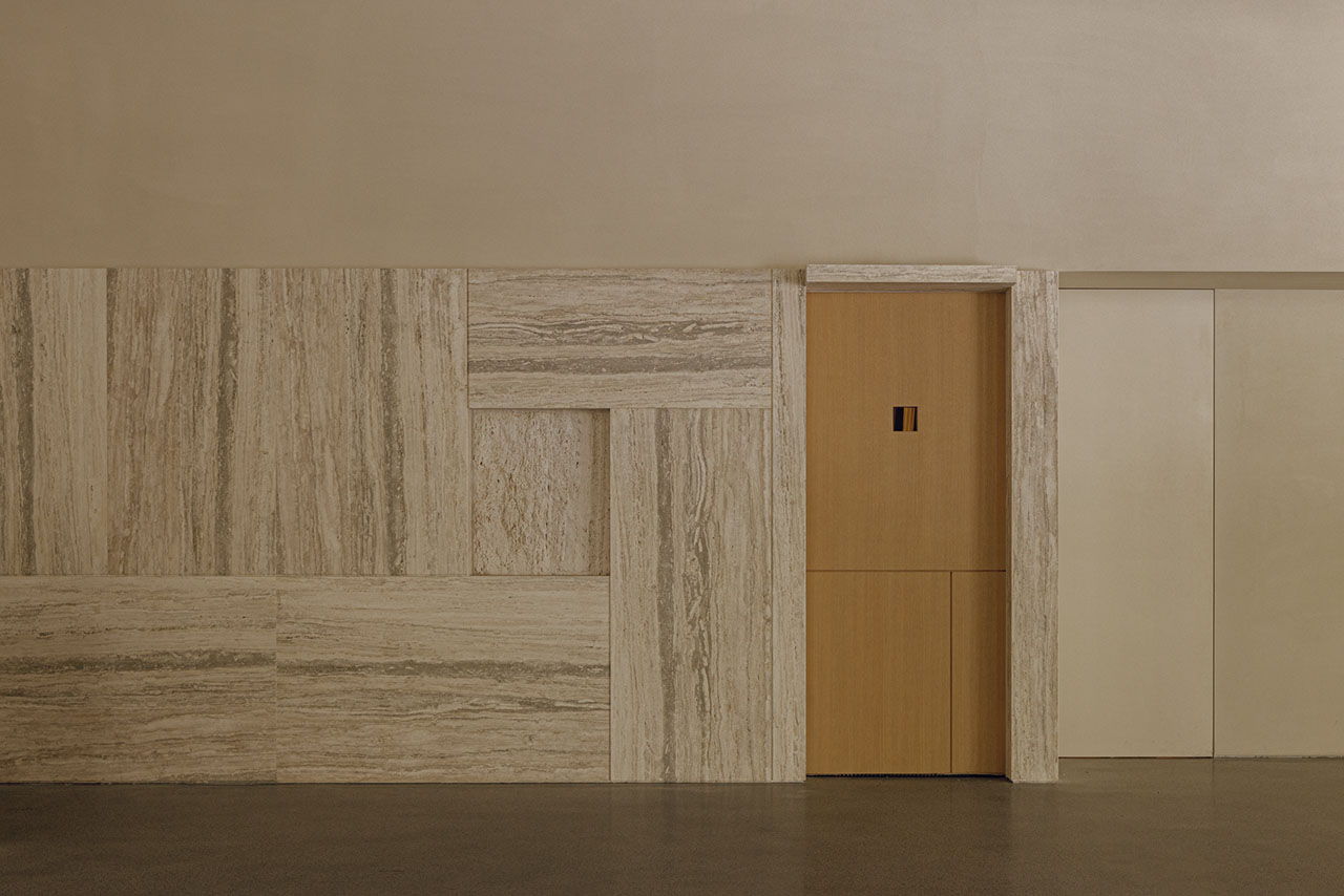 洞石铺陈半墙,切割尺度各异的体块比例,立体、拼接、穿插,构成隐性的区域分界。刨去色彩的后天定义,以自然的木色达成对情绪感知的划分,打造克制且富有张力的精神场。