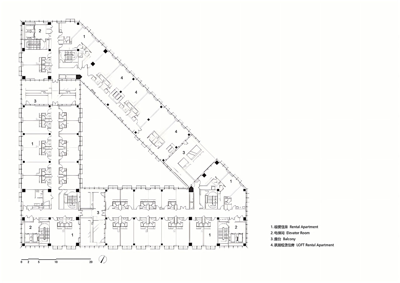建筑内部通过清晰的功能分区构建起空间秩序。为满足消防规范,将连续的建筑体量划分为三个部分,分别成为一个独立的消防分区。从门厅到电梯厅,从走廊进入公寓,形成从公共到私密的递进的关系。