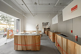 我们用一张由300个箱套组成的长吧台来定义空间内的发生,构成最直接的空间交互体验。通过玻璃台面的通透度,实现箱套元素完整的体块逻辑。设计颠覆了传统布局逻辑,将咖啡师与客人的位置对调,看似取消了客人之间面对面交流的空间,实则将视野引向窗外。所有座位面对窗景,强化空间的方向性,凸显画廊空间本身的特质。