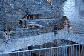 曲水流觞的对面一片空白用地,施工时挖出的土方堆土成为微小的坡地,此地块可定位为小型花园。与学院老师交流,此处因空地常作为学院活动场地,遂在坡顶的处增加舞台的功能,设计一人小剧场,既成为舞台,也可做剧场,同时兼顾可供休憩的座椅。花园整体栽植乡土野草,成为剧场自然的基底。设计师和工会50多名老师一起创作施工,将钢筋作为线条,在立体三维的空间中直接创作,成果像拆盲盒,有充满惊喜的期待值。最后小小的花瓣剧场成型,几组排线相互依托,将力学和美完美合一。