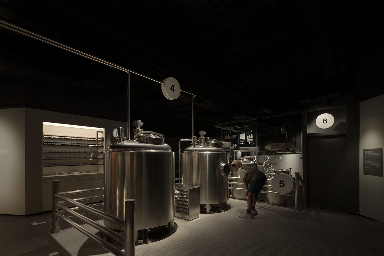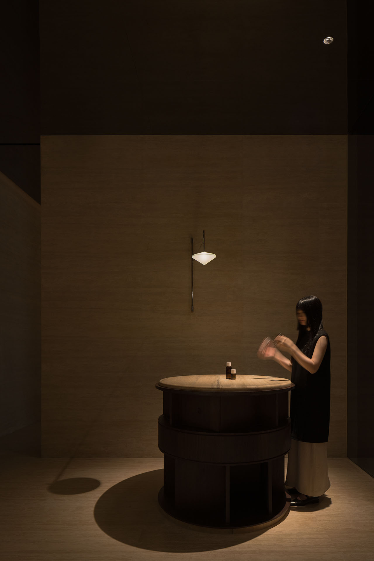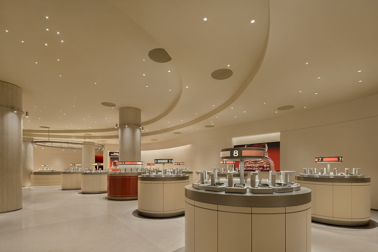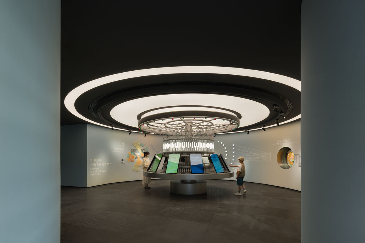 位于参观动线最末端的负一层DIY调香工坊,以圆柱形岛台为最小单位,提供从香水、香薰到香氛蜡烛的个性化创作与定制DIY平台,满足观众在观展结束后想要调配一瓶专属香水的创作欲和探索欲。