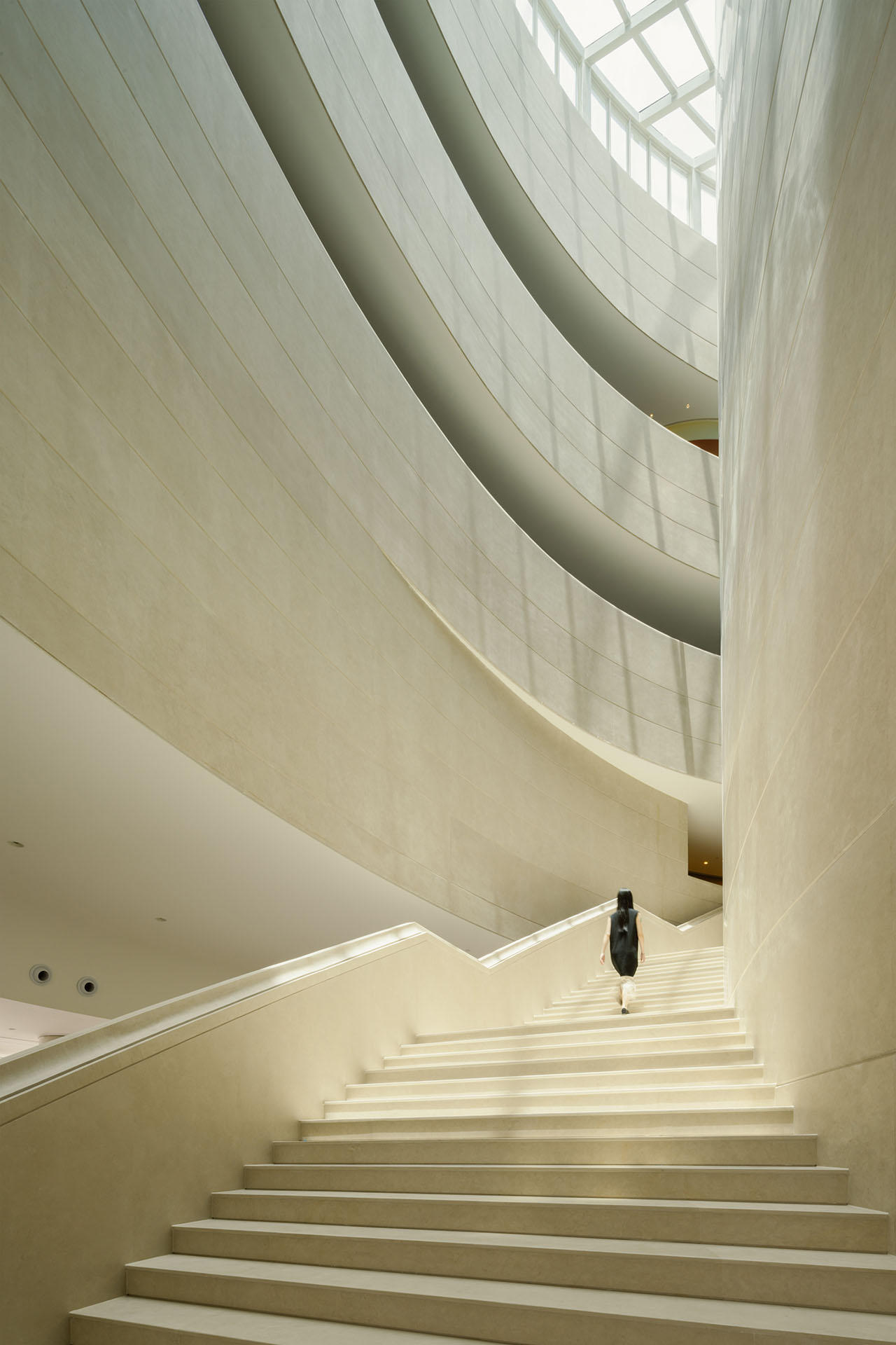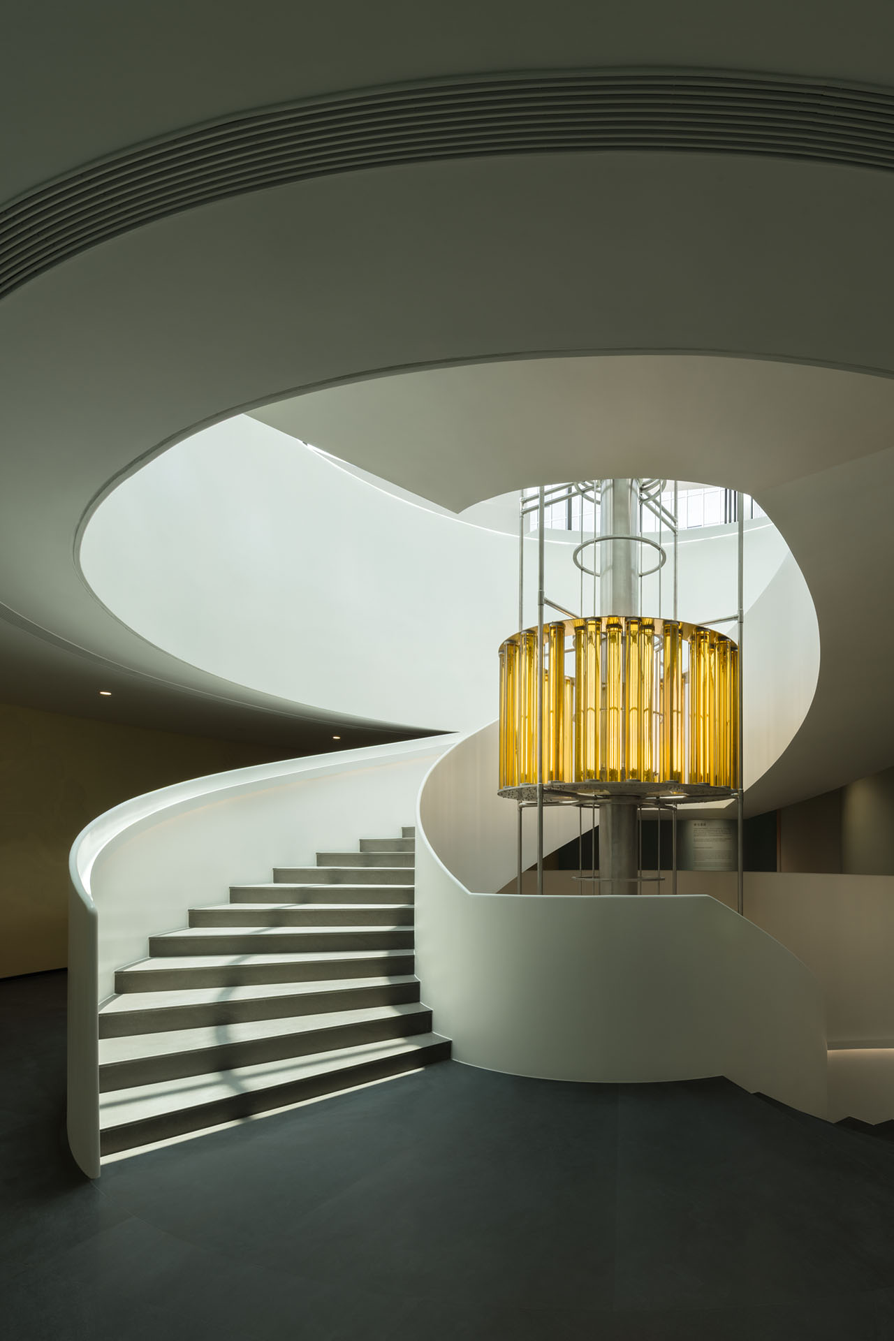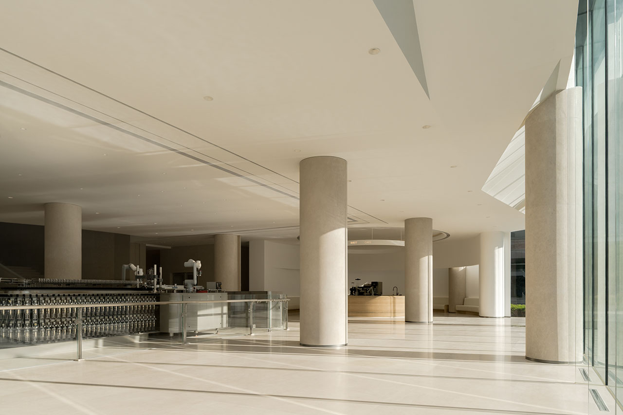 建筑形态以香水蒸馏桶的形体为原型,从历史汲取灵感。在原建筑设计基础上,立品将博物馆公共空间大面积留白,以中庭为中心,通过自然光影与建筑空间的呼应,进一步营造首层的通透性与轻盈感,使其宛如一个「光之容器」,在明暗交错间,感受气味无形却相生相息的流动力量。