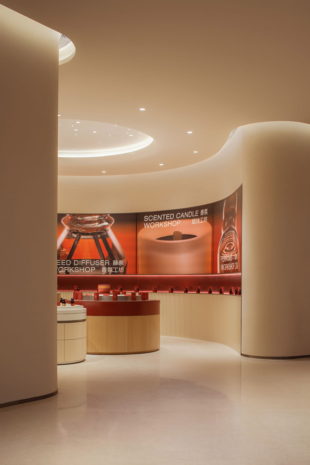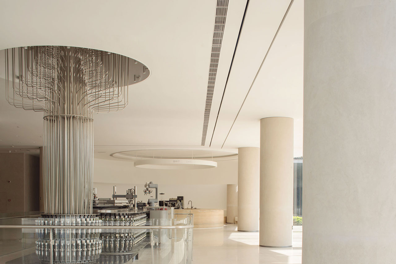 空间依托原有建筑框架,根据体验规划设定路径,同时融入品牌视觉的基础概念,将香气流动与扩散的轨迹抽象提炼,结合自然采光条件,使空间形成连贯而独特的视觉表达。