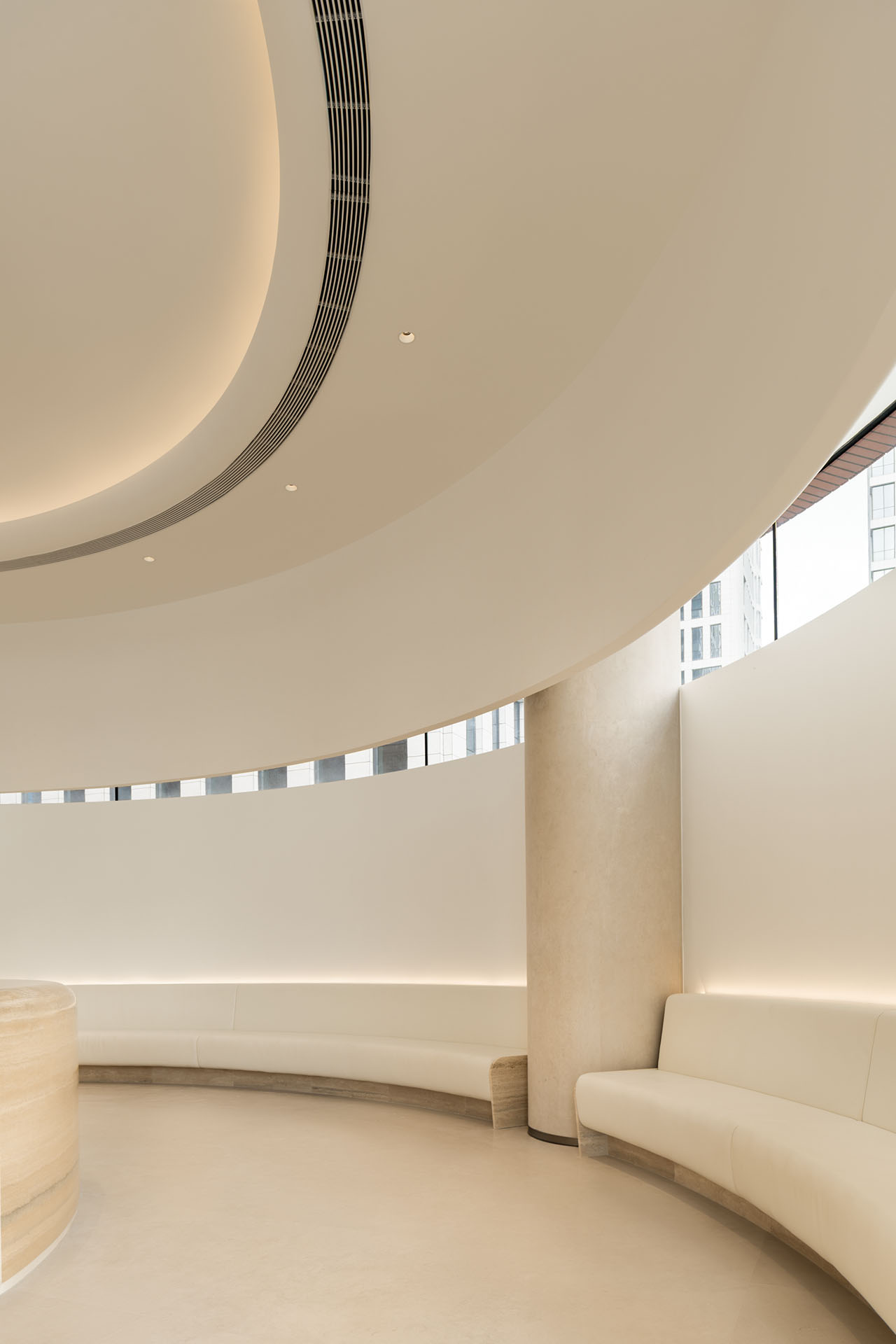 首层作为公共区域,集零售、服务、调香装置板块于一体,形成香氛文化的“体验入口”。楼梯既是公区核心动线,也是空间叙事中香气扩散的起点。中空处的弧形墙梯与倾泻而下的自然光交互映衬,形成入口处最生动的空间体验。