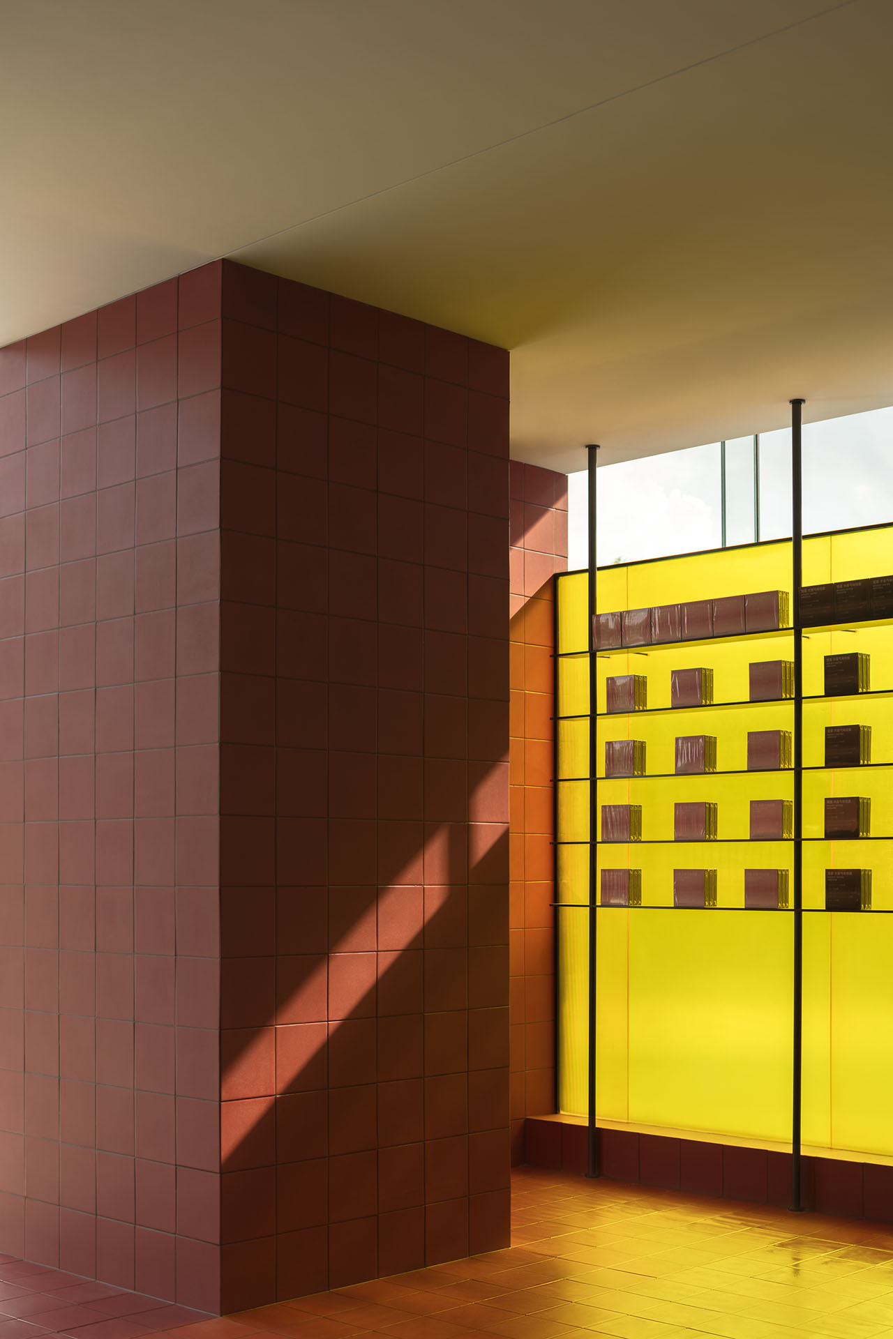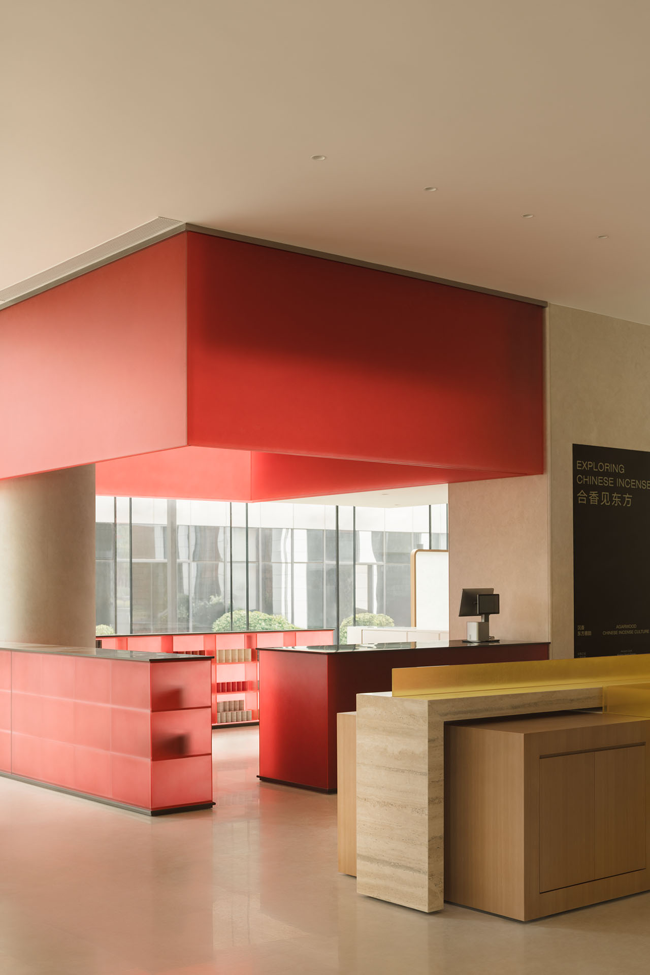 零售区以半透亮的高明度色块,在整体素净的大空间中,点亮产品陈列的货架,如香味的前调一般,轻快调动观众的游览情绪。