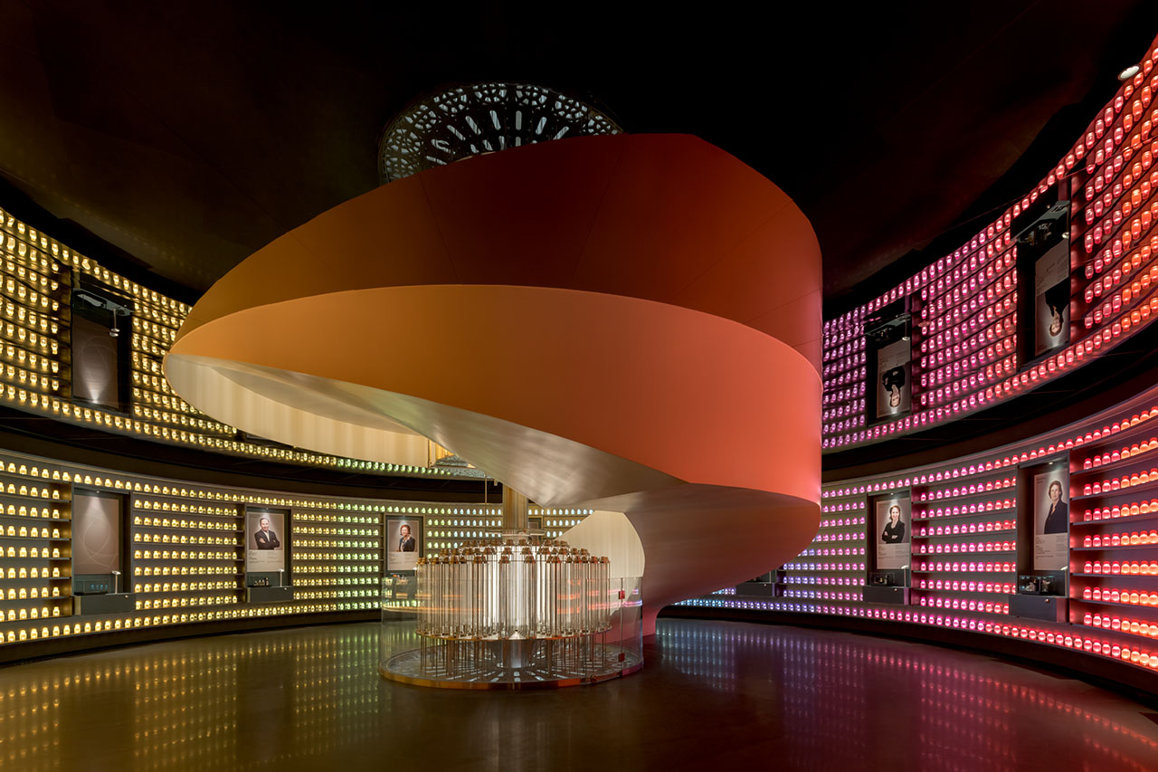 装满香精的通透罐体放射状排列悬吊在每层展厅的环形楼梯处,同时也成为上下楼梯的视觉焦点。顶层装置通过吊挂结构将光影切割,观众在此间移动,共同创作出独一无二的定格画面。