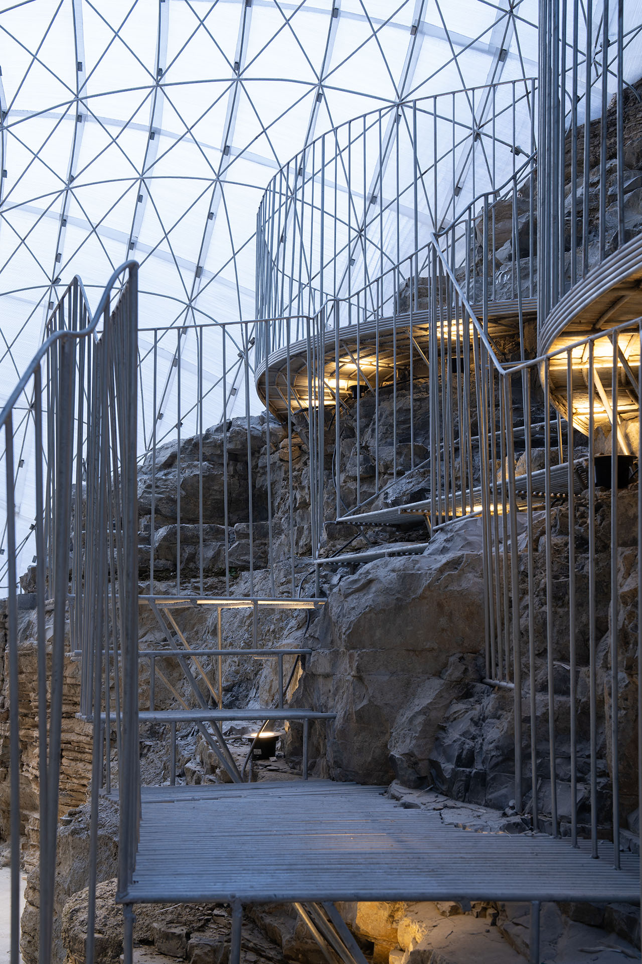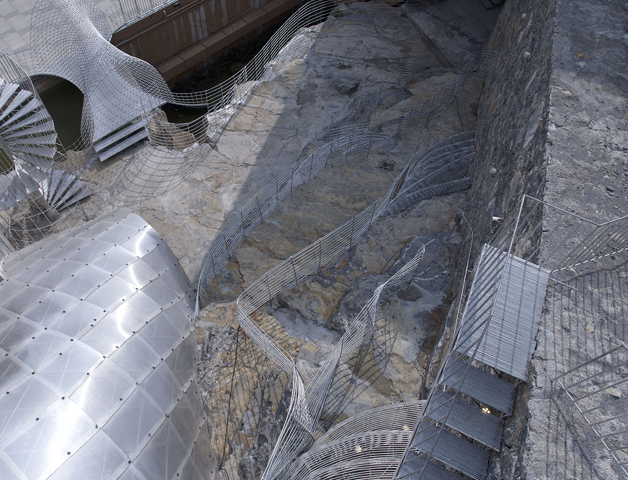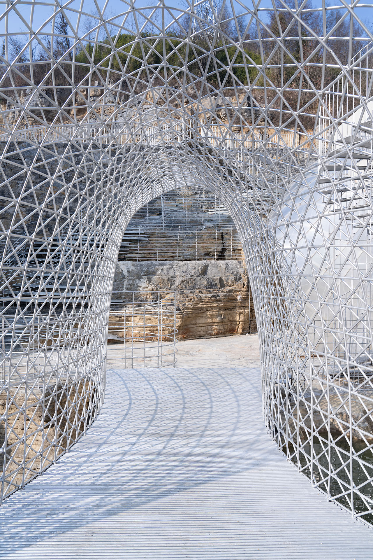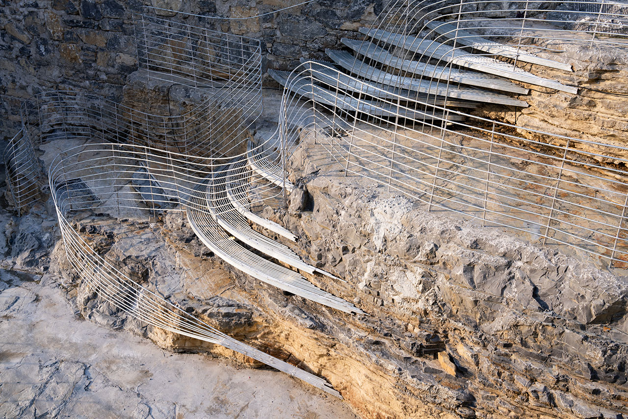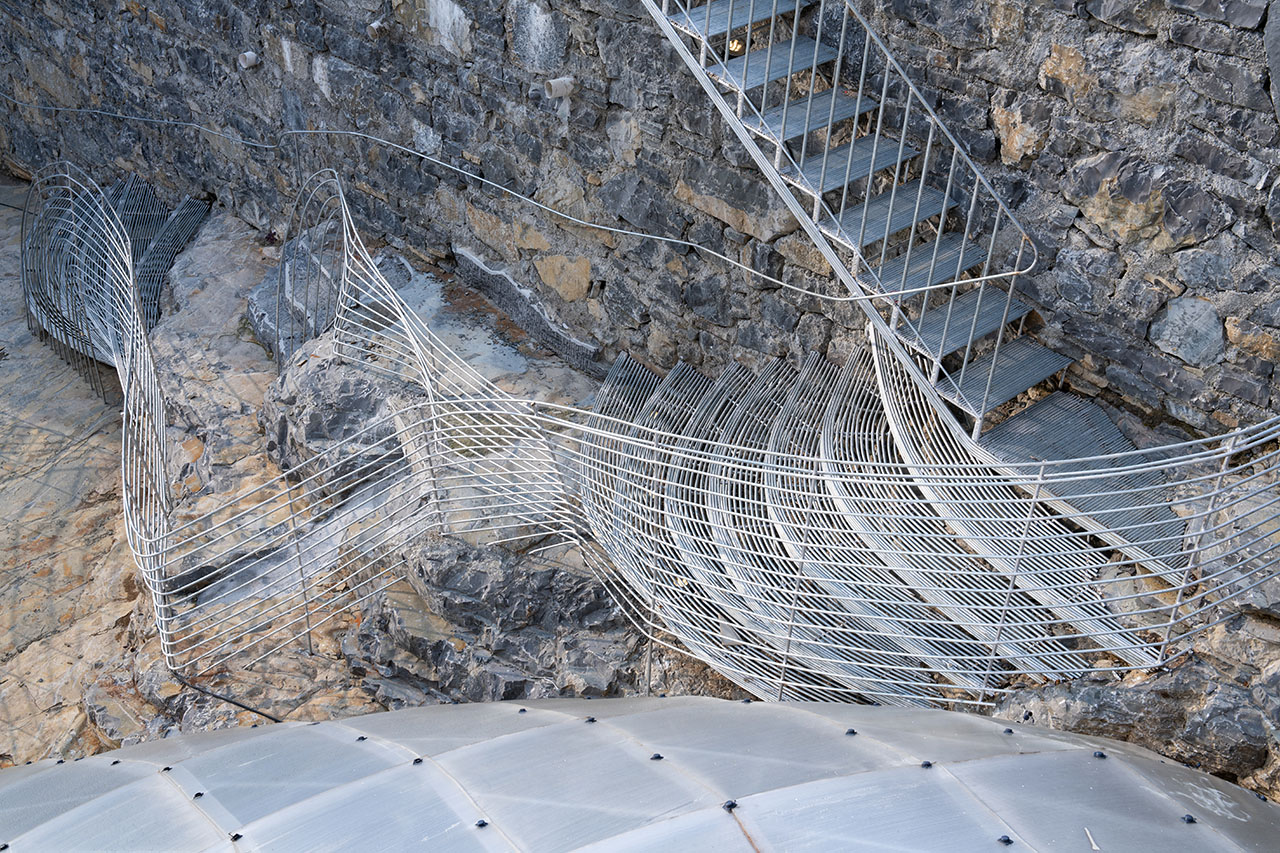 为了上部道路的稳定性,通道的左上方砌筑了石墙,步道也自然从人工石墙上生长出来,钢筋线条的光影投射在岩石上形成韵律感,坚硬粗犷的岩石与细腻柔和的钢筋形成对比。