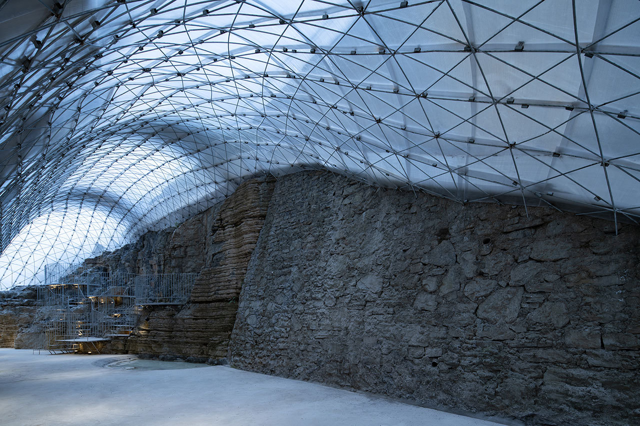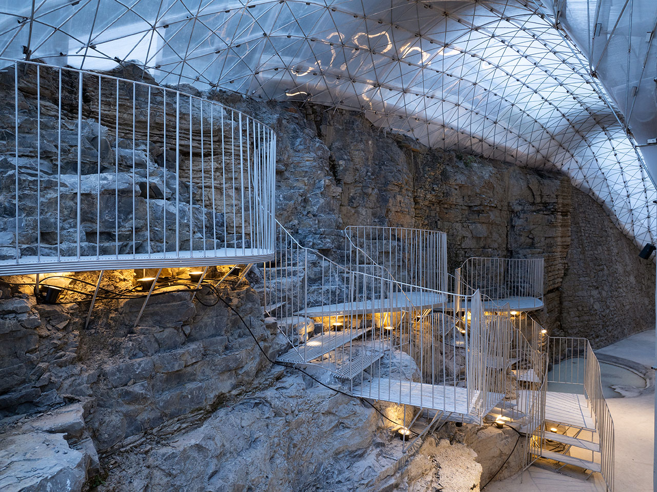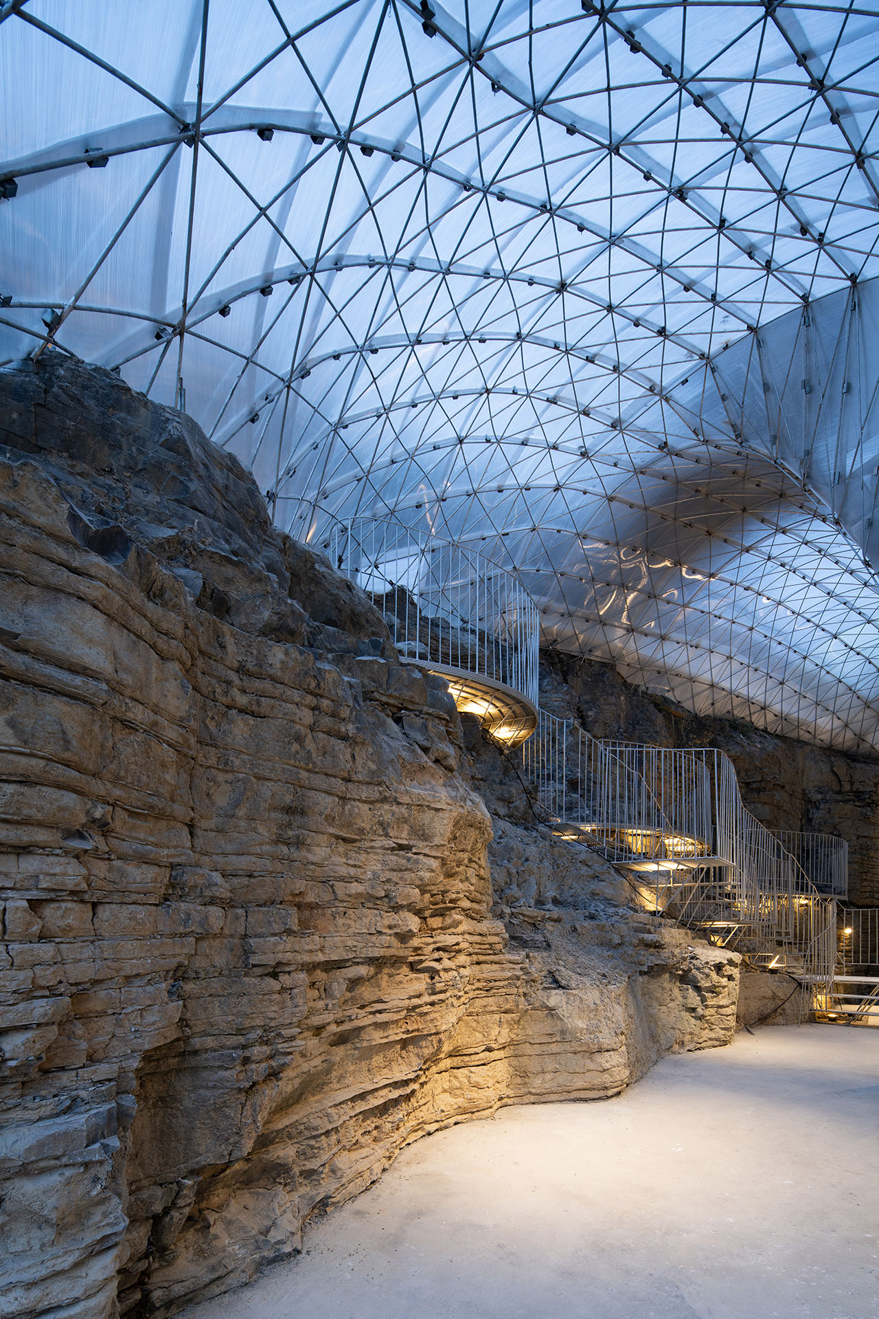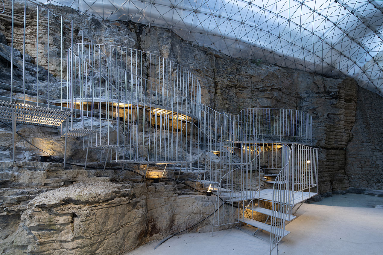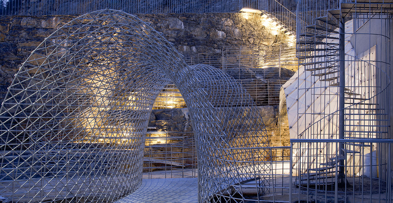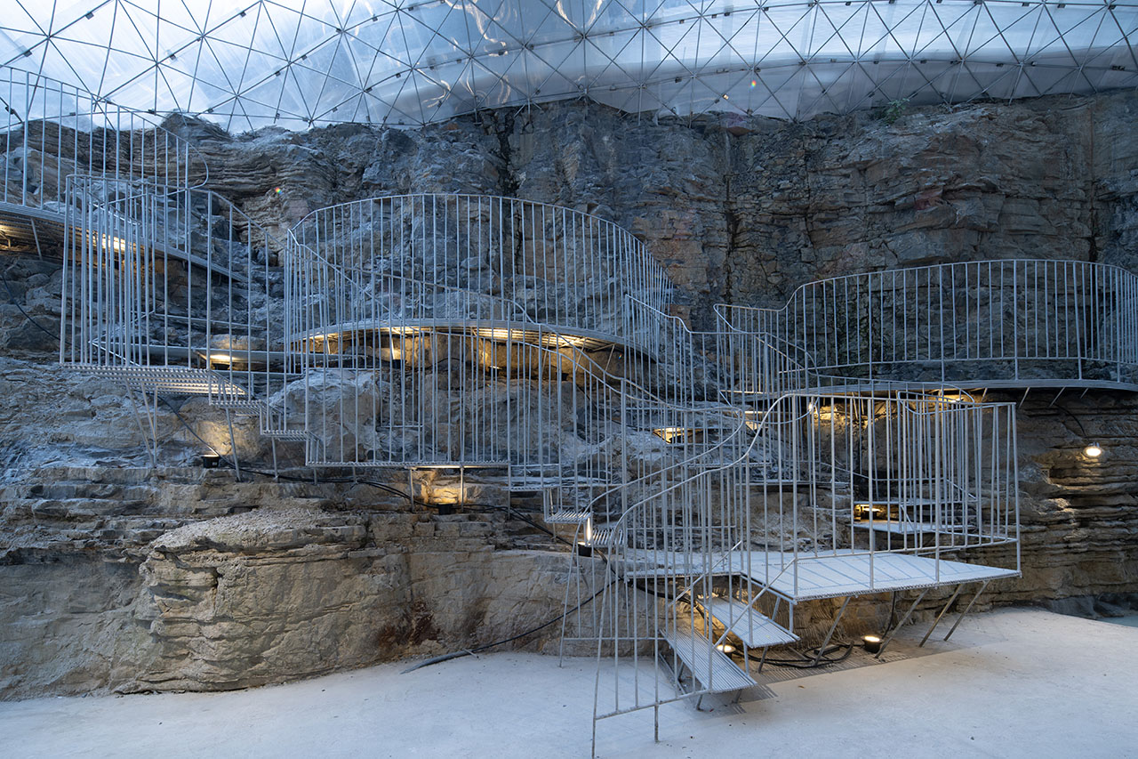 为了上部道路的稳定性,通道的左上方砌筑了石墙,步道也自然从人工石墙上生长出来,钢筋线条的光影投射在岩石上形成韵律感,坚硬粗犷的岩石与细腻柔和的钢筋形成对比。