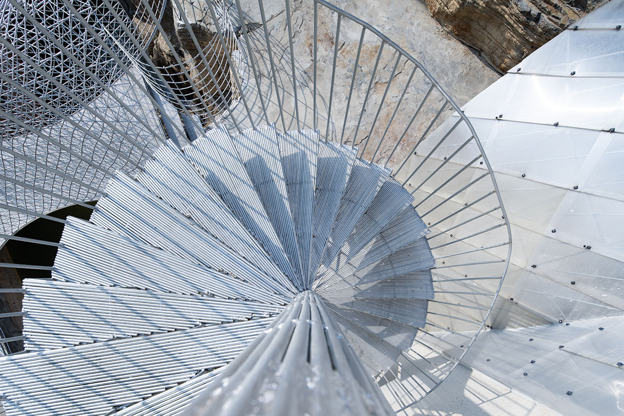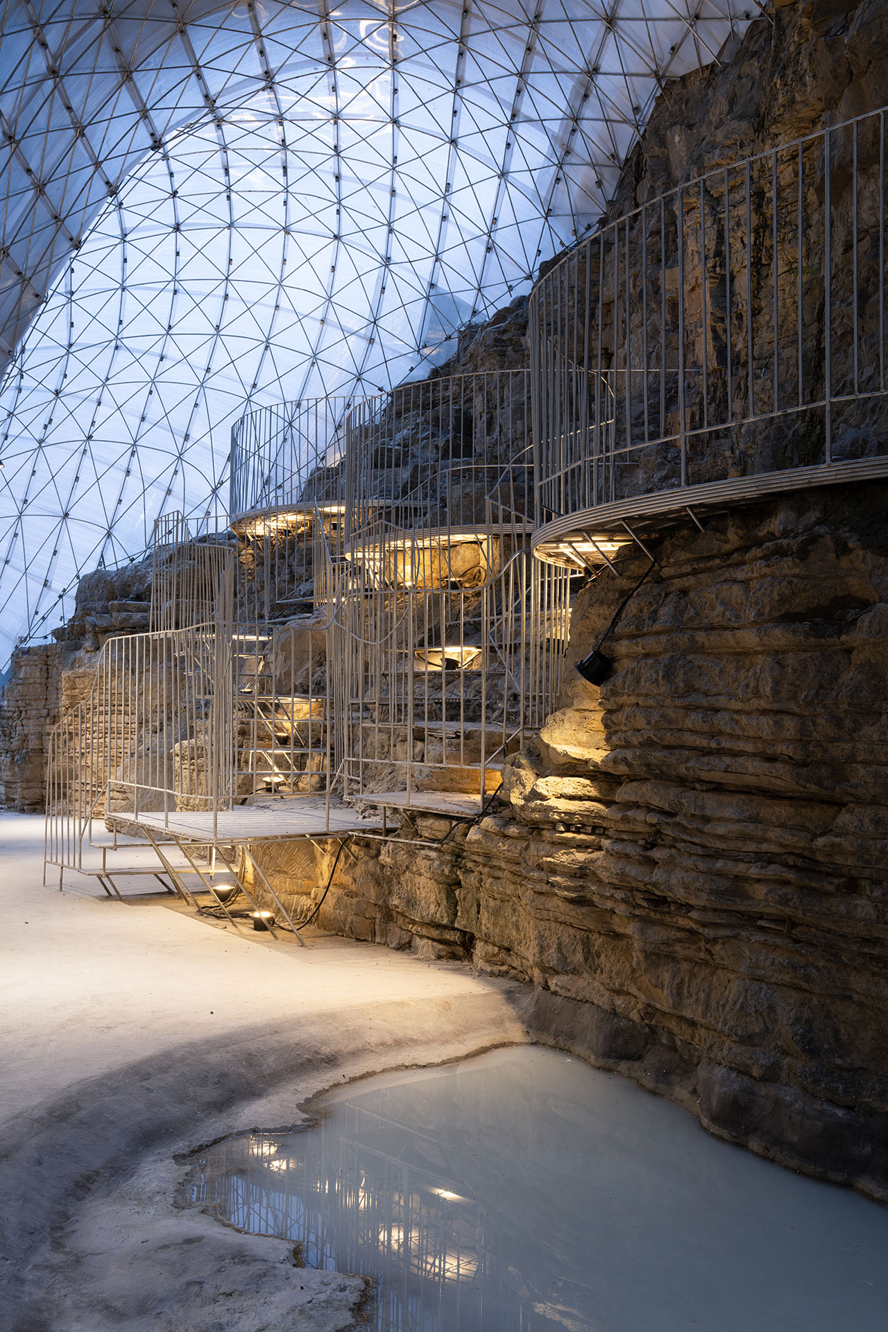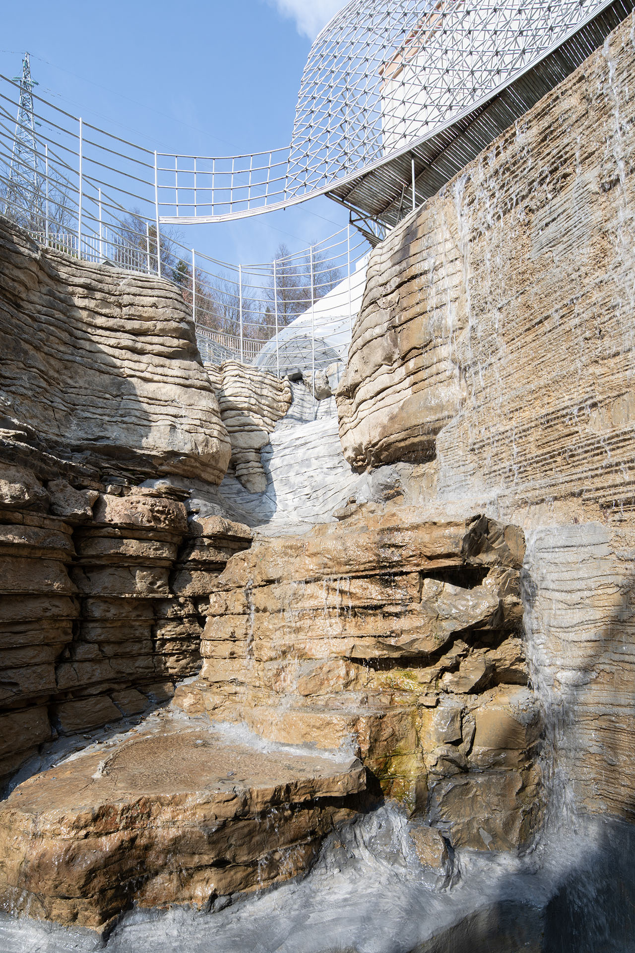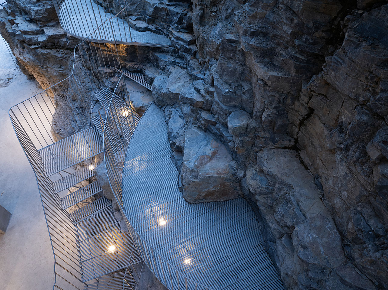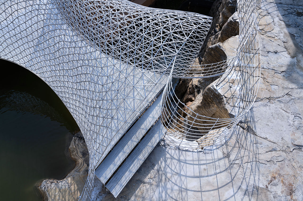 商业街步行道与悬崖底部的石台之间,一道天然空隙被巧加利用。此处凿池引瀑,飞瀑倾泻而下,其顶端顺势架起一座廊桥。这座廊桥以钢筋编织成通透网构,日光穿网而过,在金属桥面上投下斑驳交错的光影,如碎金流动,如梦似幻。从谷底仰望,透过朦胧的水幕望向网桥,飞流与网影相映,更成一幅灵动的动态画卷。为呼应整体设计语言,商业街一、二层平台以钢筋旋梯相连,螺旋而上的线条不仅串联起网桥,更与崖洞咖啡馆的室内入口无缝衔接,让几处交通空间在流动中相互渗透、叠合,形成步步皆景的过渡序列。