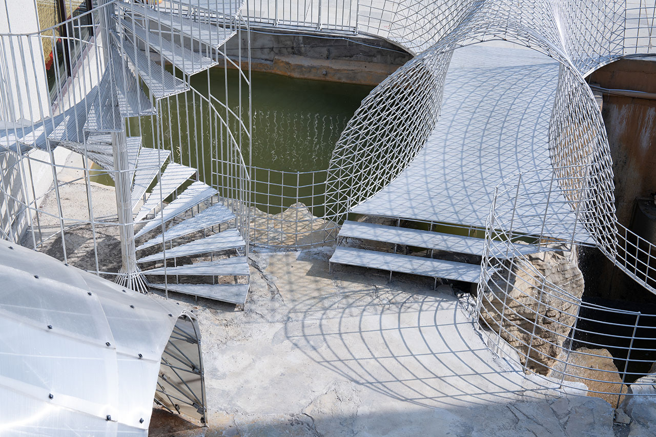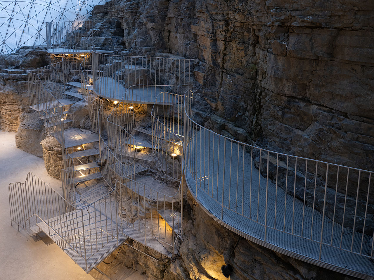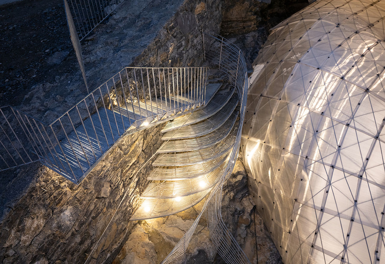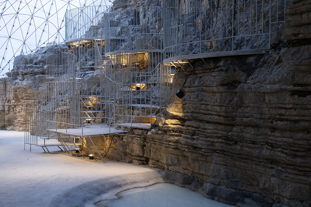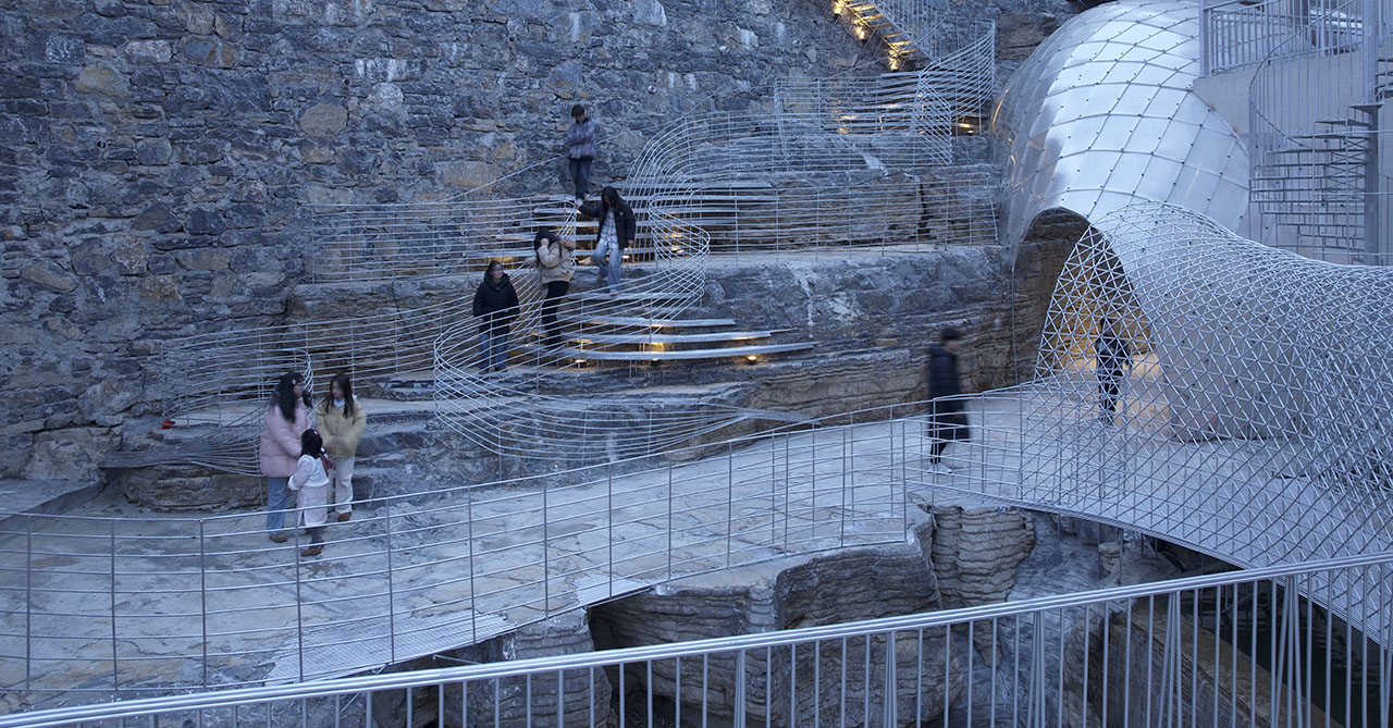 商业街步行道与悬崖底部的石台之间,一道天然空隙被巧加利用。此处凿池引瀑,飞瀑倾泻而下,其顶端顺势架起一座廊桥。这座廊桥以钢筋编织成通透网构,日光穿网而过,在金属桥面上投下斑驳交错的光影,如碎金流动,如梦似幻。从谷底仰望,透过朦胧的水幕望向网桥,飞流与网影相映,更成一幅灵动的动态画卷。为呼应整体设计语言,商业街一、二层平台以钢筋旋梯相连,螺旋而上的线条不仅串联起网桥,更与崖洞咖啡馆的室内入口无缝衔接,让几处交通空间在流动中相互渗透、叠合,形成步步皆景的过渡序列。