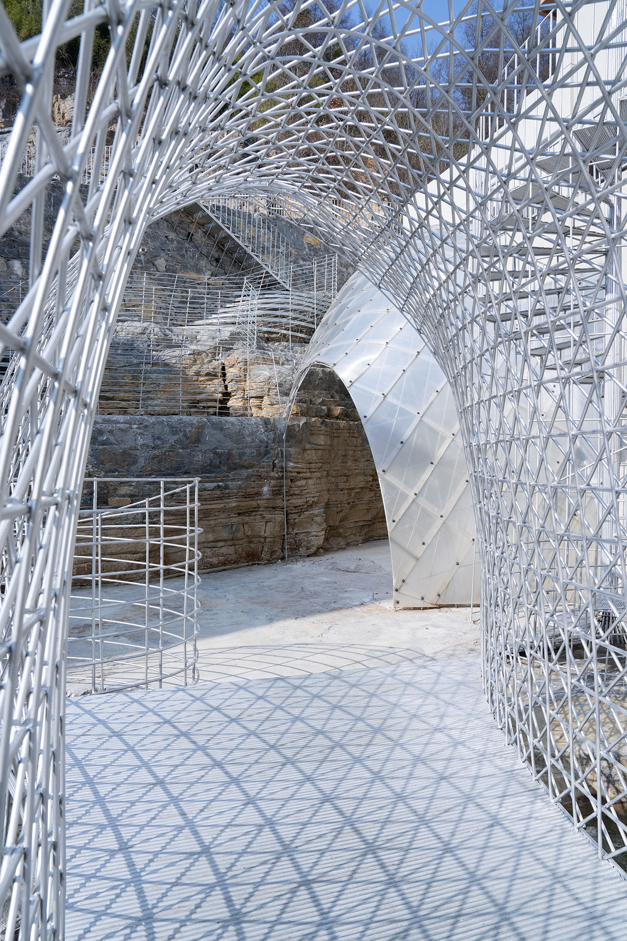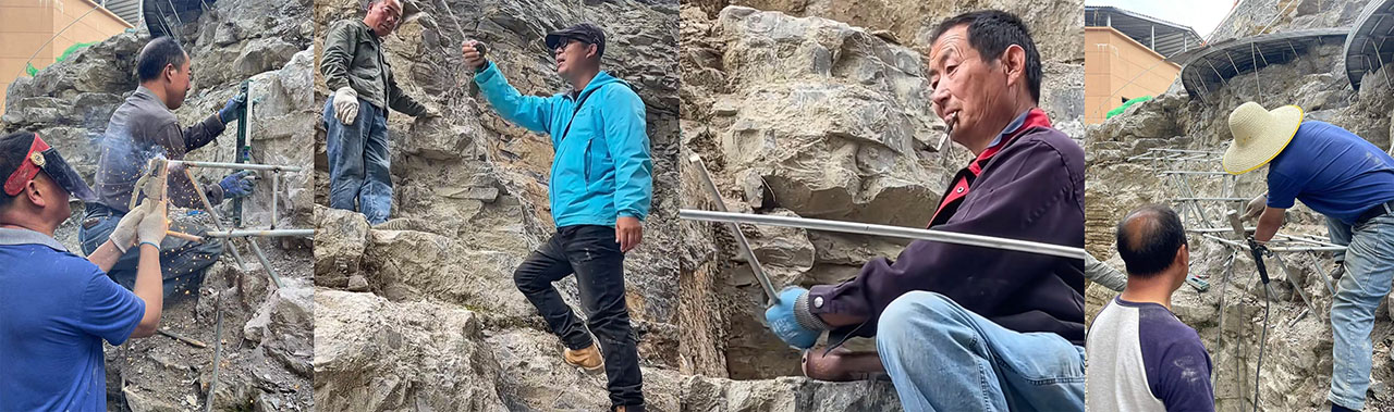 鉴于现场地形及空间肌理复杂,项目要求采用在地设计与营造模式。工作室延续既有乡建营造经验,通过与当地工匠深度协作,以在地化创作响应空间需求。项目继续沿用工作室成熟的钢筋编织与焊接工艺,旨在以低介入度设计凸显崖体岩石本底之美,同时控制建造成本。视觉层面,纤细钢筋经多元组合形成整体形态,呈现出 “岩石之上钢筋之舞” 的空间意象。
