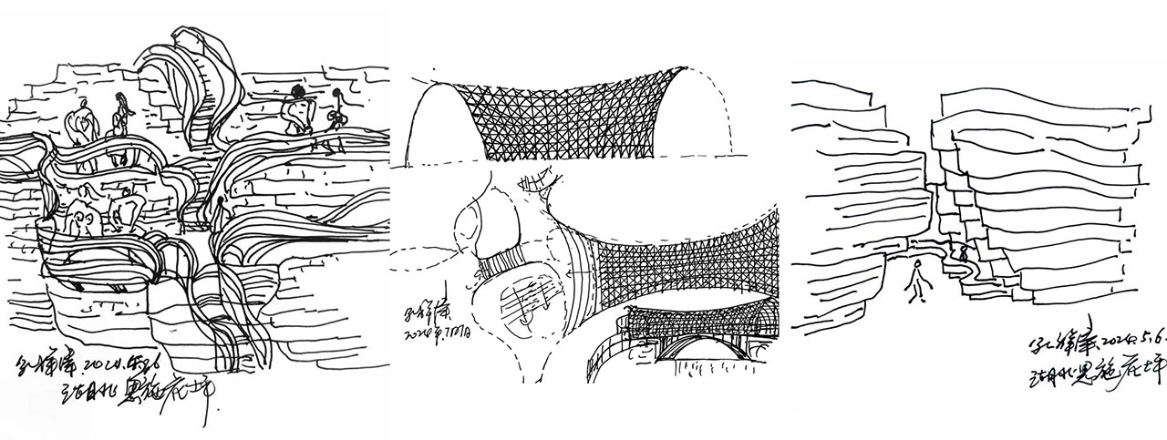 核心建筑是依托于悬崖和商业街架空层而建设的咖啡馆。该咖啡馆以悬崖山体与商业街架空层为双重依托,形成独特的 “悬浮 — 接地” 复合空间。其山体侧界面分两类处理:一类为人工雕凿的原生山体,利用天然高差及雕凿形成的石质平台作为悬崖卡座,实现自然与功能空间的直接衔接;另一类为砌筑倾斜石墙,以 “留白” 方式作为室内墙面,减少人工干预实现山体与室内的过渡。针对崖体与架空层间的露天区域,屋顶采用钢筋网架与蜂窝状阳光板组合系统,形成半透明覆盖结构。该屋顶向室内延伸,与空间尽端整合为连续穹顶,既界定建筑边界,又保证顶界面完整性和顶界面的形态统一。悬崖上布置了三个半圆的平台,作为咖啡卡座,一条转折的悬崖栈道连接了三个平台。悬崖卡座及栈道施工难度较高,受崖体断面狭窄限制,需精准控制钢筋植入深度及悬挑构件平衡精度,同时协调山体开挖与结构施工时序,体现了当地工匠的地形适应能力与精细化施工技艺。