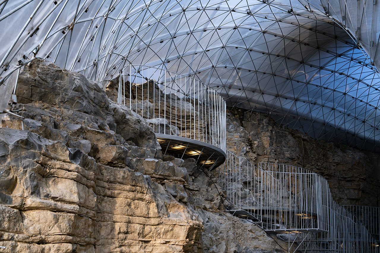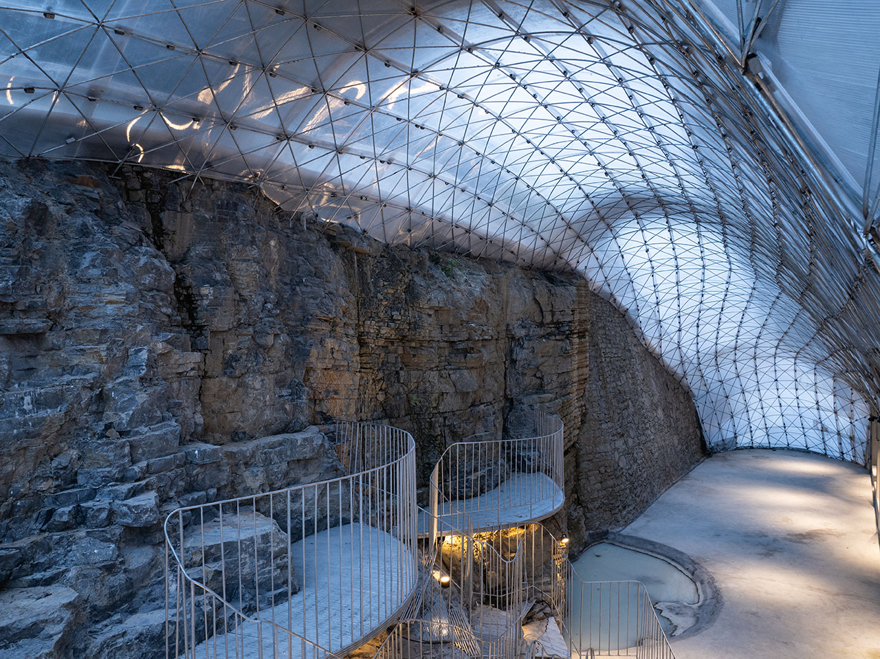 设计以 “巧借” 为核心逻辑,实现低投入空间构建:“借形” 即利用悬崖高差及雕凿山体作为卡座,省去造景与砌筑成本;“借构” 即复用架空层既有梁柱作为承重结构,减少新增投入;“借空间” 即通过屋顶覆盖崖体与架空层间灰空间,转化为封闭使用空间,提升土地利用率。结构与材料设计兼顾功能与性能。穹顶采用钢筋编织工艺,通过曲面形态分散荷载,节约材料并保证结构稳定;悬崖处三个半圆形卡座平台及连接栈道均为悬挑结构,通过植入崖体的钢筋锚固件固定,在狭窄断面内满足交通与功能需求。材料上,蜂窝状阳光板的半透明性可过滤光线,其性能适配恩施夏季凉爽的气温。