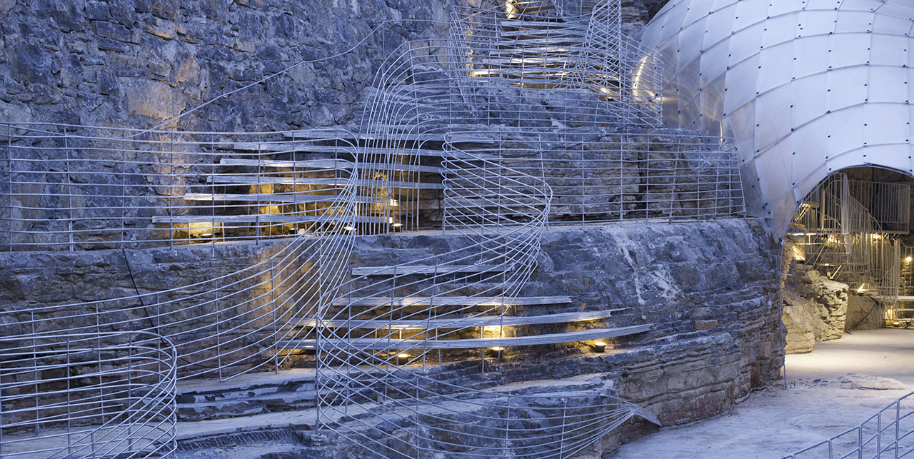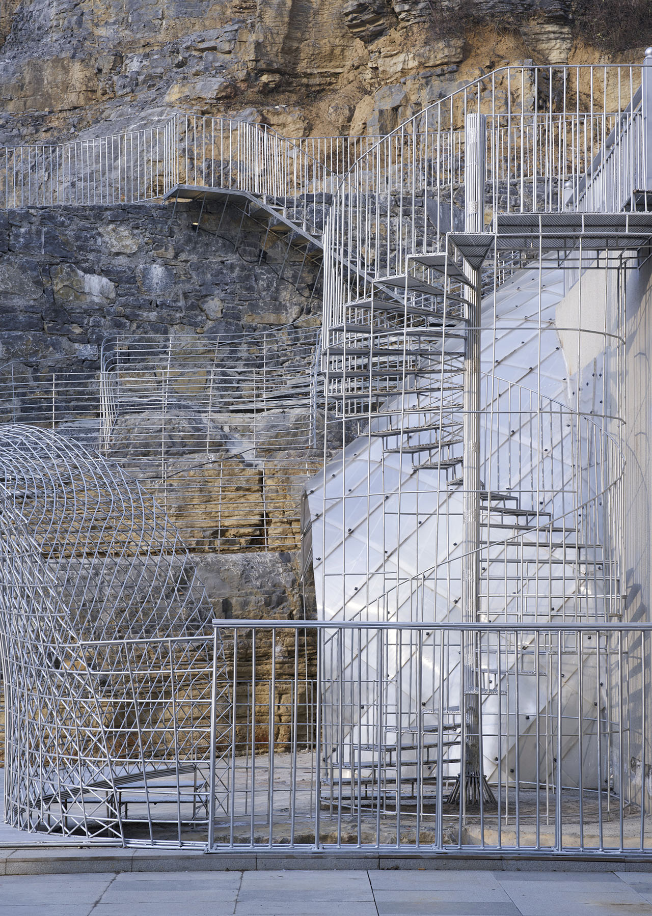 在商业街的中心位置,预留了一个天然的通道。通道连接了商业步行街与商业街后方的交通,既作为上下交通空间,也作为咖啡馆的户外空间。中心通道由系列平台组成,半数以上岩石保留了原始状态:这些石灰岩是恩施富有特色的沉积岩,其表面肌理犹如千层饼,层层累积并沿横向展开。经过局部雕凿,通道形成了四层不同标高的平台。曲线钢筋为材料的台阶衔接高差上的通达,通过打孔的方式锚固在岩石上。台阶立面钢筋的肌理和岩石的千层饼结构一致,连续的平台栏杆突出横向的线条的连续性,与岩石形成语言上的呼应。