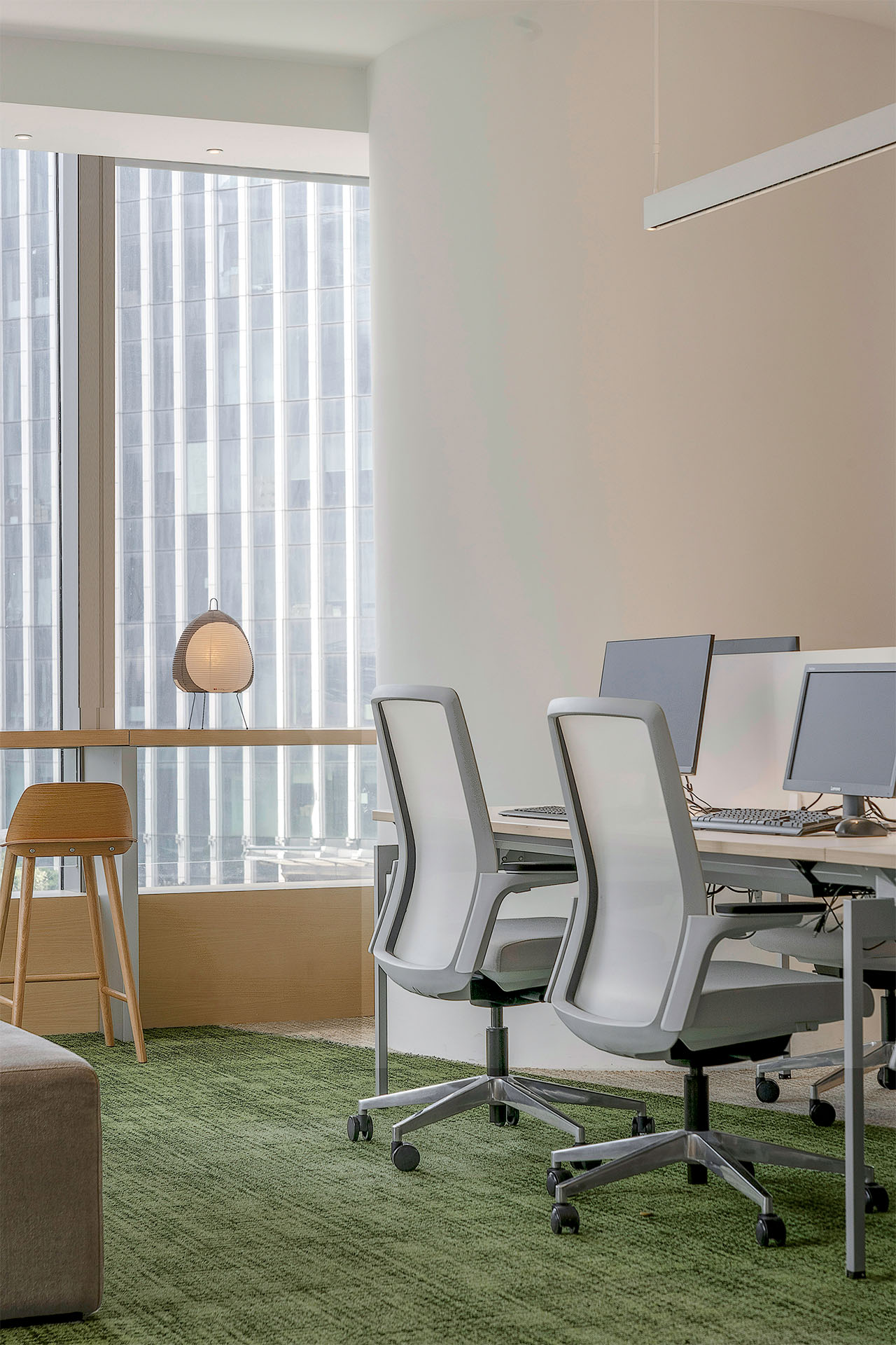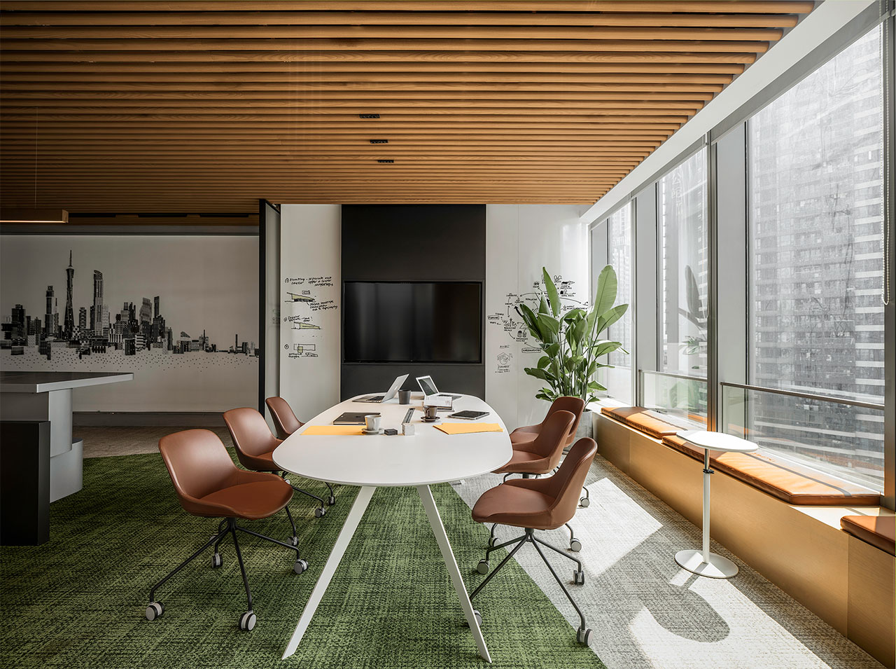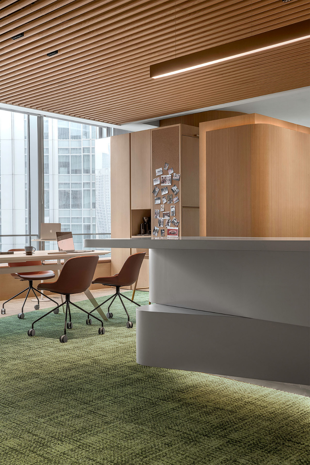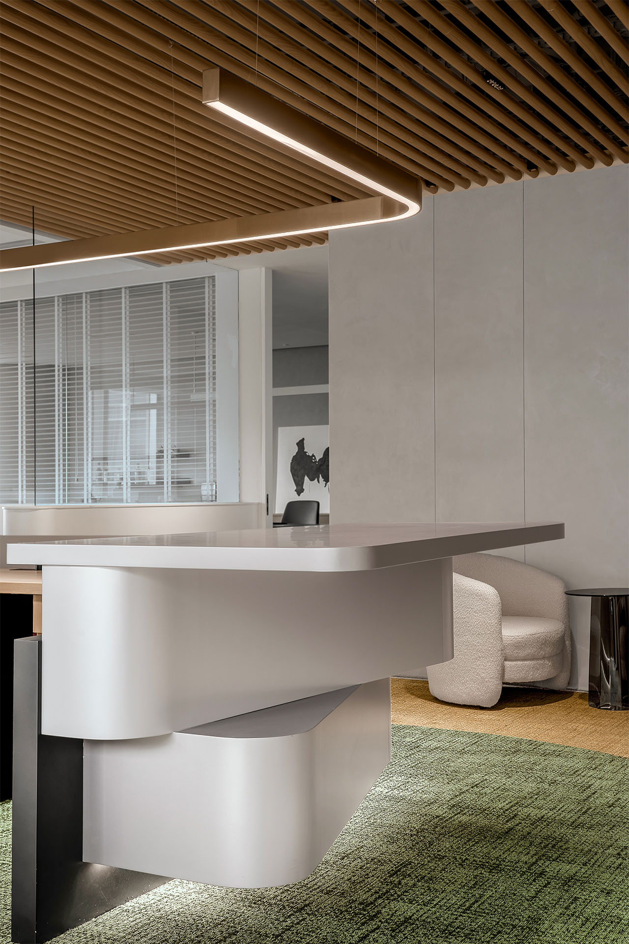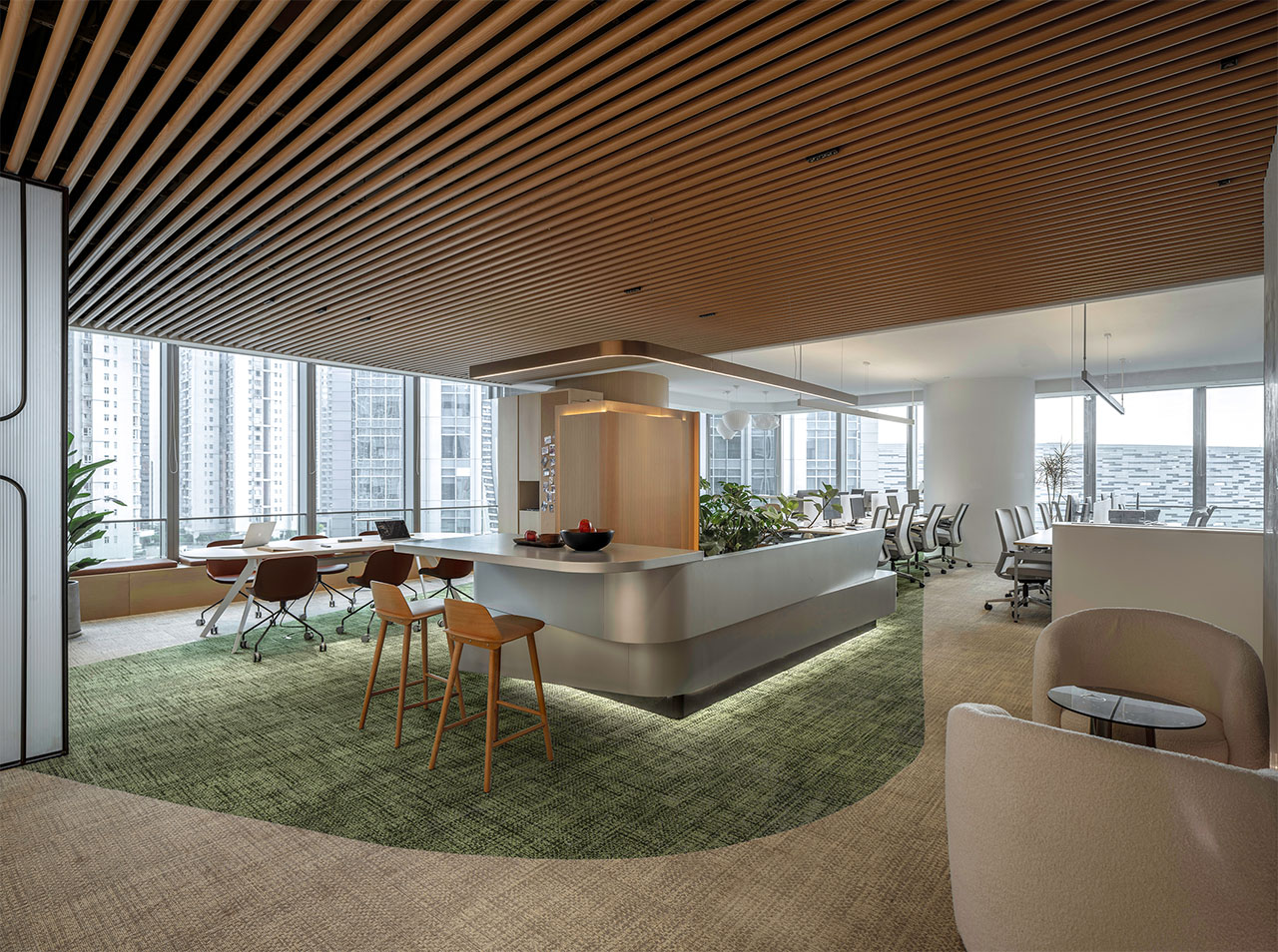 设计以“Sunshine Park(阳光公园)”为概念原点,将自然元素与开放协作深度融合,打造一个兼具功能性与精神性的办公场所。空间以木质格栅天花勾勒温暖基调,通过引入自然光线、绿植体系与柔和色调,消解传统办公的严肃感。同时搭配浅木色家具与绿色地毯,营造舒适高效的工作氛围。空间绿植系统与窗外城市景观联动,形成室内外生态呼应。