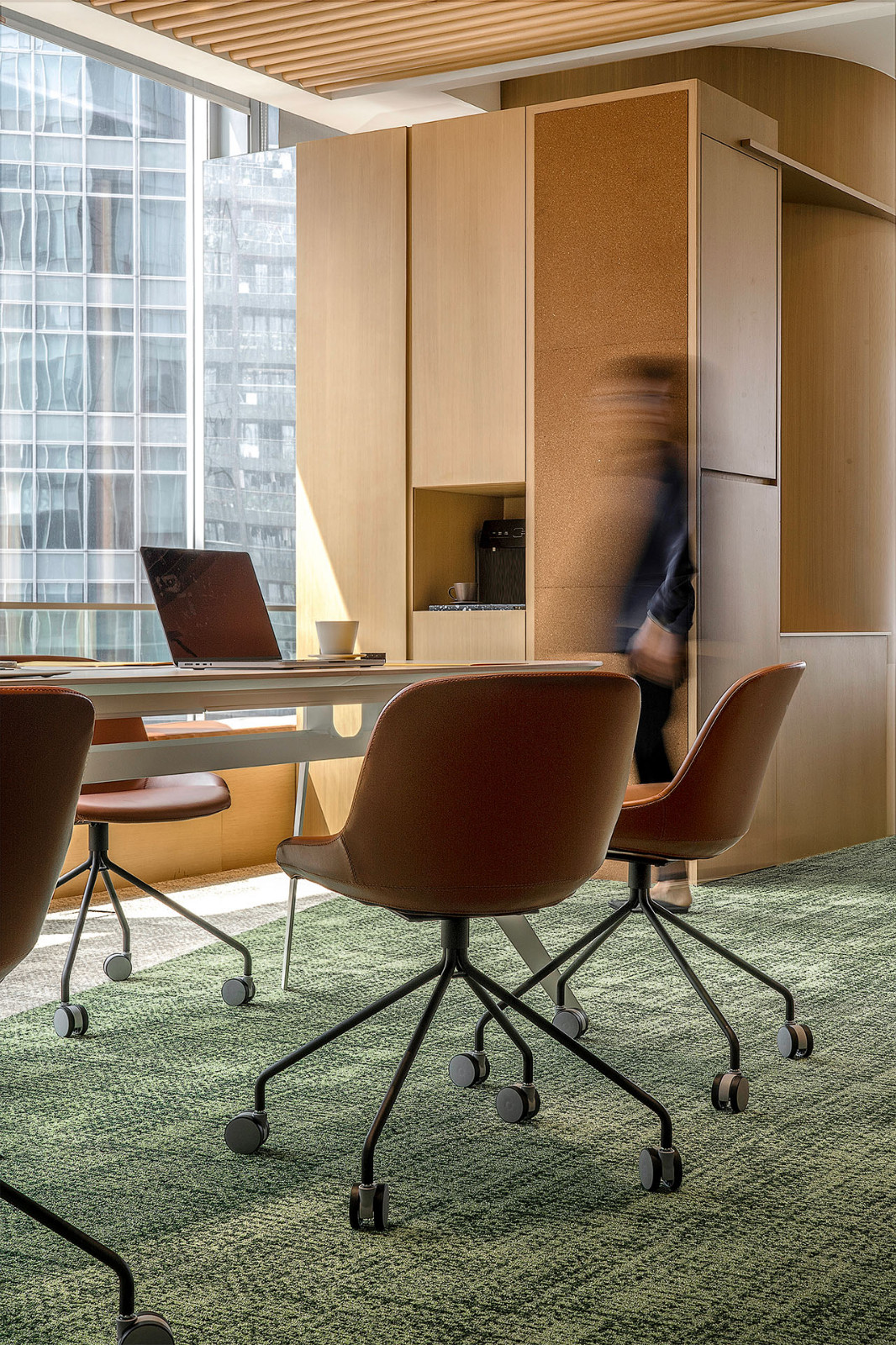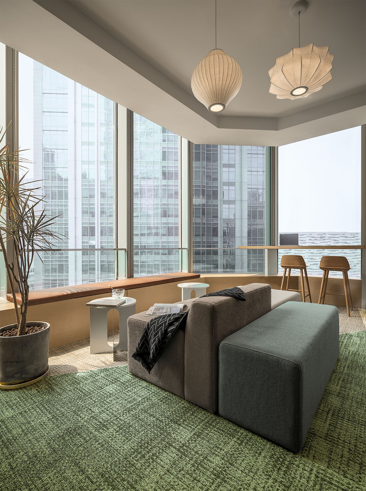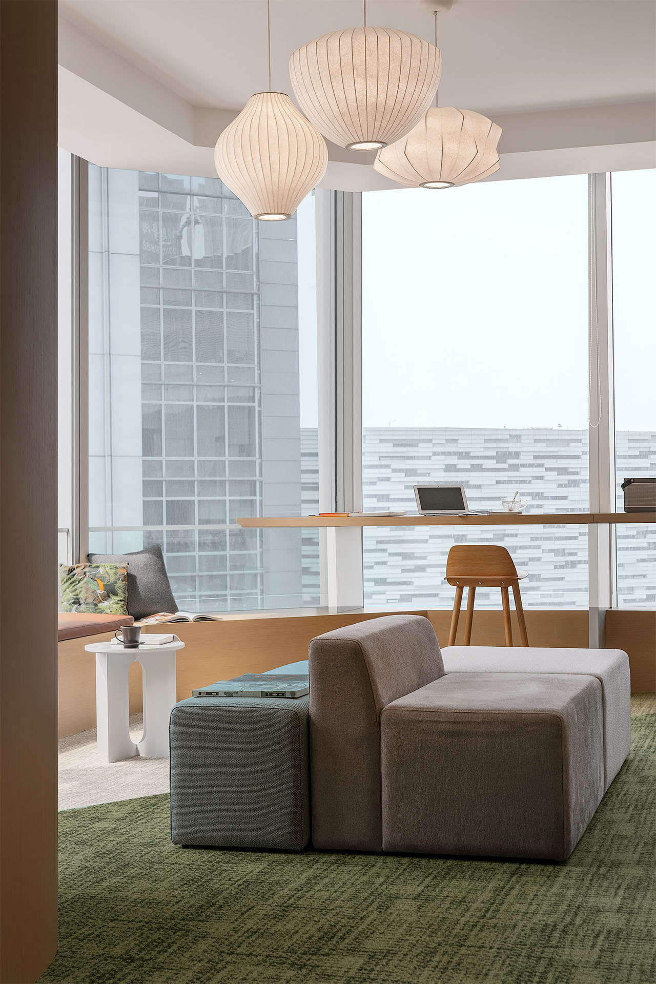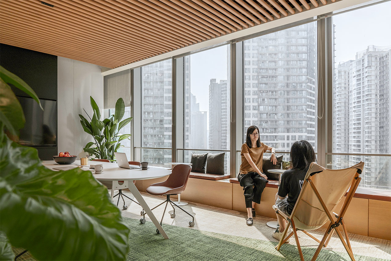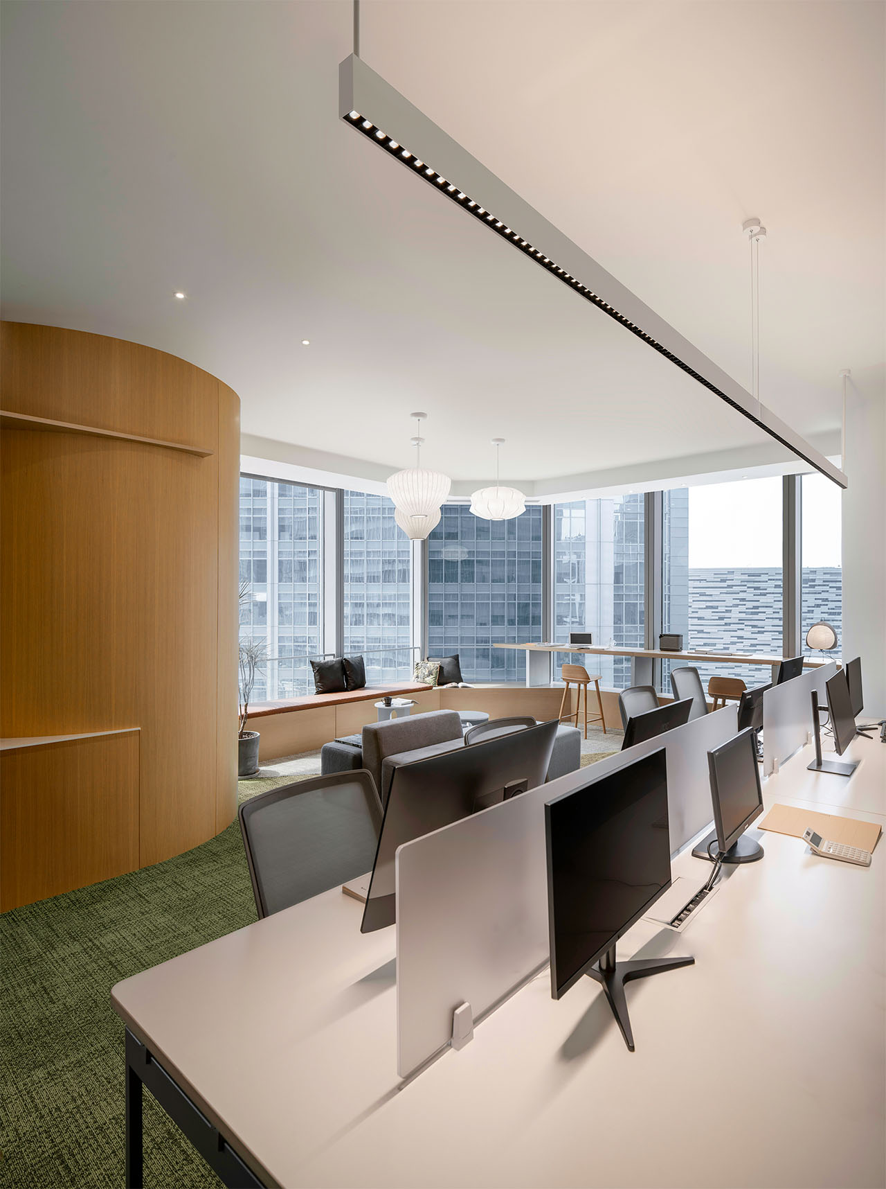 设计以“Sunshine Park(阳光公园)”为概念原点,将自然元素与开放协作深度融合,打造一个兼具功能性与精神性的办公场所。空间以木质格栅天花勾勒温暖基调,通过引入自然光线、绿植体系与柔和色调,消解传统办公的严肃感。同时搭配浅木色家具与绿色地毯,营造舒适高效的工作氛围。空间绿植系统与窗外城市景观联动,形成室内外生态呼应。