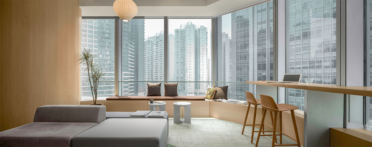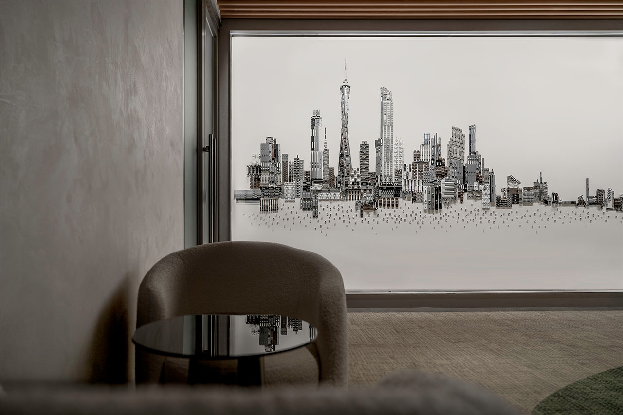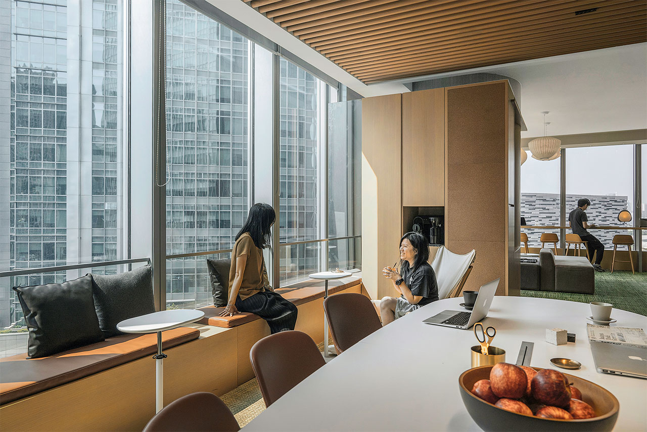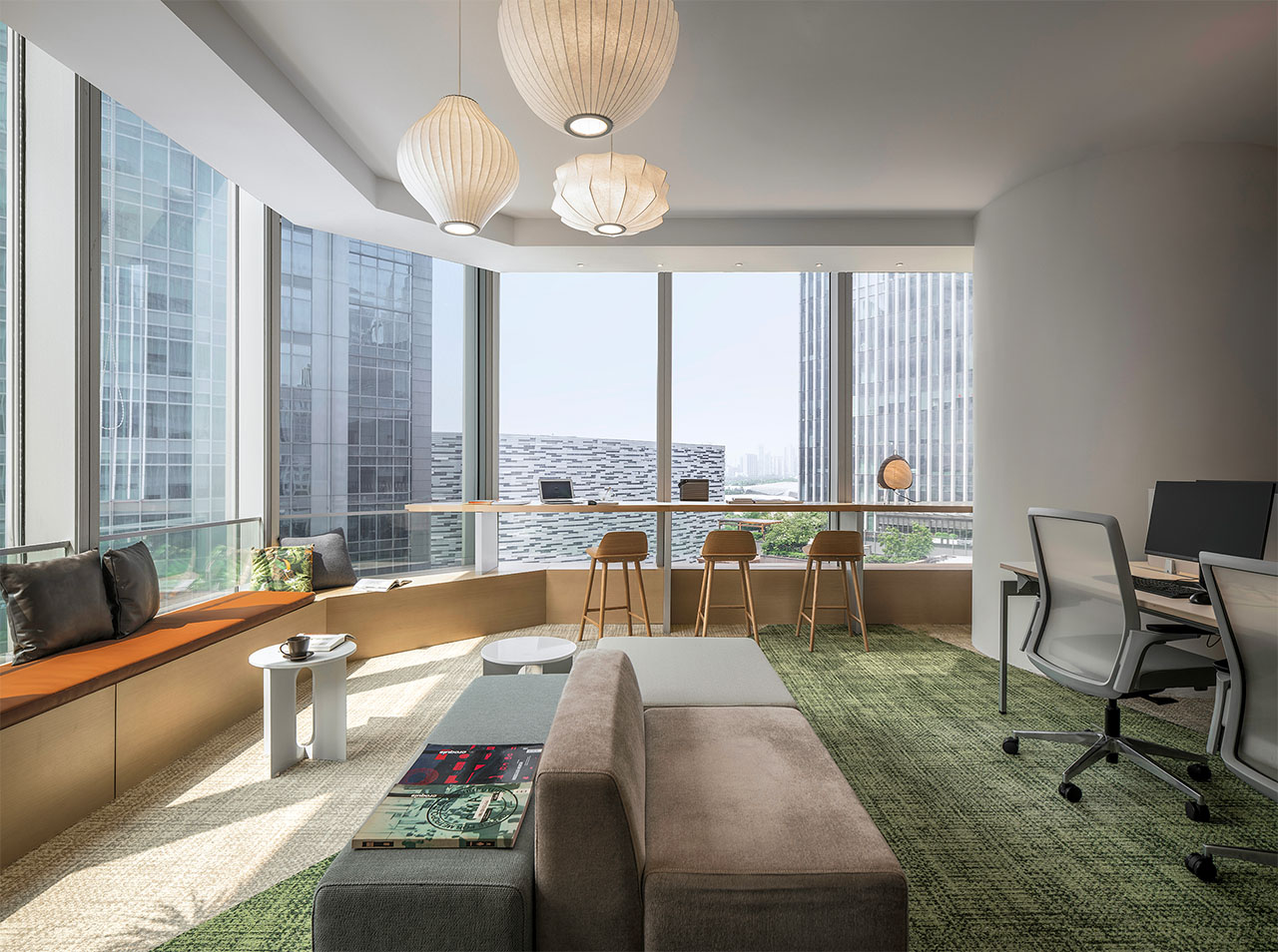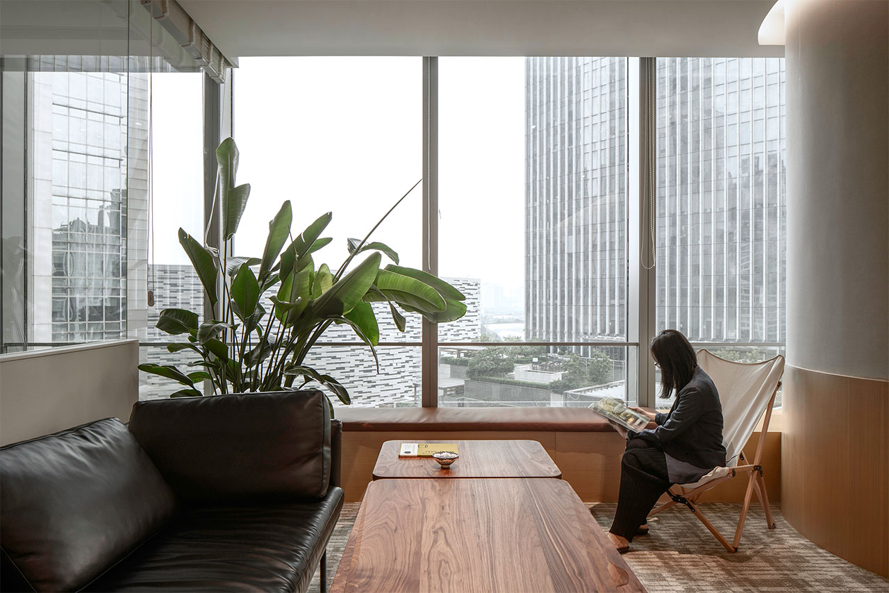 设计团队将临窗区域打造为景观吧台与休闲区,让城市视野自然融入日常,营造轻松交流的非正式场景,实现工作与放松无缝衔接。经理室与接待区则以透明立面围合,既保有私密度又保持视觉通透,配合艺术挂画、皮质沙发与暖光灯具,营造松弛且富有格调的商务场景。
