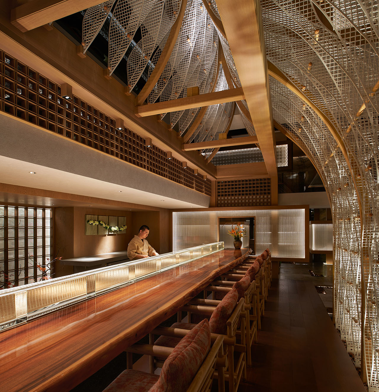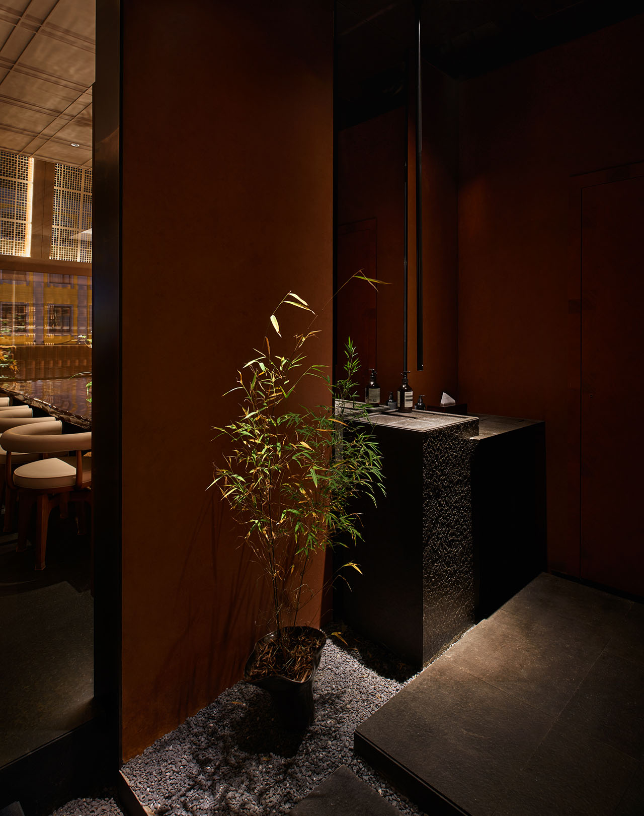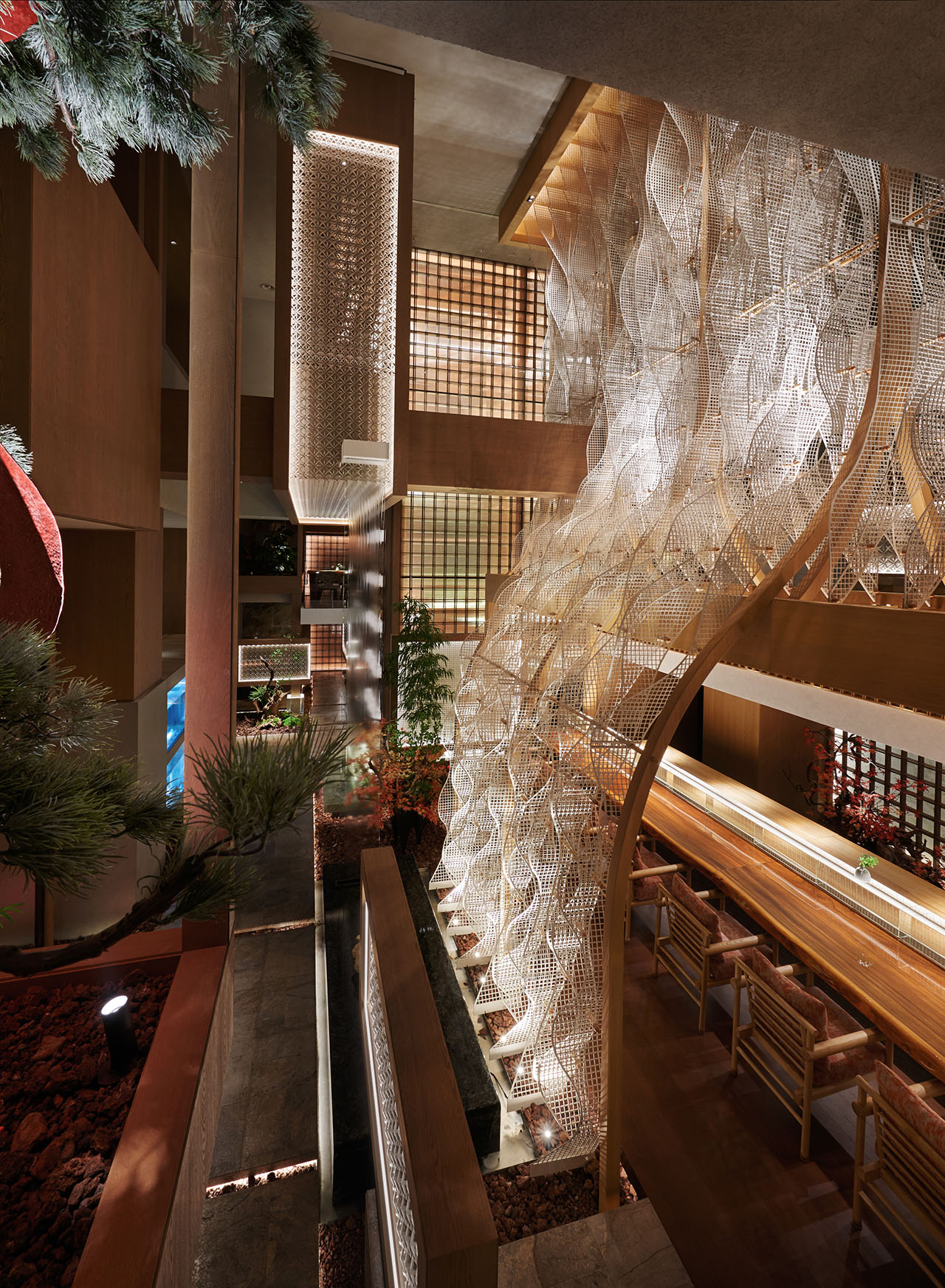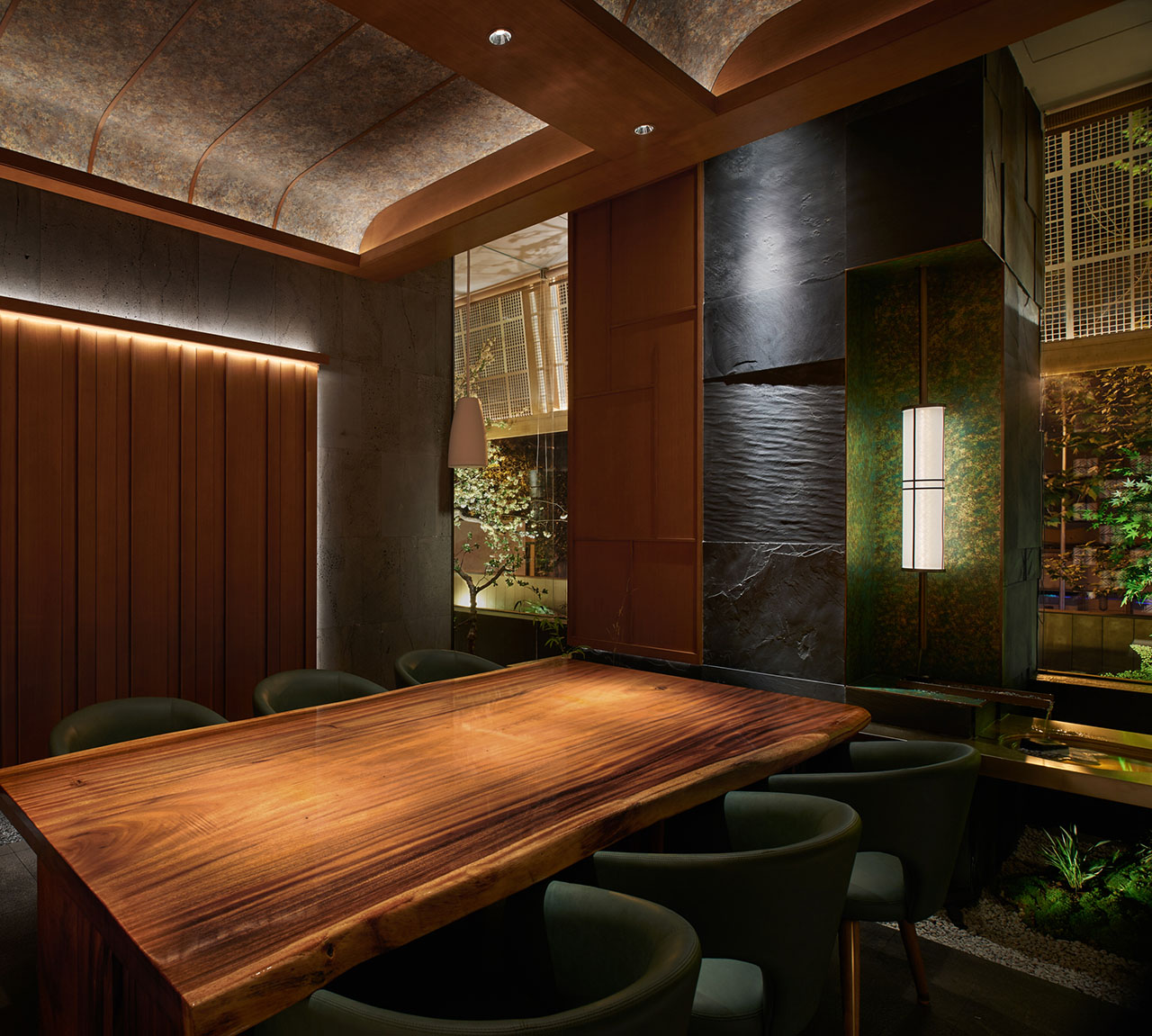 我们将日料餐厅“杉木SUGIKI”打造成城中之外、远离人烟的山林世界,食客在“林水泉石”之间感受东方美学的独特语境。