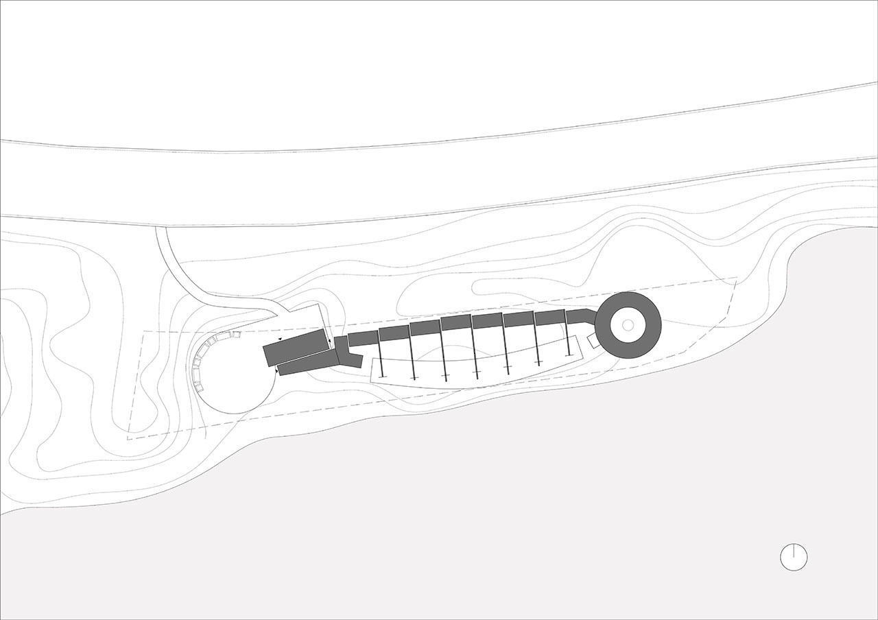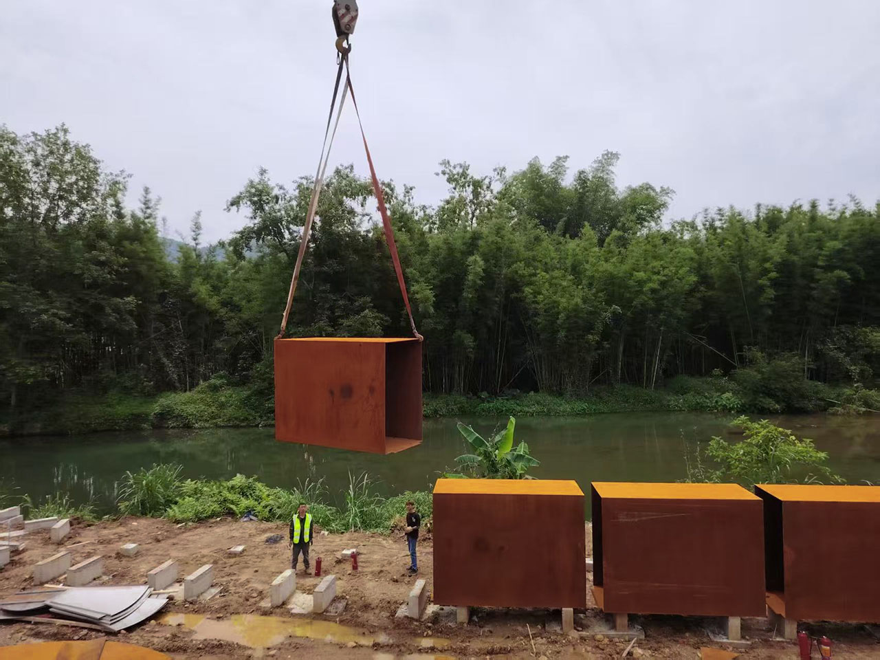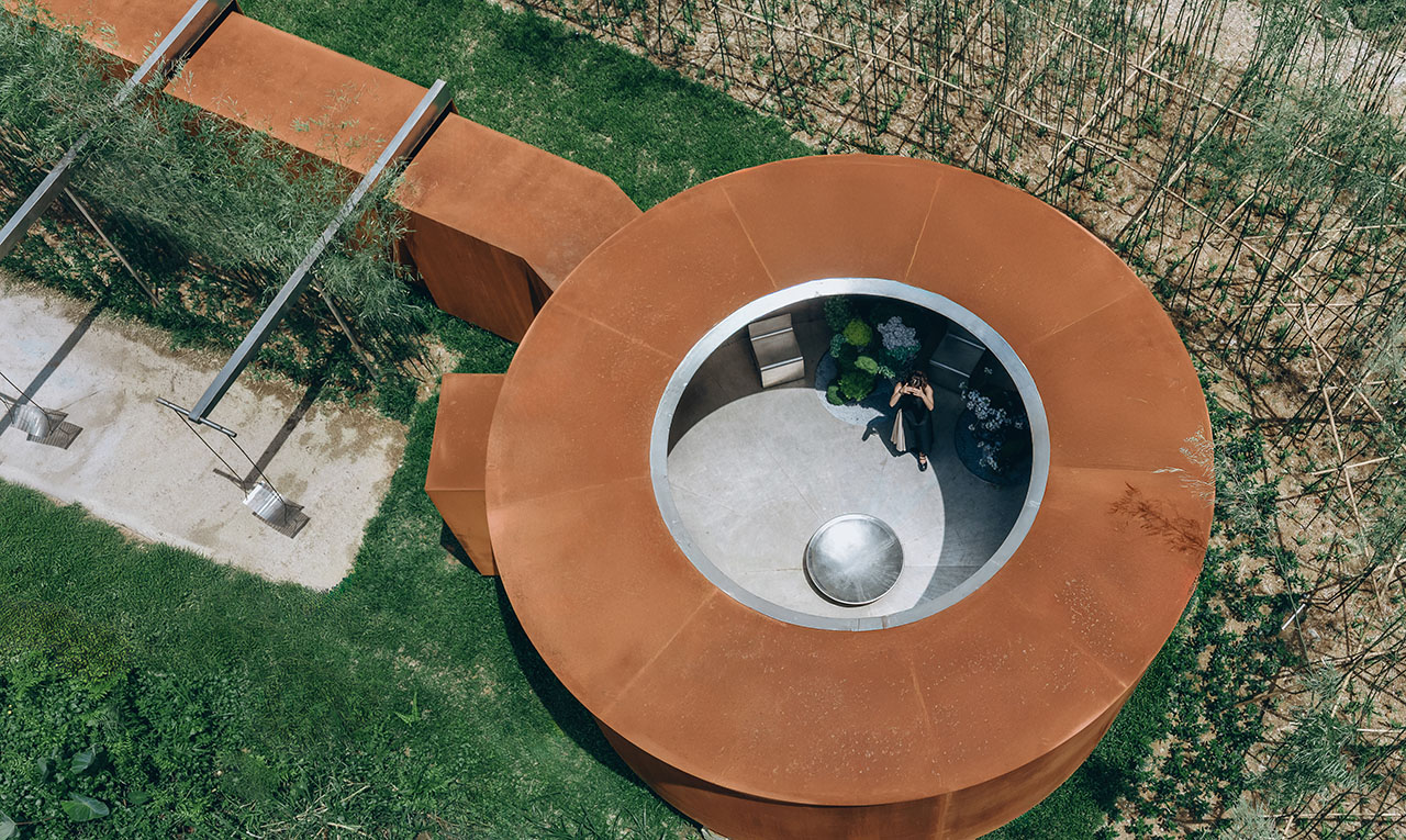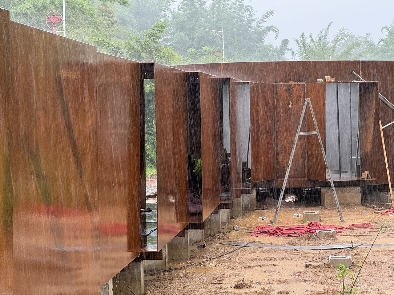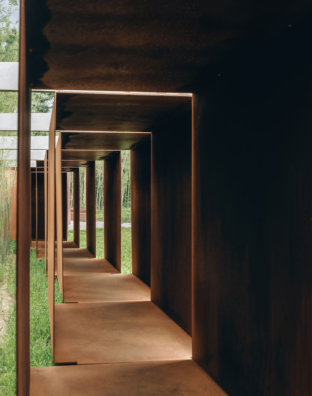 建筑主体采用锈蚀耐候钢板构筑,高2.1米、宽1.2米的狭窄箱体平行错位排列,串联成通廊,侧向预留出轻度变形的余地。出于高效且彻底解决场地排水的考量,地基之上,一公分厚的钢板作为支撑构件,将箱体抬升,从而使建筑与自然地面之间脱开一定的缝隙。而线性建筑体量再不能把大地一分为二——雨水穿过房子下方沿自然地势进入河道,植被也终于连成一片。