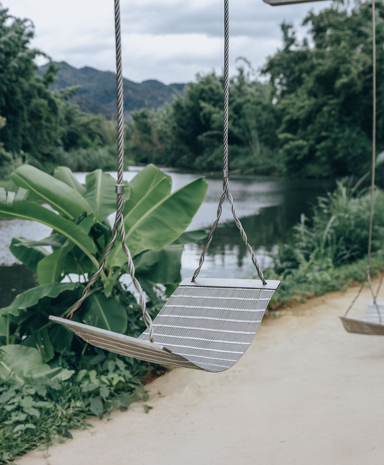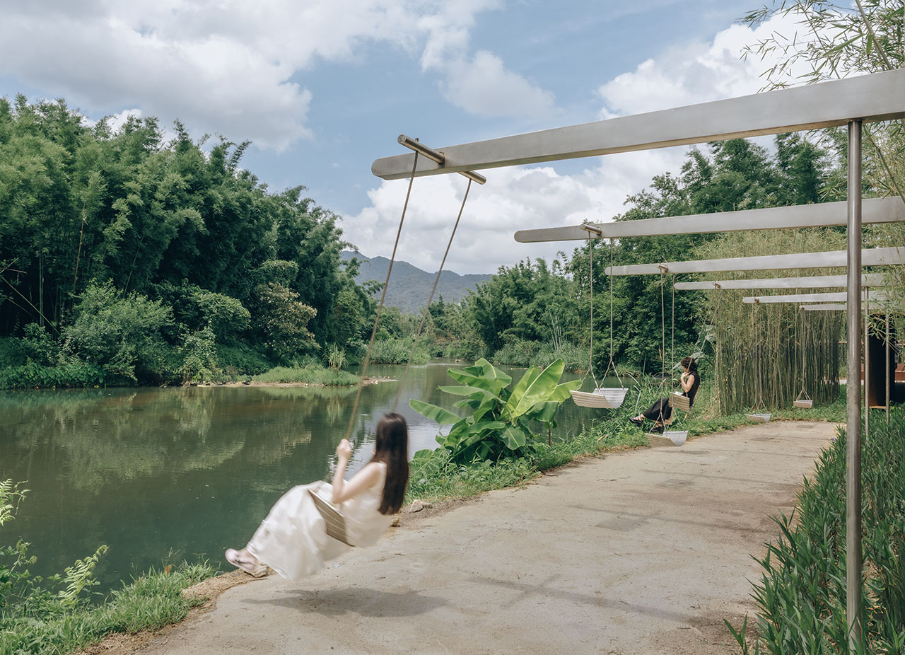 年过六旬的苏轼抵达儋州,离昔日繁华越来越远,亦在反复贬谪的命蹇时乖中转化出苦中作乐的豁然。游人的游览路径也随着苏轼的人生转折,向花厅的另一出口转出。空间从收束到豁开,箱体不断加深的锈迹与颜色在此处戛然而止。来到河边,临水秋千一字排开,银色不锈钢编织网的秋千座椅摆荡,人随秋千愈贴近水面,竟越生出抵抗幽暗的勇气。此刻回望背后与之对应的通廊箱体,方才通廊里关于摇摆的困顿竟恍然顿悟——箱体正随秋千晃荡拉扯而颠簸。洞悉彼时全貌,顿觉释怀,终是与苏轼一同生出“一蓑烟雨任平生”的超脱旷达。而箱子外,游人与村民交织于此,嬉水、出神或垂纶,景色大敞,风水人,都肆意。