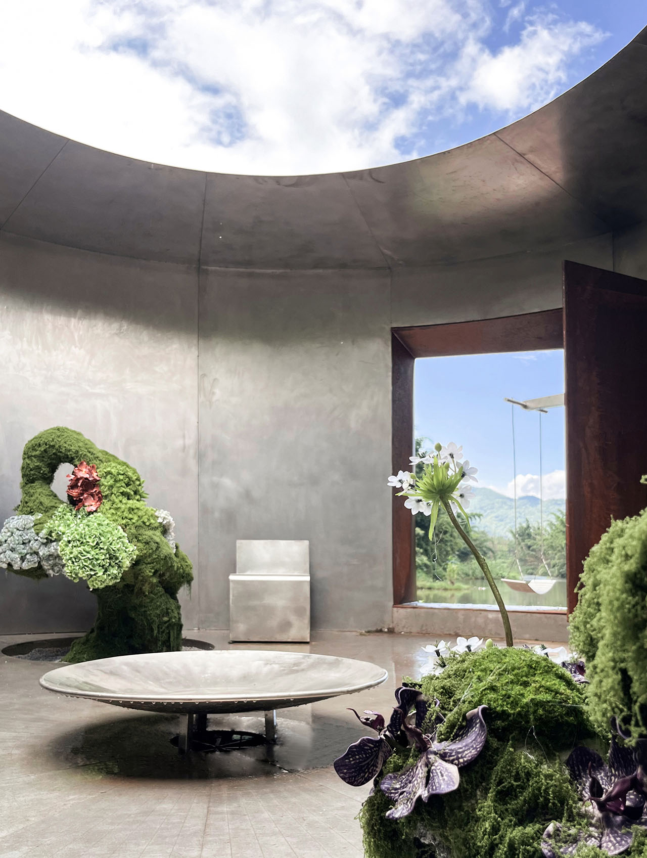 苏轼在惠州的微茫飘渺中觅得寄情山水的豁达,游人亦穿过车水马龙与汩汩河水的声音,幽长通廊尽头光源绚烂。花厅中,艺术家陈卓的观景石意象花艺作品沿圆形空间弧形排列,被乱纹不锈钢板漫射出五彩的花色,迷幻璀璨。花厅顶部中央设置圆形开口,垂直引导视线,使其聚拢于竹林围绕的限定天穹。此时,体验在此转折:游人落座于花阵之间,自然的愉悦从箱体的摇摆与压制中解放,明亮取代幽暗,环抱驱散压抑,宁静抚平喧嚣,视觉重新成为感知这方天地的向导。一切感受都在花厅之中倒转,游人便足以在此停留片刻,安坐一隅,闲适悠然。