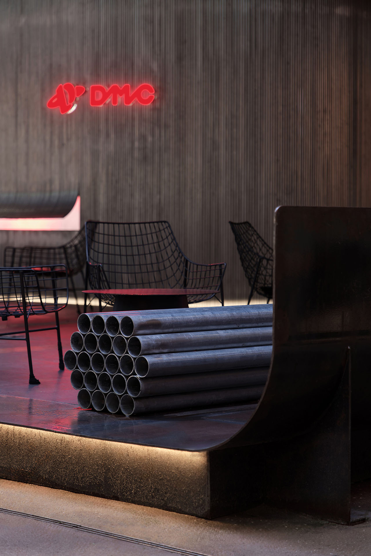 锈铁地板随时间自然氧化,呈现“时间的肌理”;粗大的镀锌管则被捆扎成座椅,以原始质感回应空间中的精致,野性与秩序在此对话。