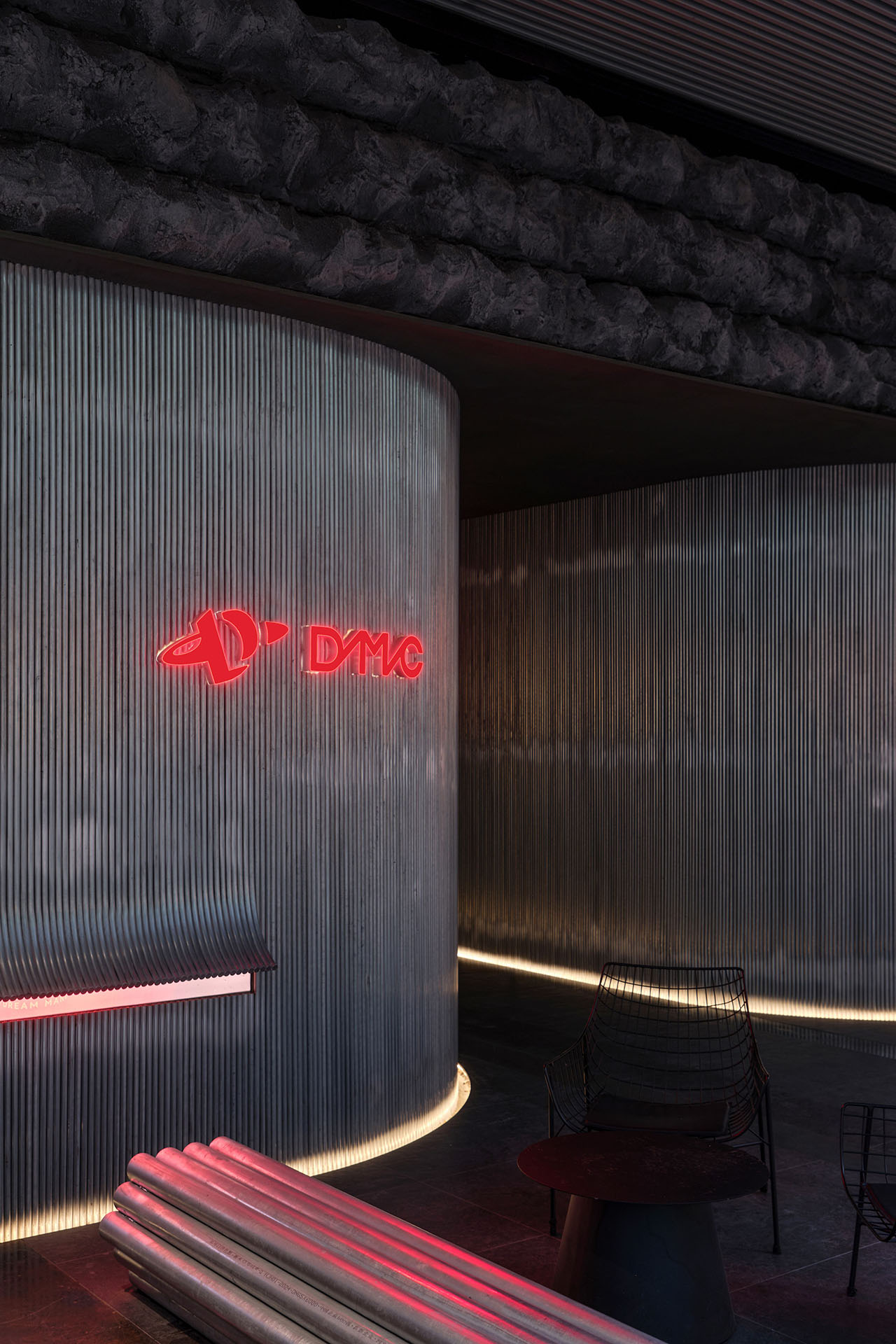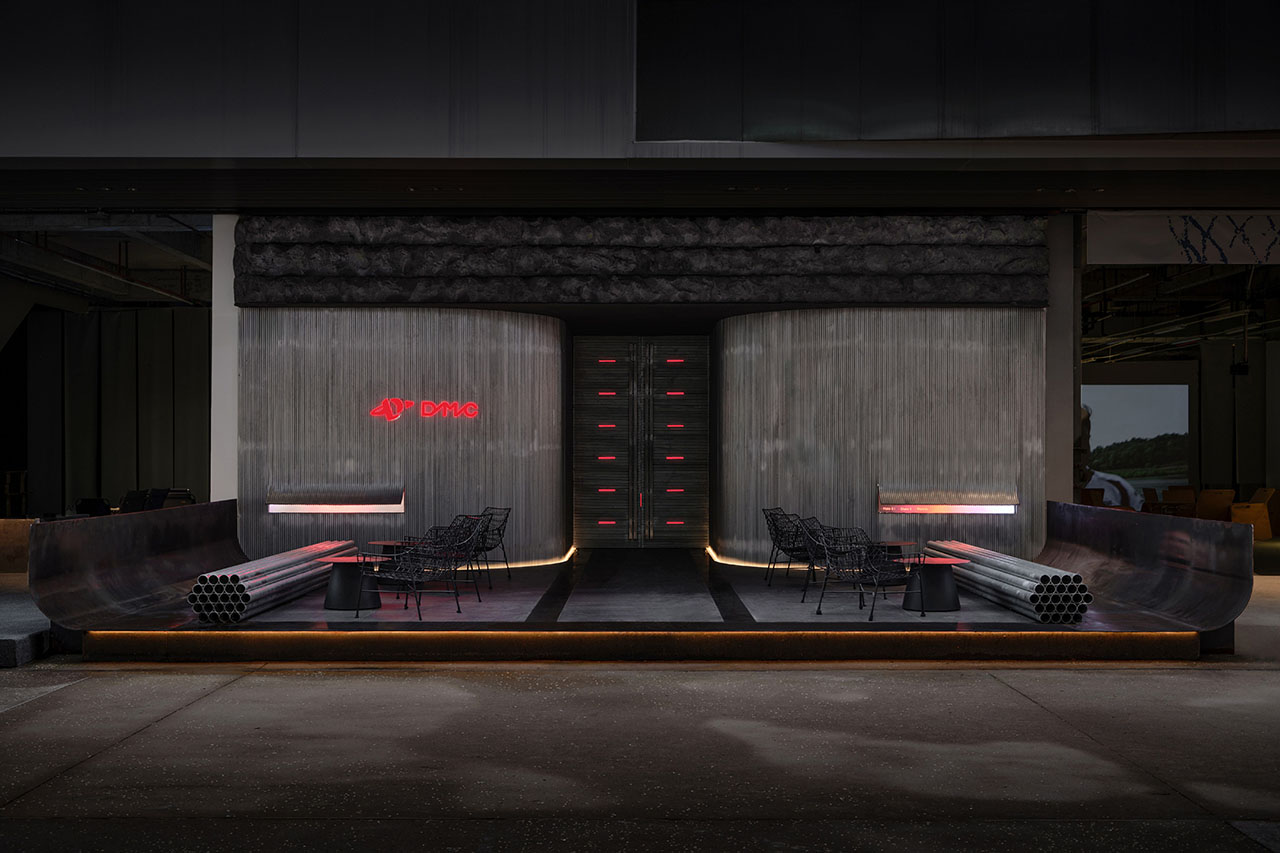 梦境和现实应该如何区分?在某种认知中,梦境与现实其实只间隔了一层薄薄的屏障。它可能像镜子一样,也可能就像一层屏障,轻轻即可掀开。门扉与立面延续了同样的材质逻辑,进入DMC的瞬间,即进入了梦境制造公司为你呈现的梦中宇宙。金属翻折的表皮被“揭开”,内部 LED 屏幕显露,数字影像与品牌标语闪烁其中,注入虚拟梦境的气息。
