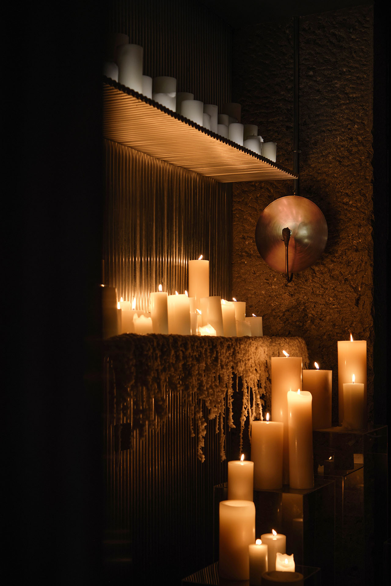 包厢区域由入口处延续而来的镀锌管旋转围合而成,形态恰似白羊座的符号。在秩序中营造安静与独立,成为梦境旅程中的“内向星云”。备餐台上层叠蜡烛以光影书写时间。摇曳的火焰与蜡泪流淌,在粗粝水泥与冷峻金属对比中呈现静谧而永恒的氛围。